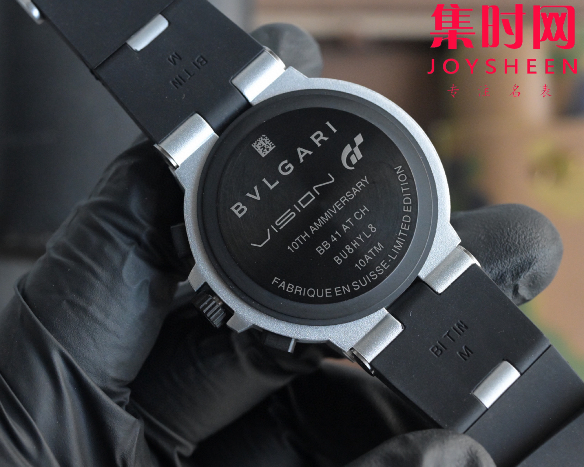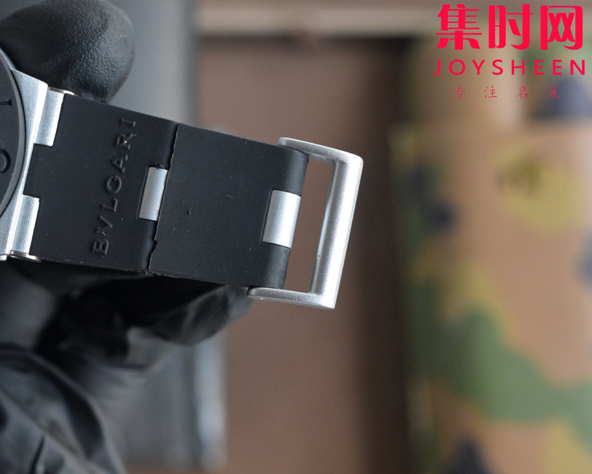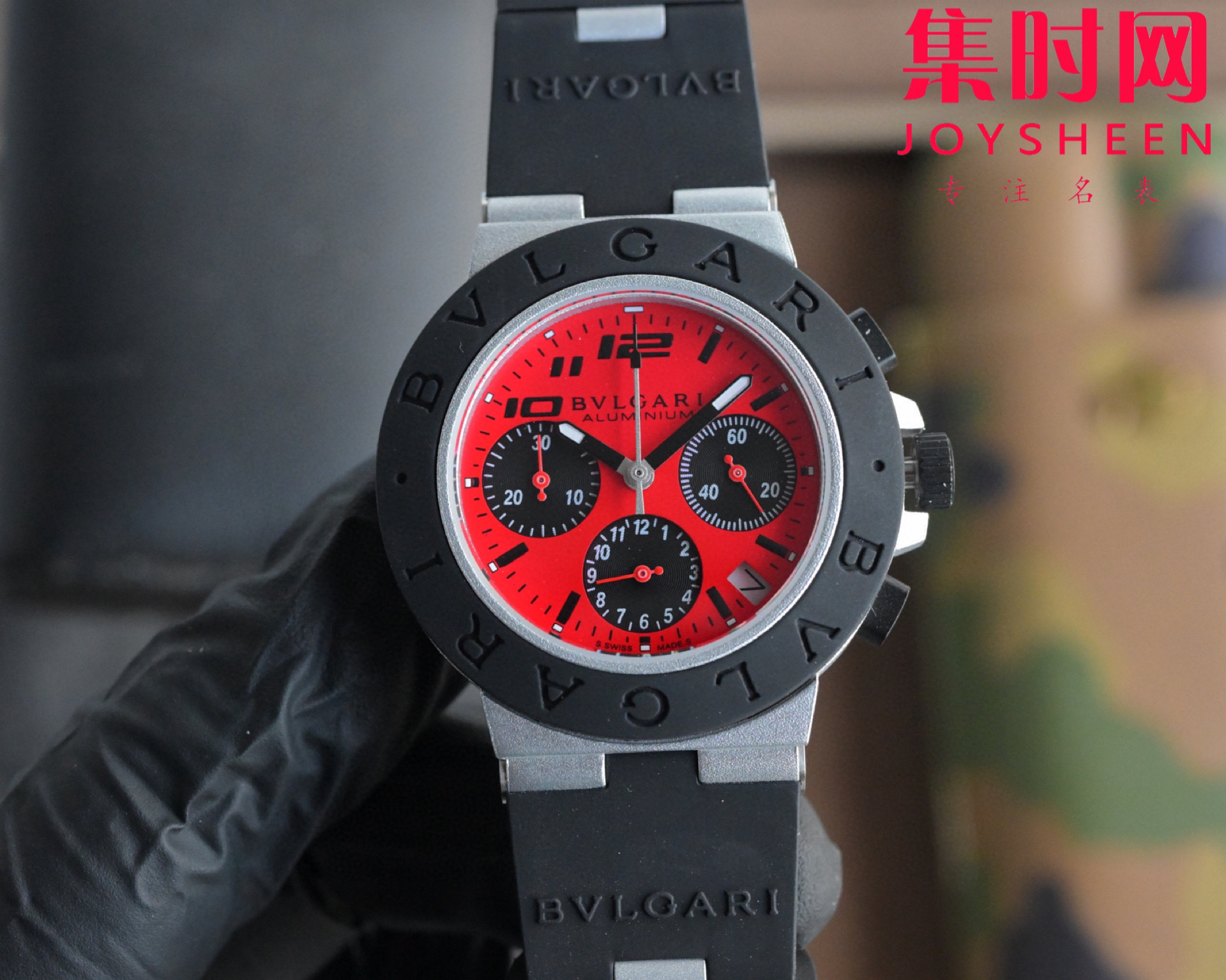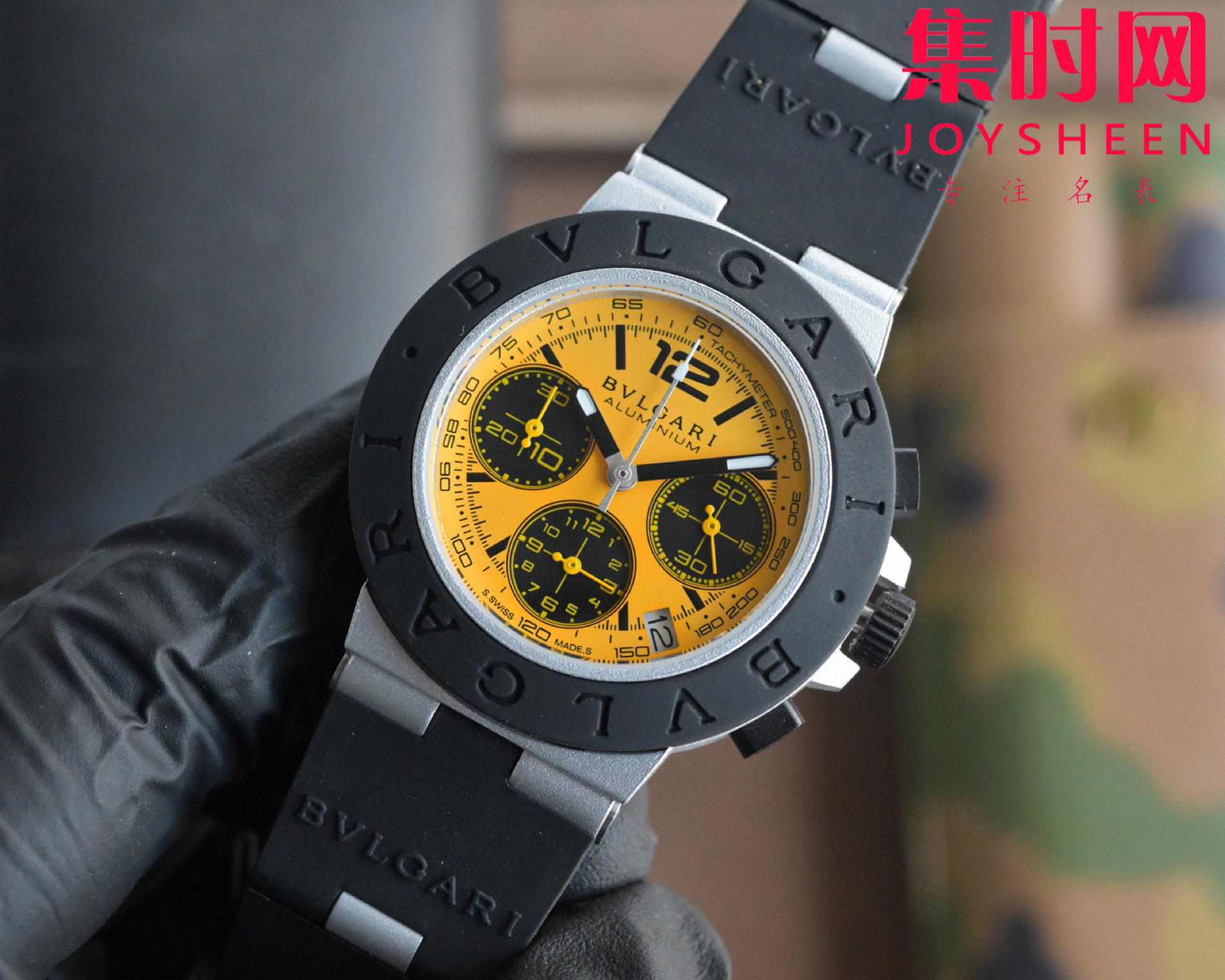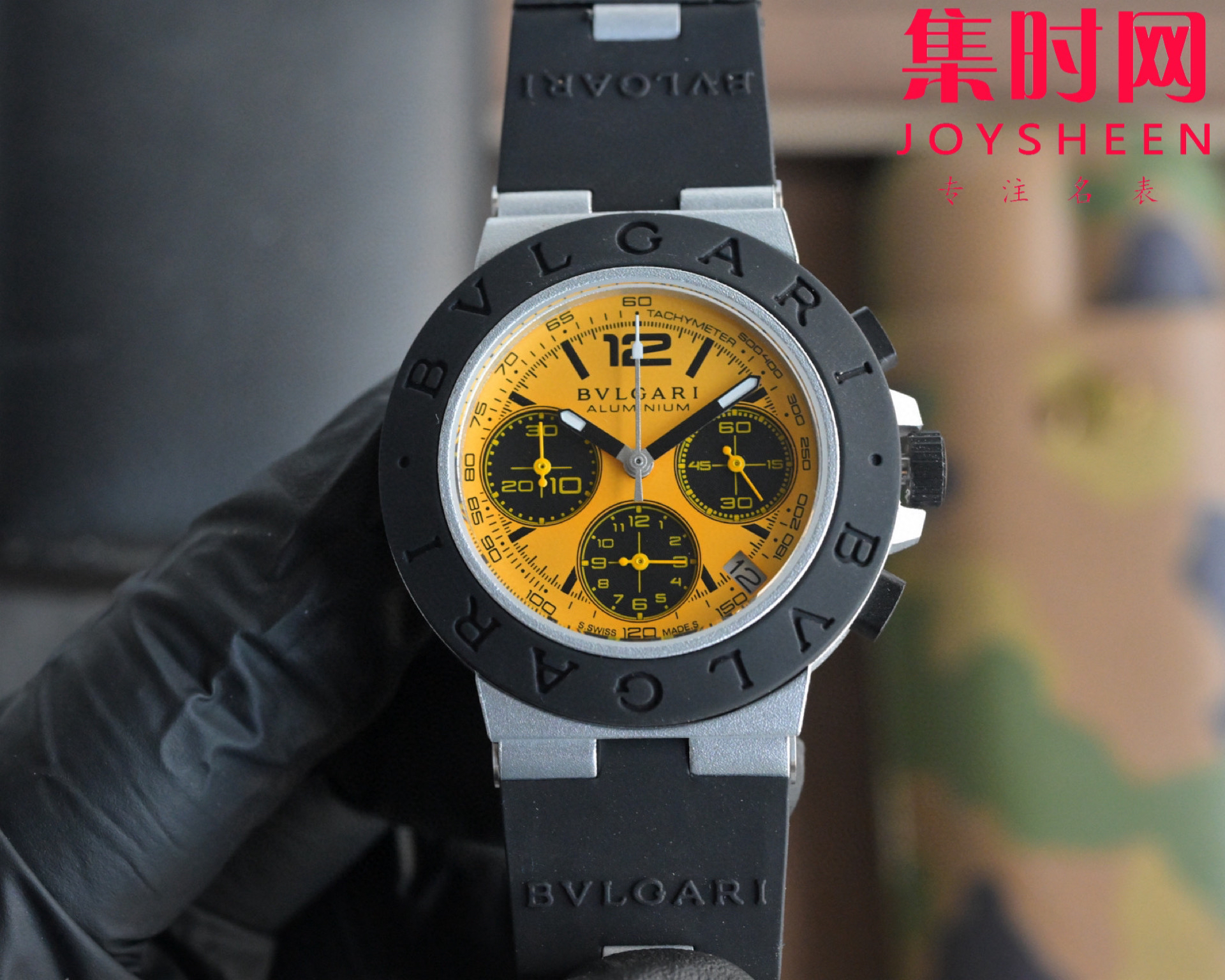 搭载进口VK计时石英机芯,表帶采用麾术貼,适配日常、休闲等多元场景。表壳为哑光喷砂铝合金(轻盈耐用),表圈与表带采用FKM橡胶(抗汗耐磨),表背为DLC涂层钛金属(提升抗划性)。3/6/9点位设蜗形纹计时副盘,指针与刻度覆有Super-LumiNova夜光涂层,中央计时秒针尖端饰红色细节,4点半位置设日期视窗,藍宝石玻璃鏡片,防水100米。延续系列标志性的"BVLGARI BVLGARI"表圈设计,兼具意式优雅与运动质感,是宝格丽创新材质与经典设计结合的代表作品之一,兼具佩戴实用性与收藏辨识度。