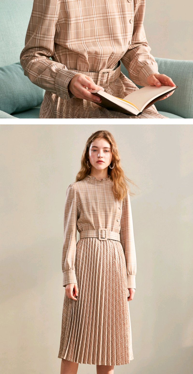 欧芮儿新品格子连衣裙女长袖气质收腰中长款A字百褶裙