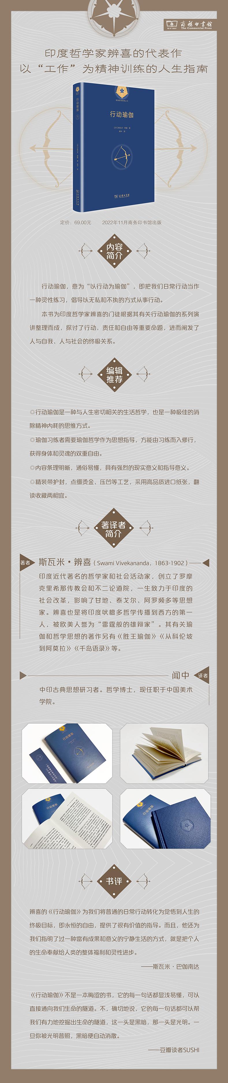 ★瑜伽哲学与瑜伽运动是体与用的关系,瑜伽习练者需要瑜伽哲学及其阐释作为指导,方能由表而及里,由习练而入修行,从而摆脱身体与精神的双重束缚,获得恒久的自由、平静、喜乐。★行动瑜伽对于现代人来说,是一种与人生密切相关的生活哲学,也是一种不错的消除精神内耗的思维方式。只要把我们日常的行动当作一种灵性练习,不带私心也不执着于任何结果,最终便会达到“用雄健的身姿涉世、以宁静的心灵超世”的境界。★本书脱胎自辨喜的演讲,内容条理明晰,通俗易懂,历久弥新,贴合当下实际,具有很强的指导意义。★装帧设计独运匠心,精装带护封,点缀烫金、压凹工艺,采用高品质进口纸张,翻读收藏两相宜。