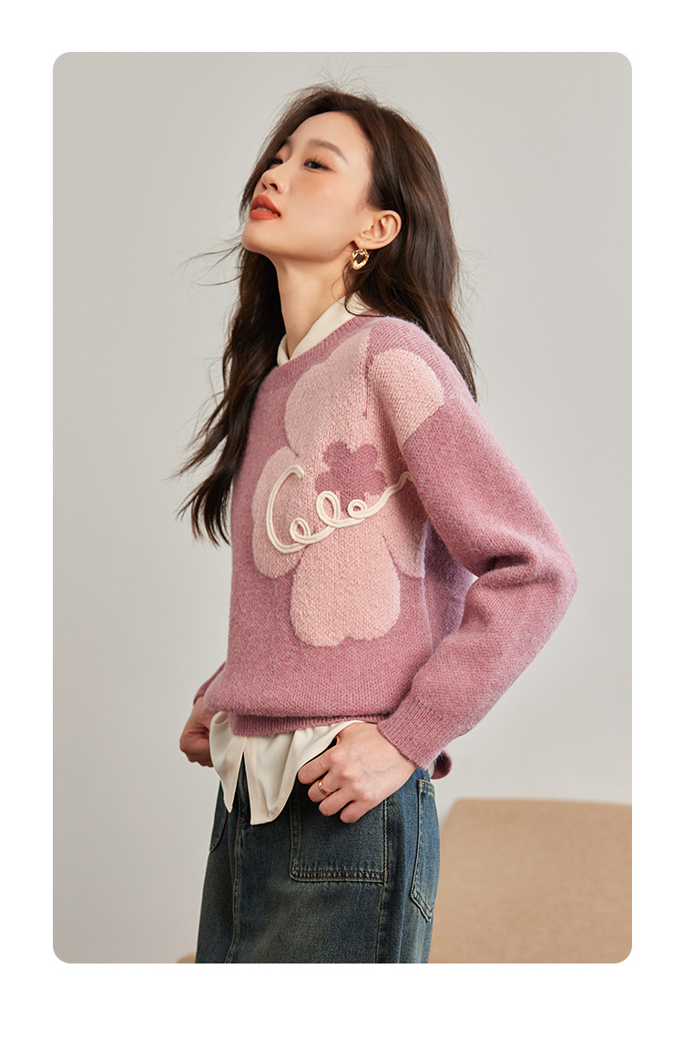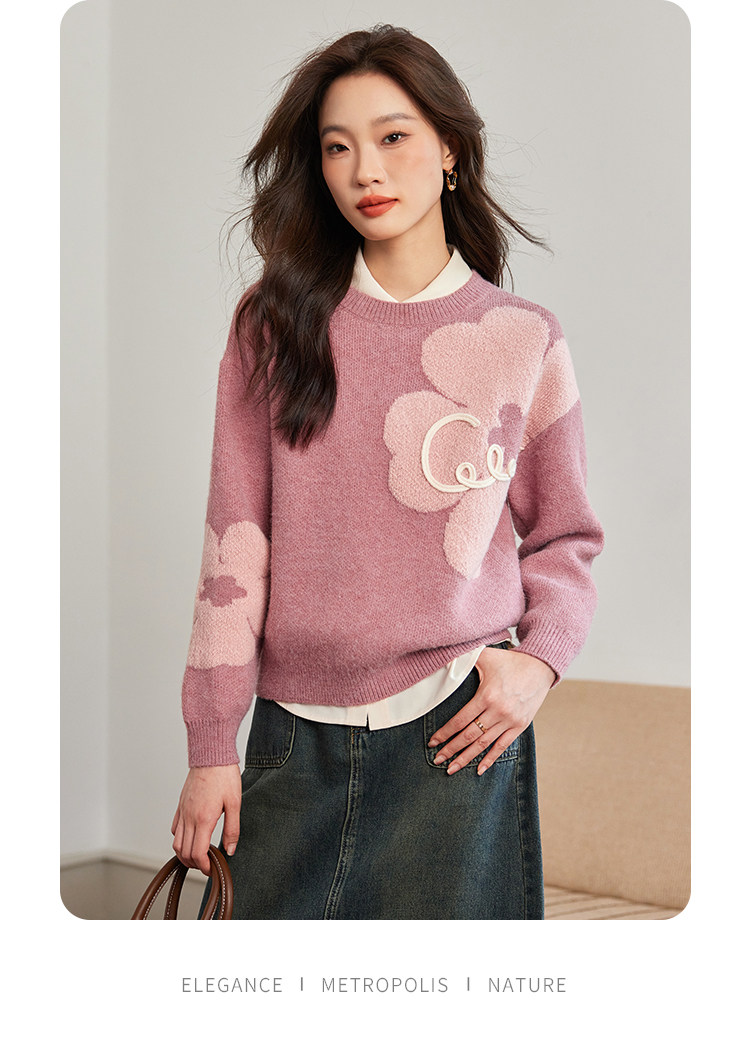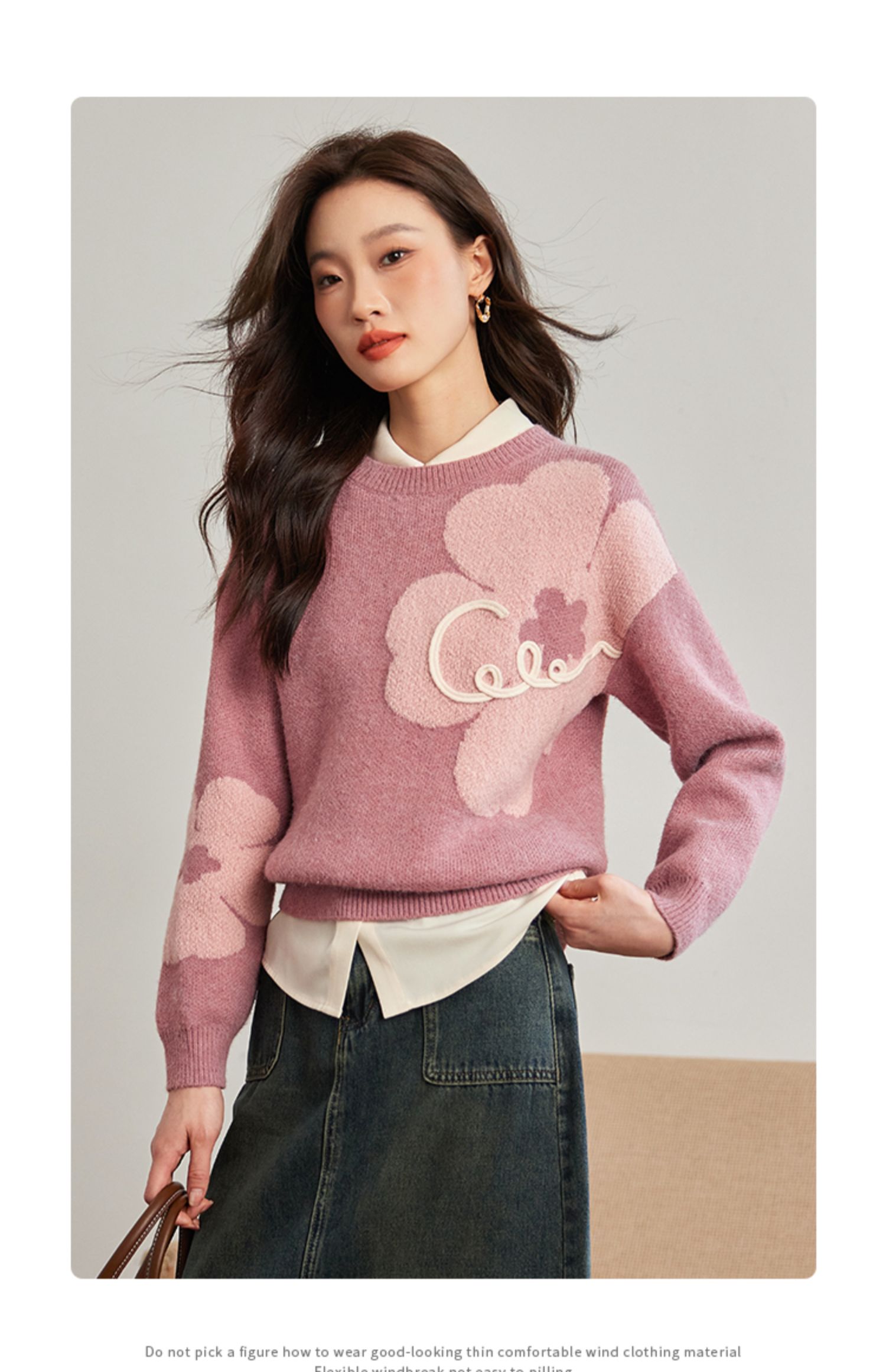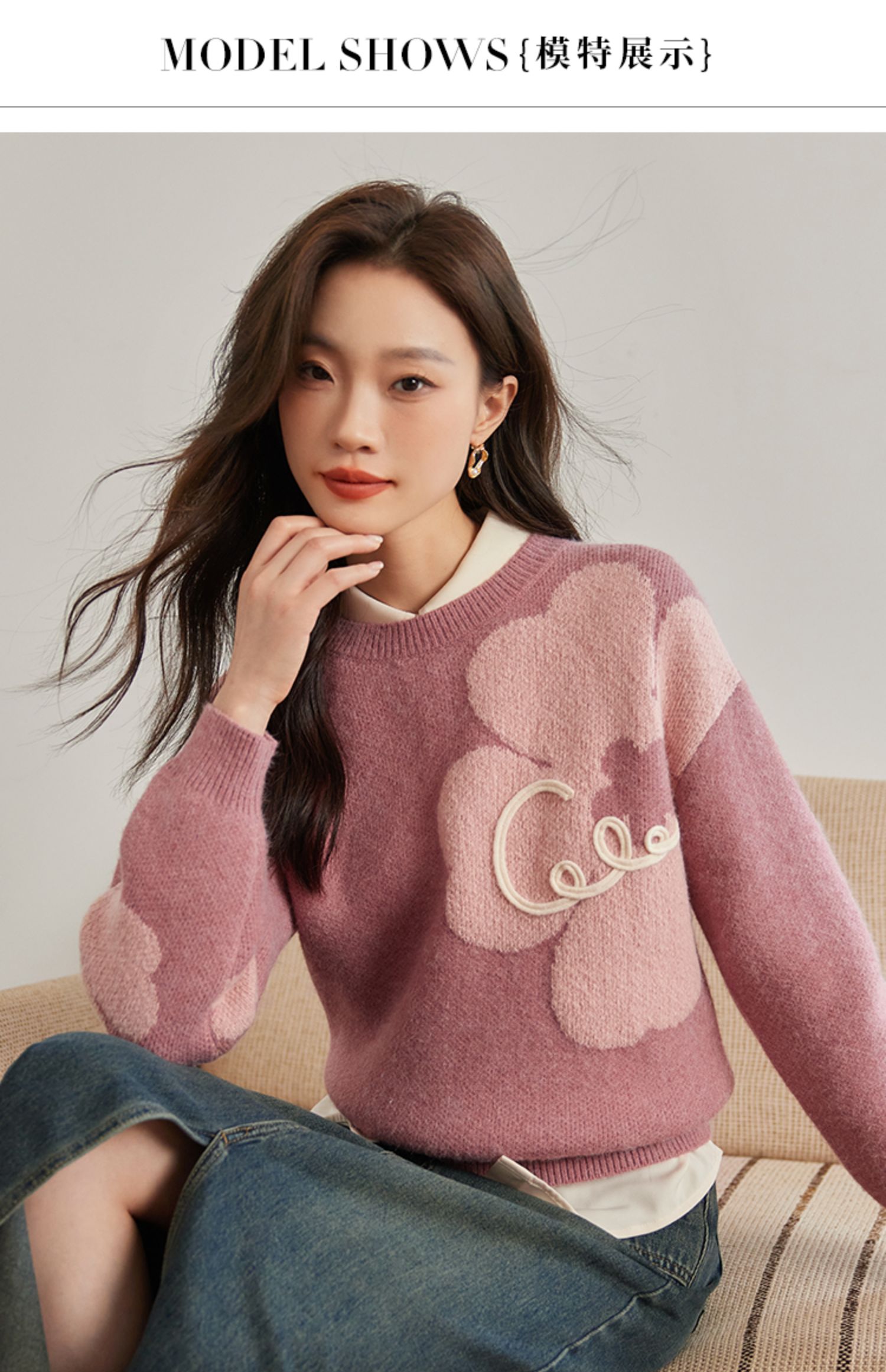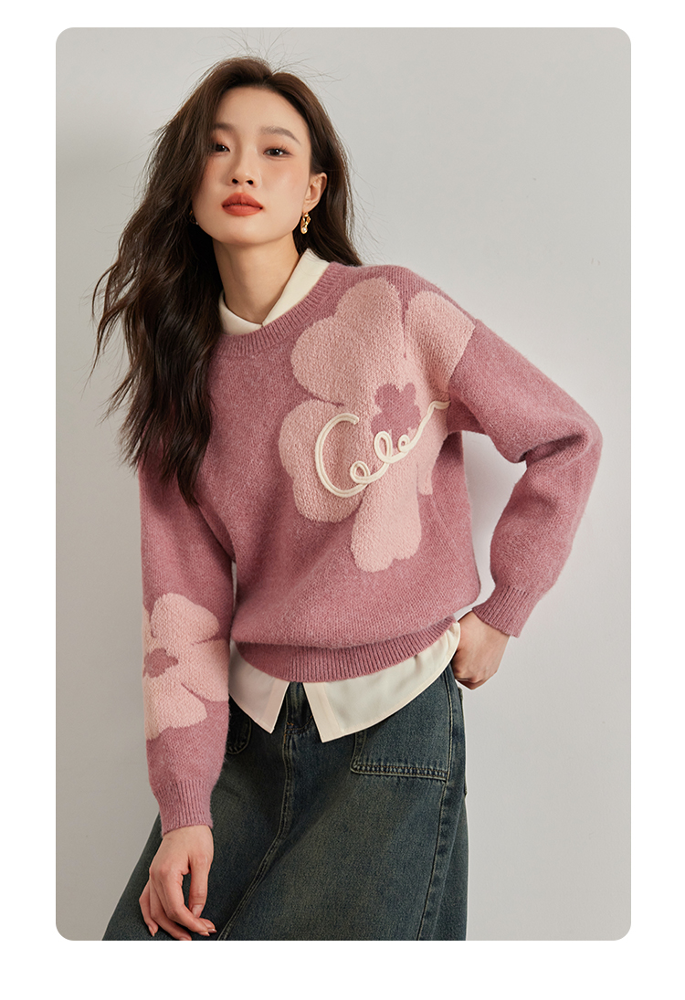 【129选3件,不退换】熙世界粉色花朵软糯毛衣女慵懒风2025秋冬新款超好看套头针织衫