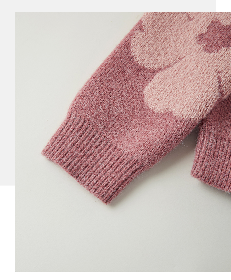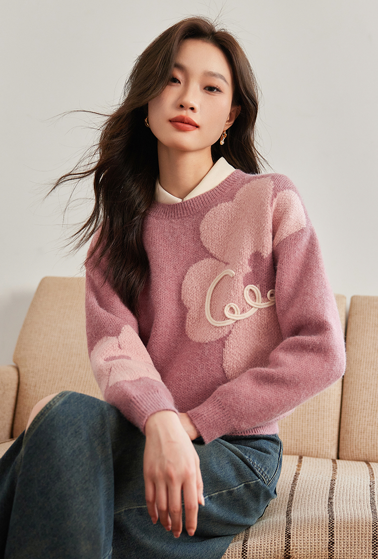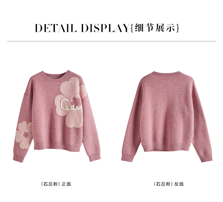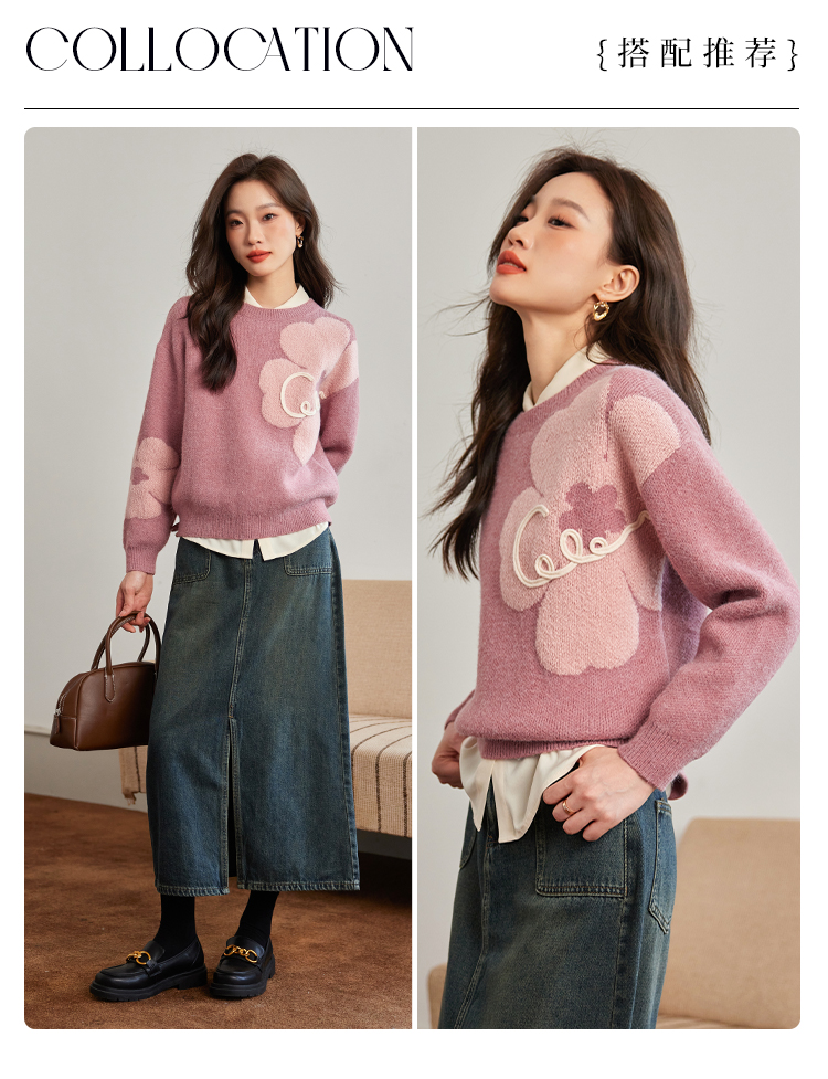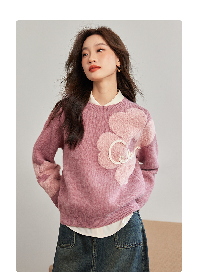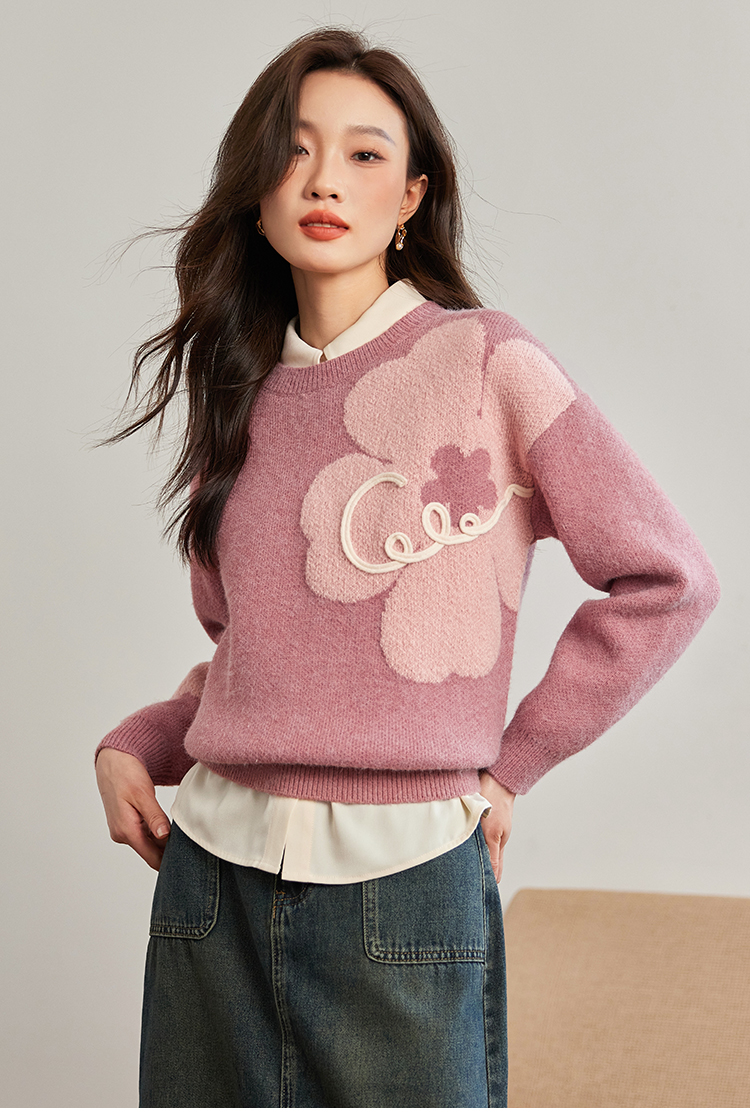 【129选3件,不退换】熙世界粉色花朵软糯毛衣女慵懒风2025秋冬新款超好看套头针织衫