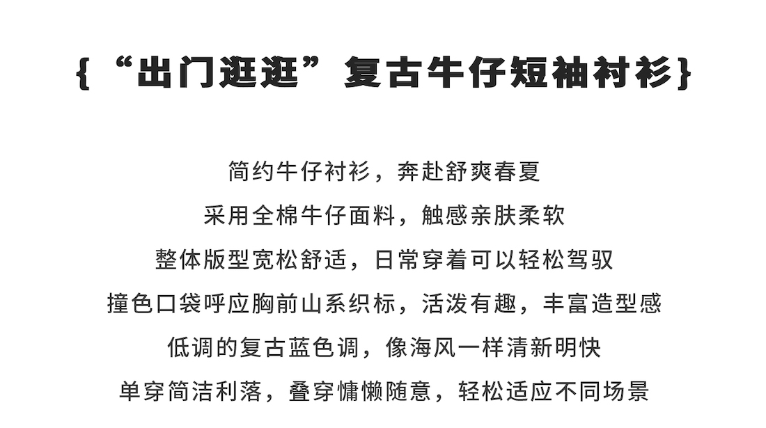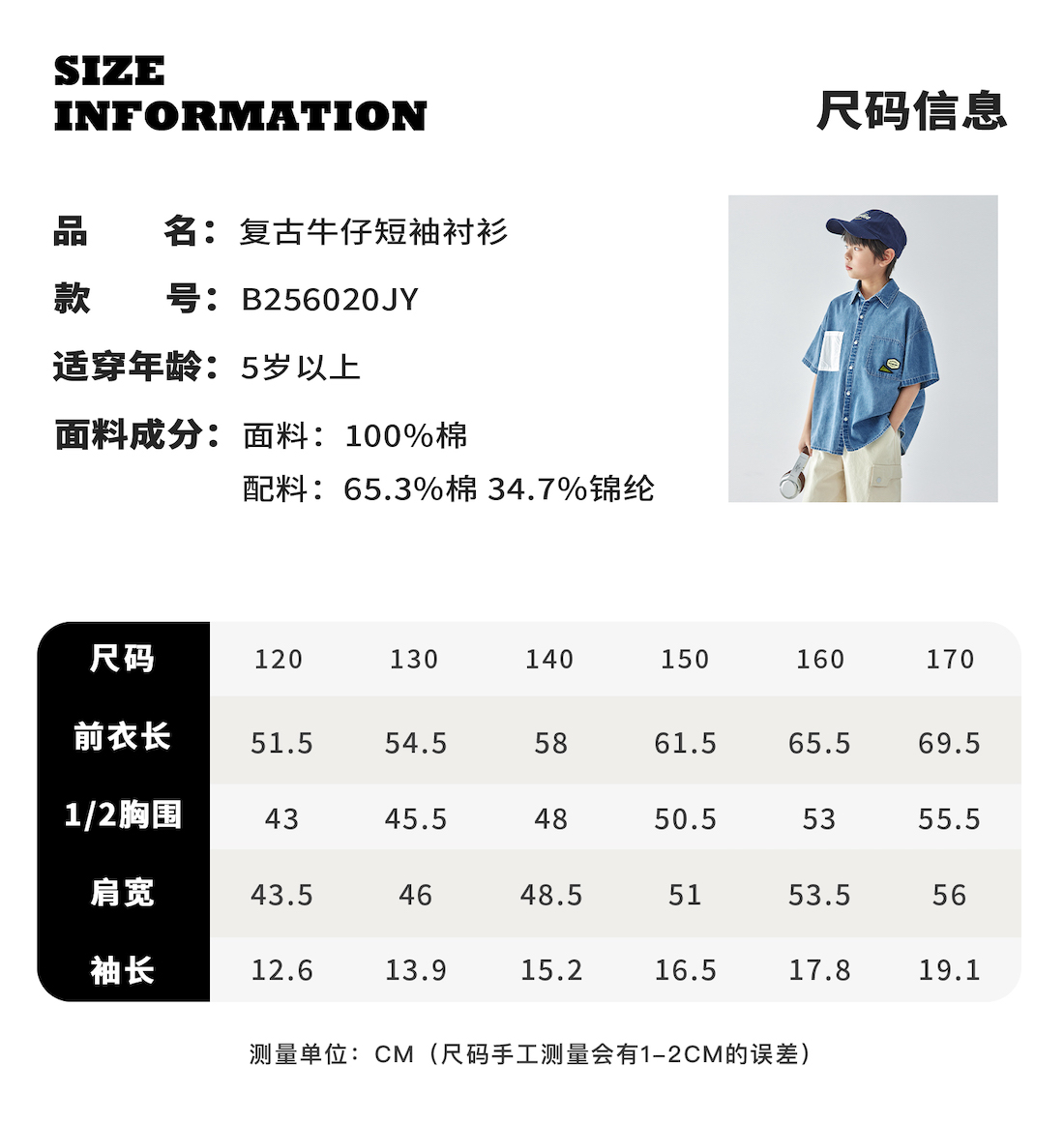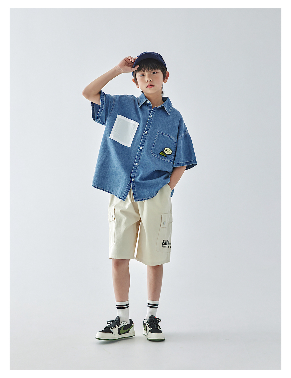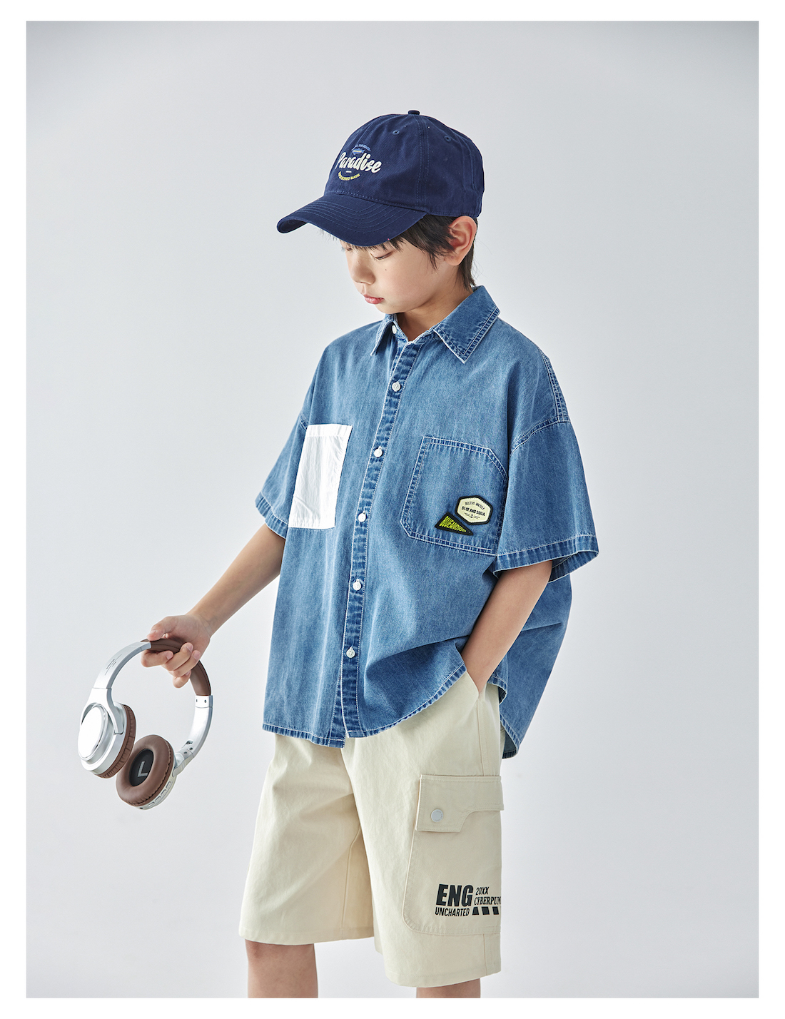 【代发】男童复古牛仔短袖衬衫 蓝汽水春夏复古全棉撞色口袋山系慵懒风亲子上衣蓝色