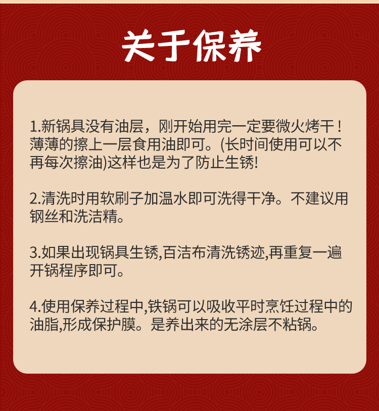 购买小贴士: 发货地:山东 售后问题: 1、产品有质量或其它问题请在签收48小时之内上报客服,快递面单+产品图片+视频反馈给售后客服处理。 2、支持7天无理由退换货,退货商品需未试用不影响二次销售,原包装寄回,非质量问题退货运费由客户自理。 温馨提示: 1、养锅小技巧:每次使用完毕要擦干或烘干。 2、铁锅不要放洗碗机洗,会容易生锈。 3、平底炒锅可用于电磁炉。 4、开锅服务:收到的锅都是开好锅的。 5、新锅注意养护,用完锅后,洗干净,小火烘干或者擦干,擦油养护更利于养锅。 |