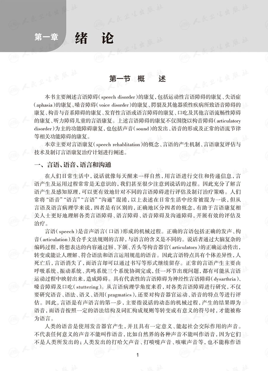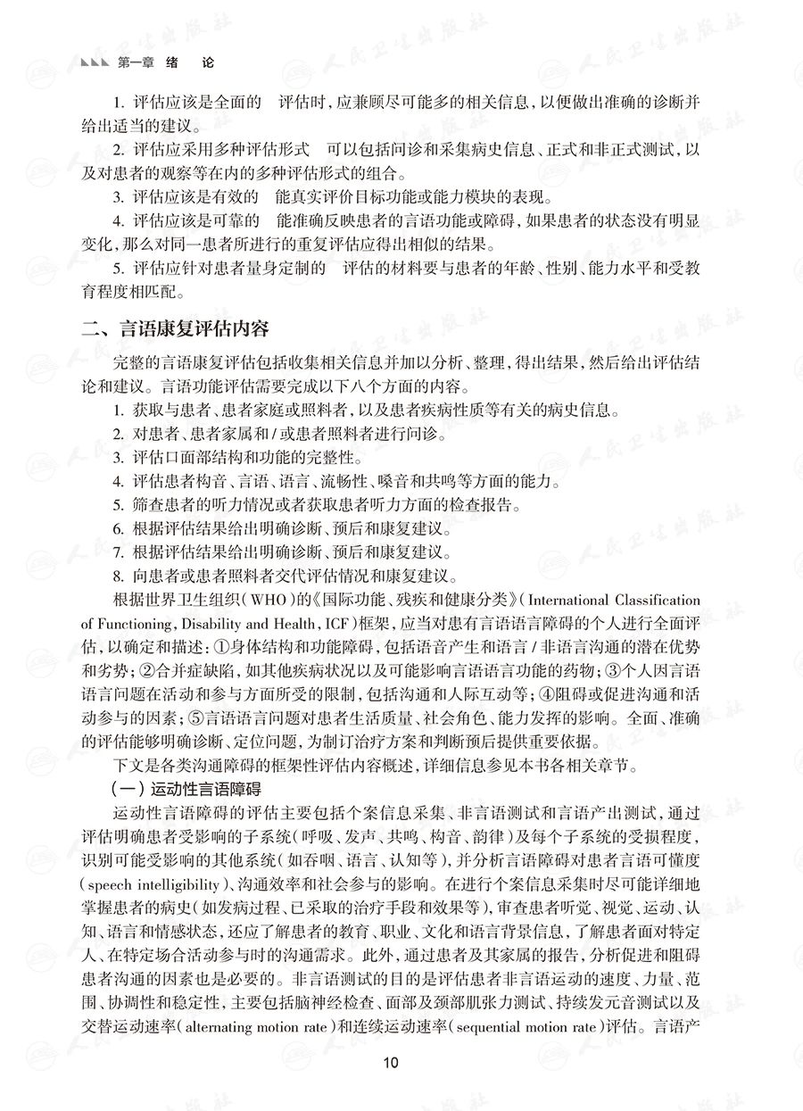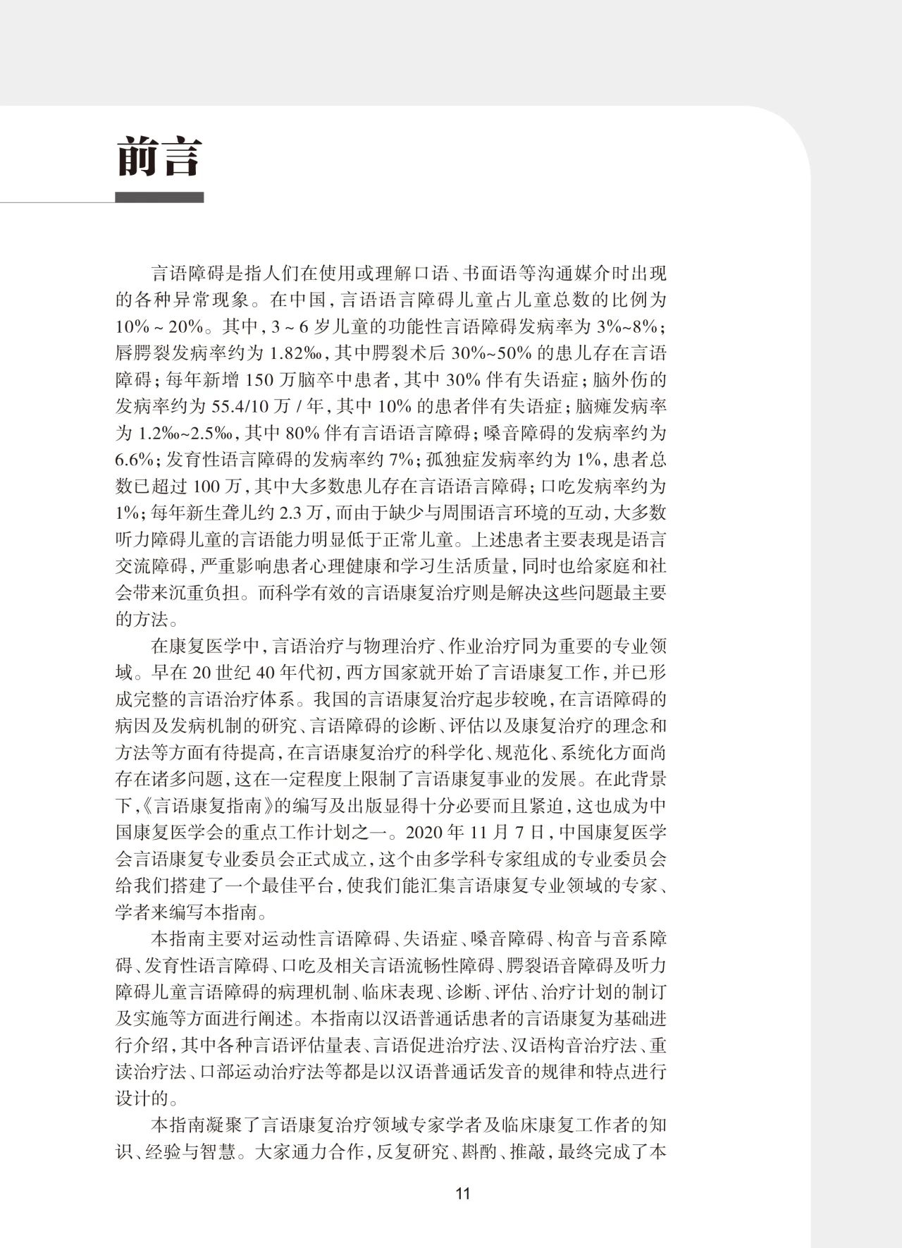 本指南汇集了言语康复治疗领域的专家学者及临床康复工作者的知识、经验与智慧,参考大量国内外文献,借鉴了广大言语康复专业人员长期的临床实践经验编写而成。主要对运动性言语障碍、失语症、嗓音障碍、构音音系障碍、发育性语言障碍、口吃及其它言语流畅性障碍、腭裂儿童言语障碍及听力障碍儿童言语障碍的病理机制、临床表现、诊断、评估、治疗计划的制订及实施等方面进行阐述。