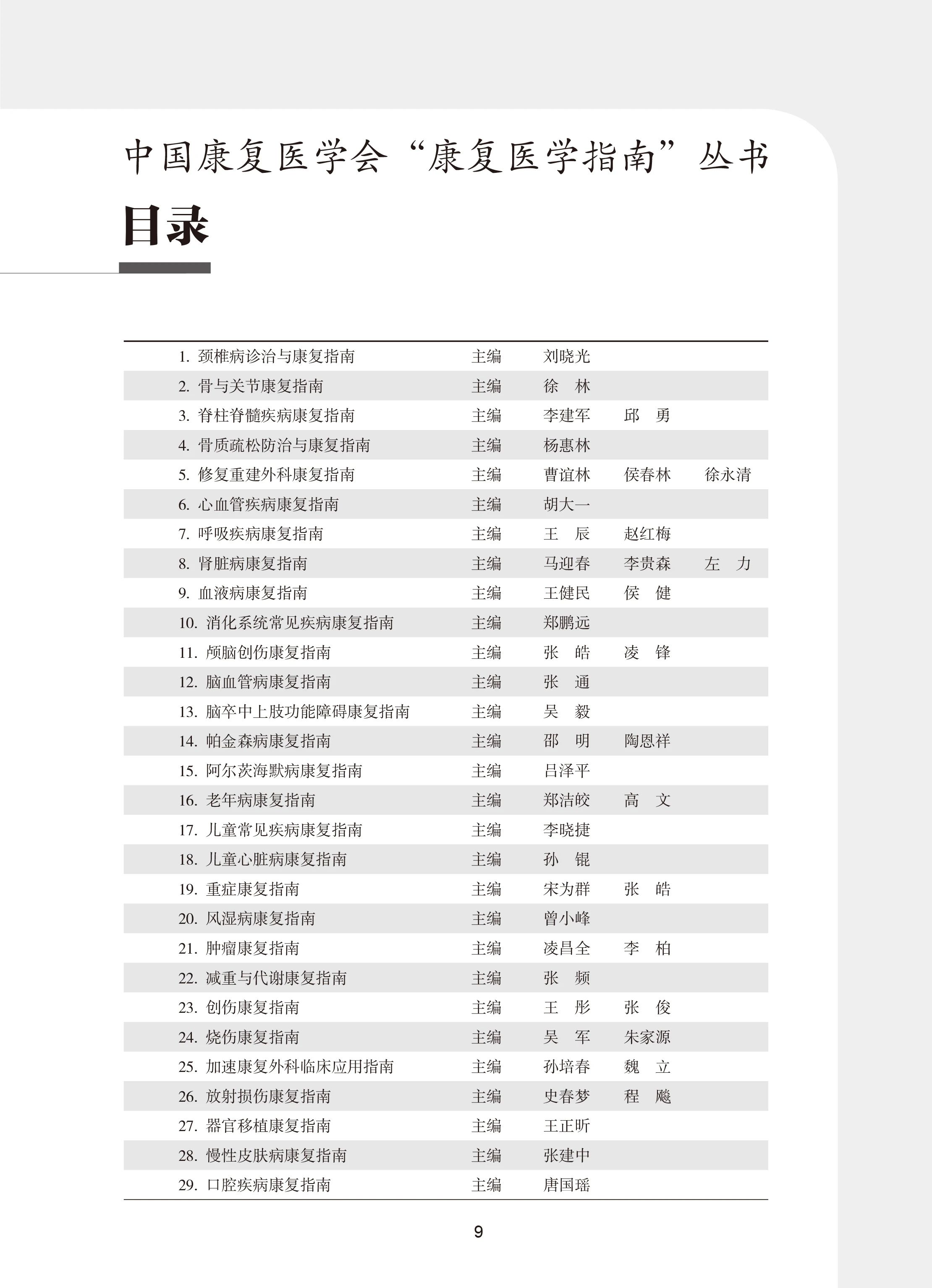 《指南》丛书编写工作举学会全体之力。中国康复医学会设总编委会负总责,各专业委员会设专科编委会,各专业委员会主任委员为各专科《指南》主编,全面负责本专科《指南》编写工作。遵循大健康大康复理念,以服务人民群众健康为目的,以满足广大康复医学工作者需求为指向,以康复医学科技创新为主线,以康复医学技术方法为重点,以康复医学服务规范为准则,以康复循证医学为依据,坚持中、西结合并重,既体现当今现代康复医学发展水平,又体现中国传统技术特色。