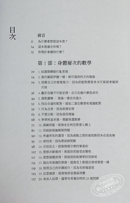 很少有東西像數學一樣美麗又迷人,道破人生,對人生目標的追求來說如此重要。然而,我們在學校裡的數學教學結果並不圓滿,也沒能讓成年人對探索數學奇事發生興趣。我們助長恐懼,而不是愛。這本書文筆簡練,讓數學朝氣蓬勃、容易理解,沒有妥協,但富有魅力、清楚明瞭、優雅風趣。這本書不僅所有學生都該擁有,成年人也應該人手一本。讀者不但會心存感謝,還會邊讀邊笑。——里昂・波特斯坦(Leon Botstein),開放社會大學網絡(OSUN)校長、巴德學院(Bard College)院長、美國交響樂團指揮