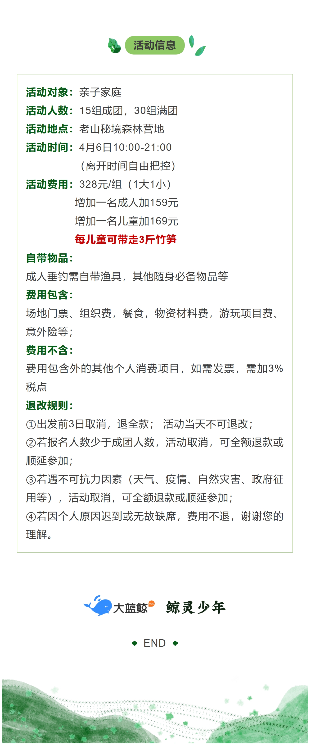 大蓝鲸爱研学【春假专享】嗨挖竹笋·溯溪捞鱼·森林烧烤·火锅煮茶·超多项目·一日亲子休闲·解锁全天畅玩!