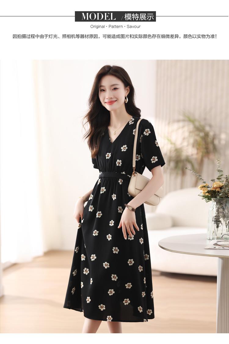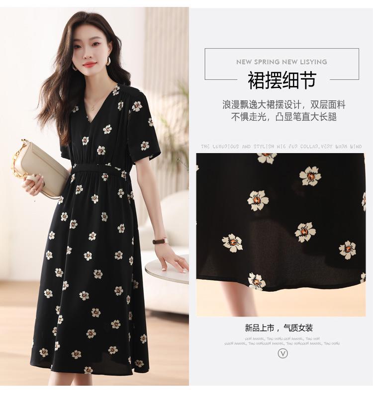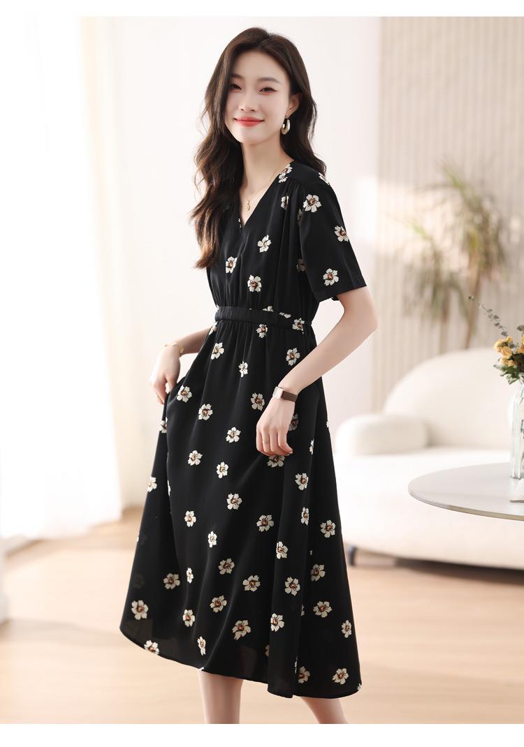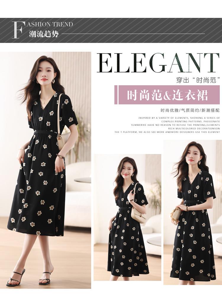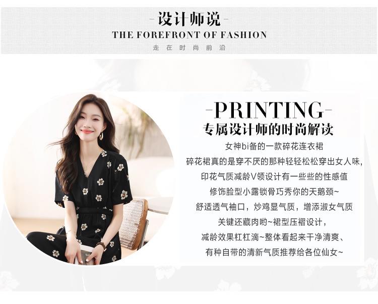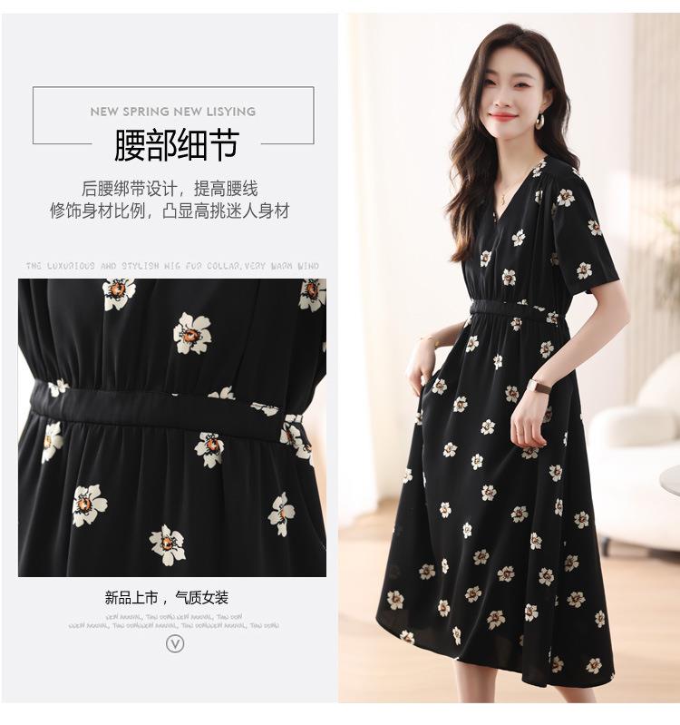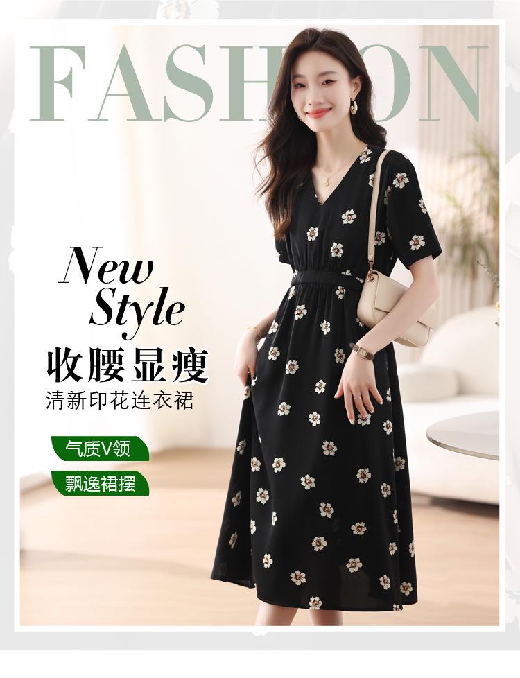 连衣裙女夏2024新款韩版过膝中长款系带收腰V领短袖气质印花裙子