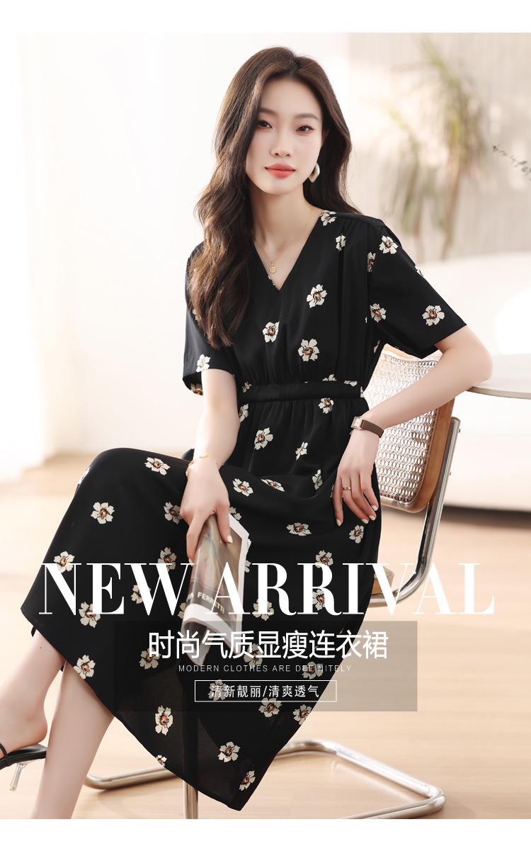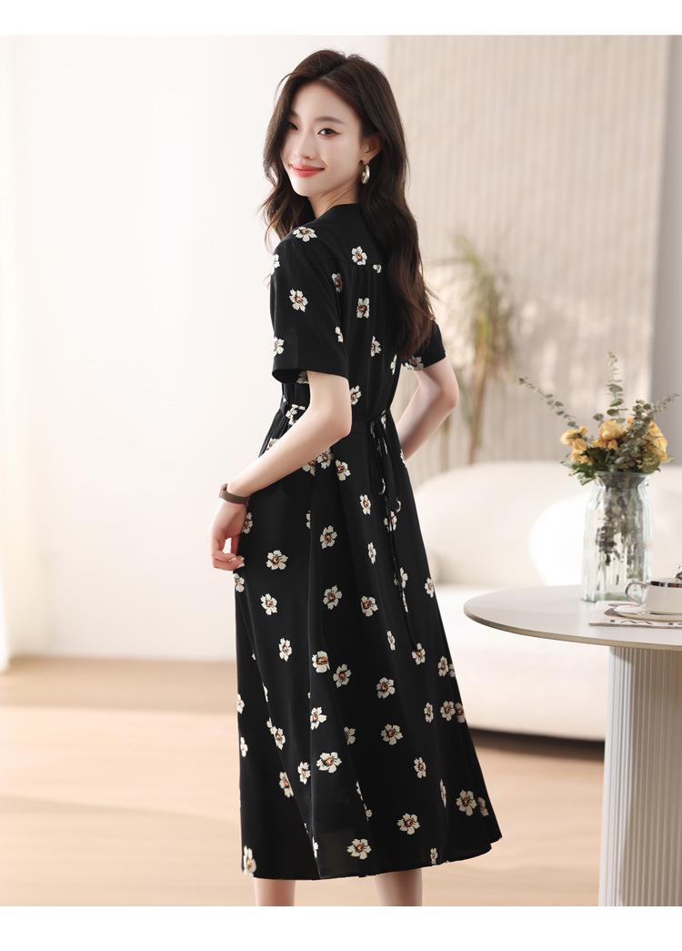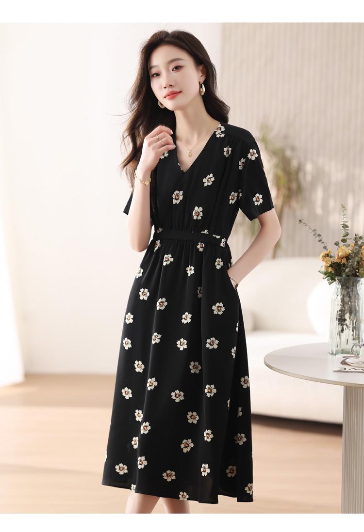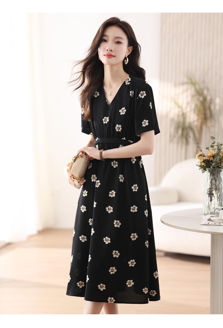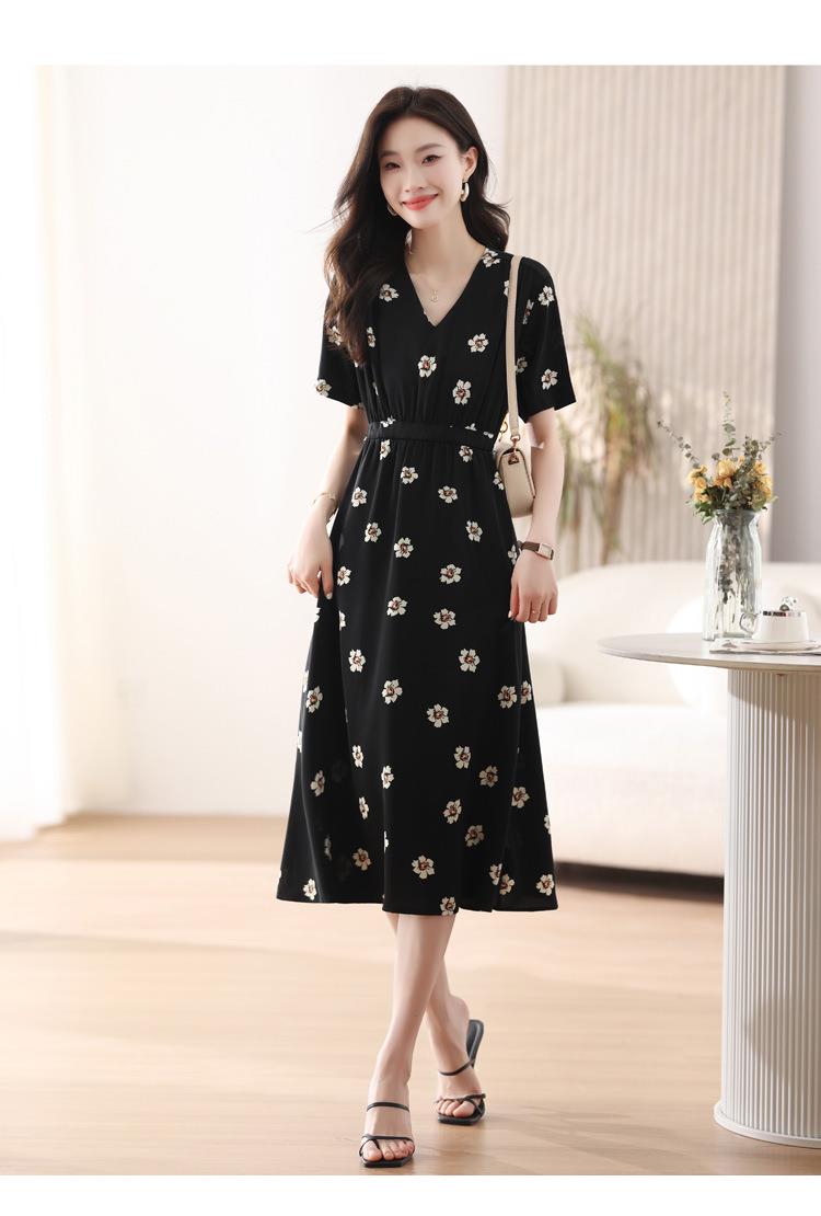 连衣裙女夏2024新款韩版过膝中长款系带收腰V领短袖气质印花裙子