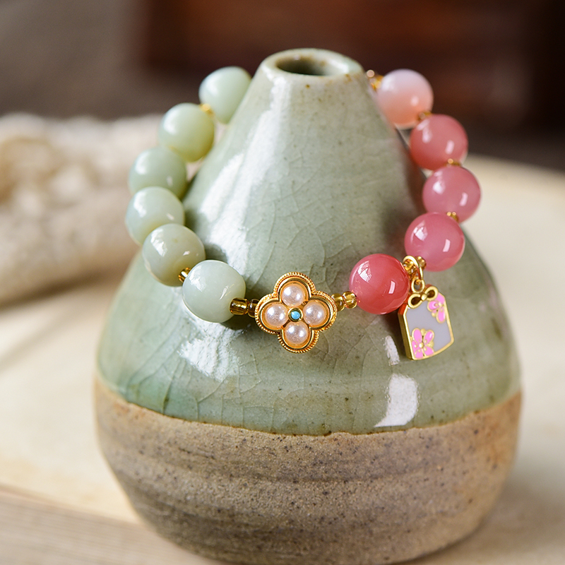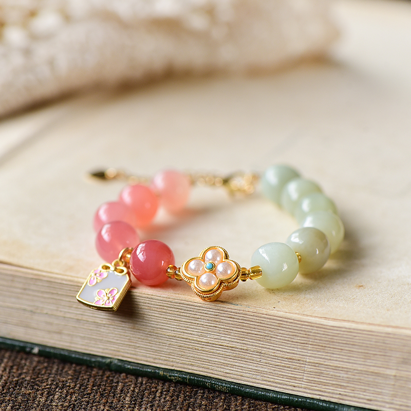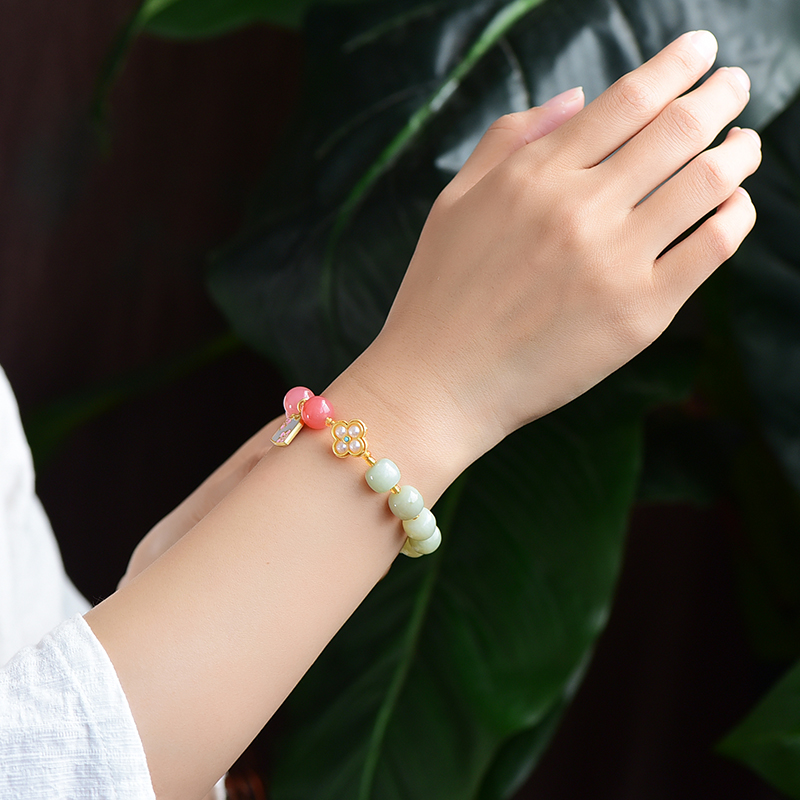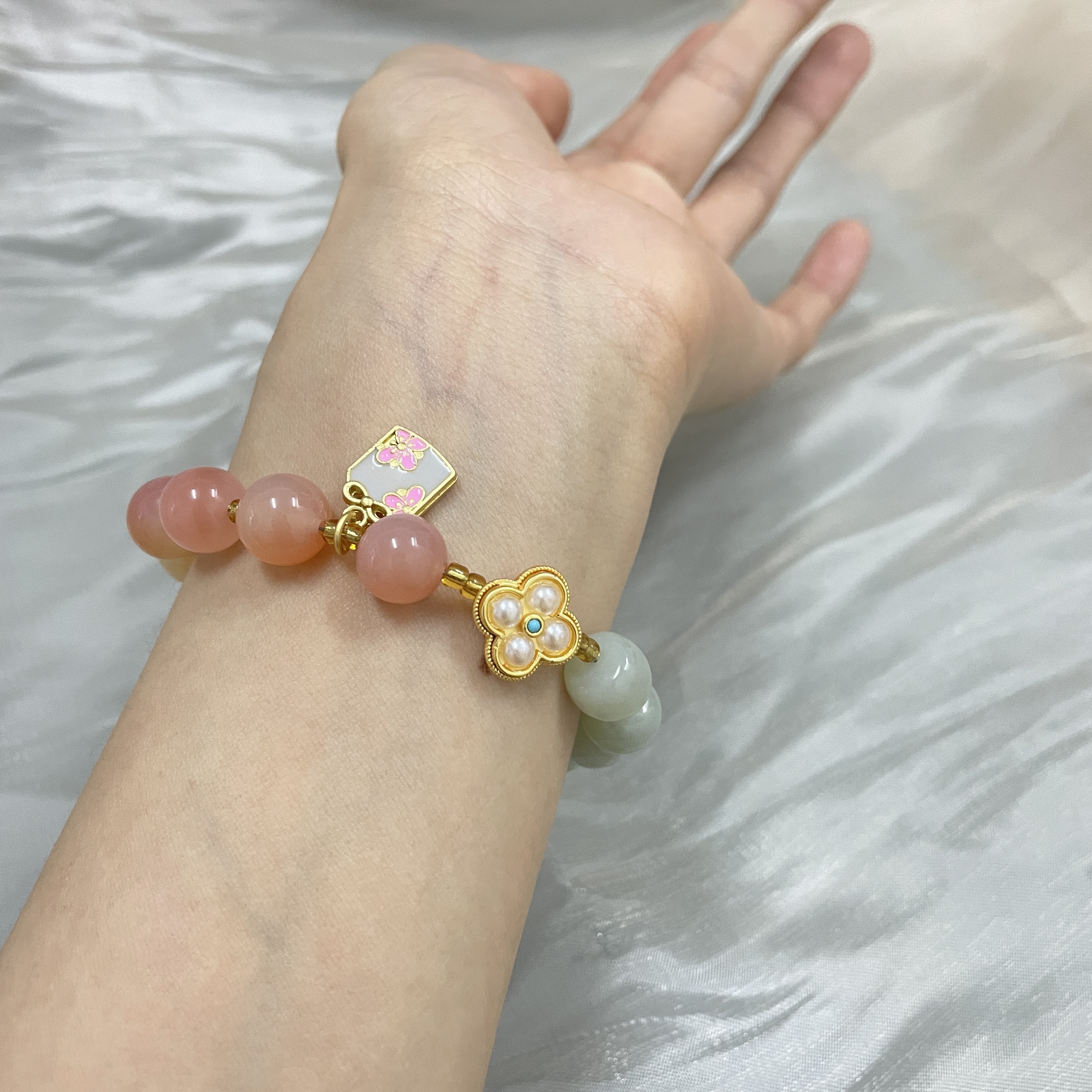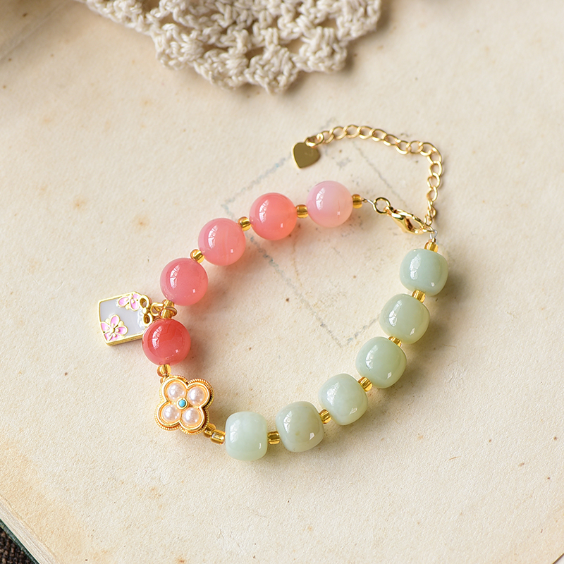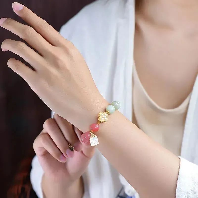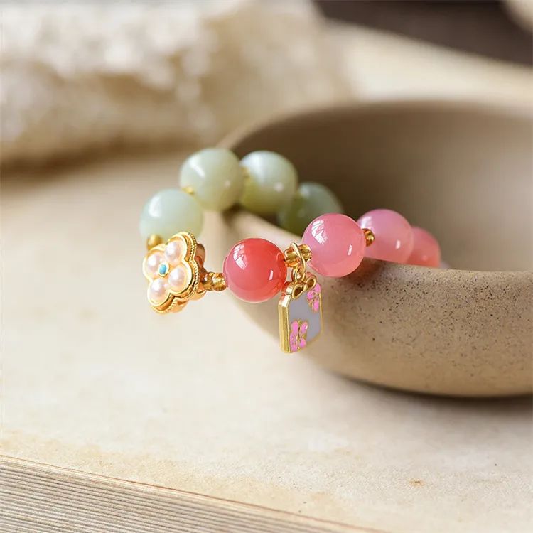 1:红色娇嫩鲜艳,绿色清爽怡人、黄色明媚亮眼,与各种蜜蜡、盐源玛瑙、珍珠的点缀相辅相成;撞色搭配,跳脱好看,戴于手腕,坠子随身姿摇曳摆动,趣味可爱