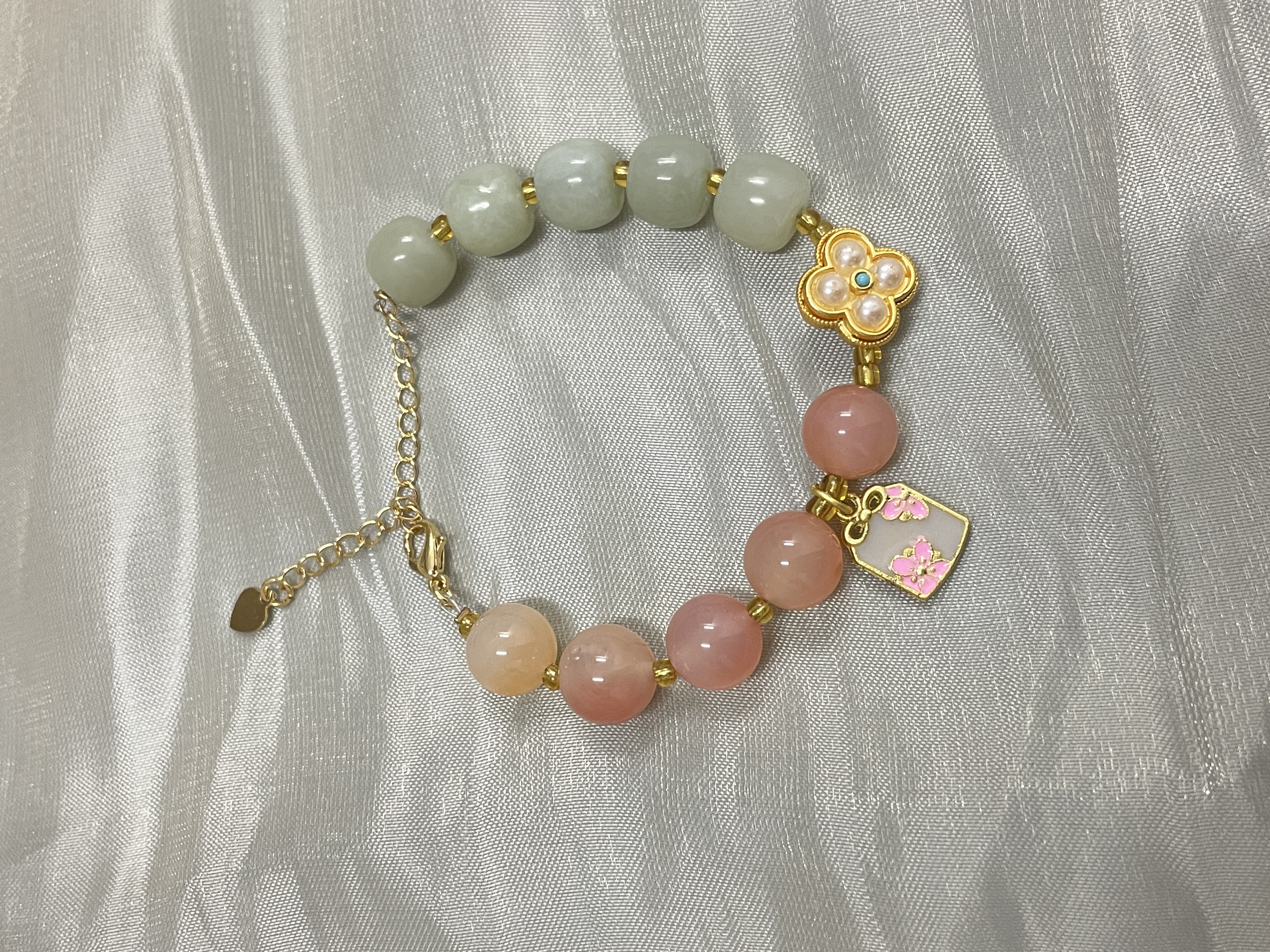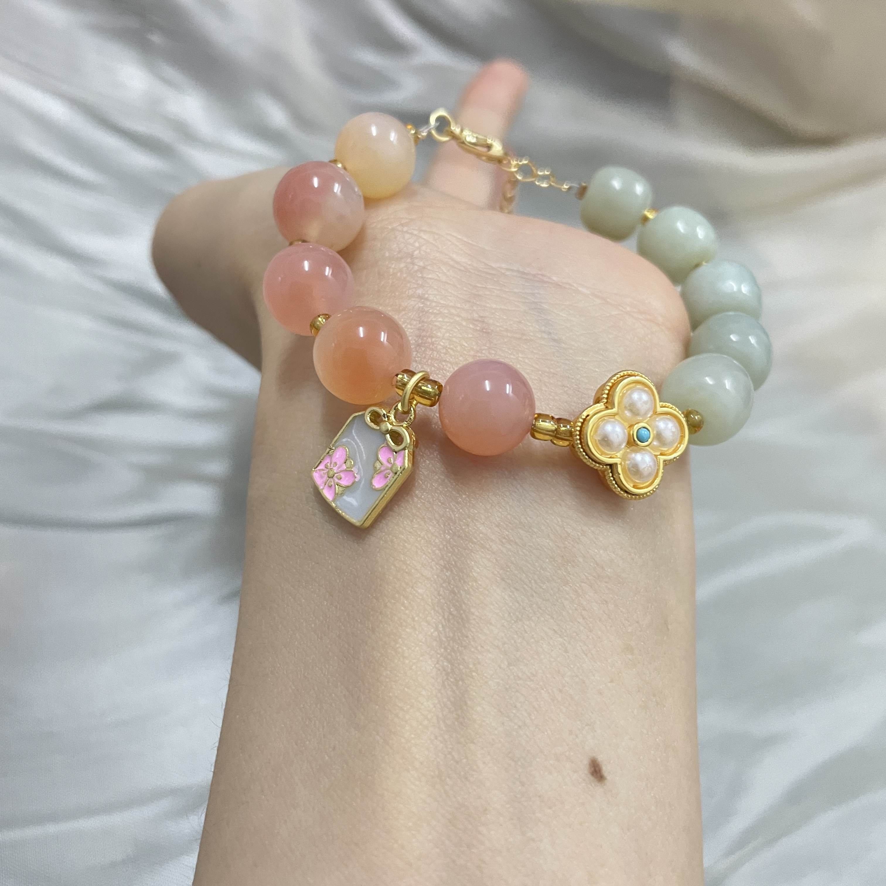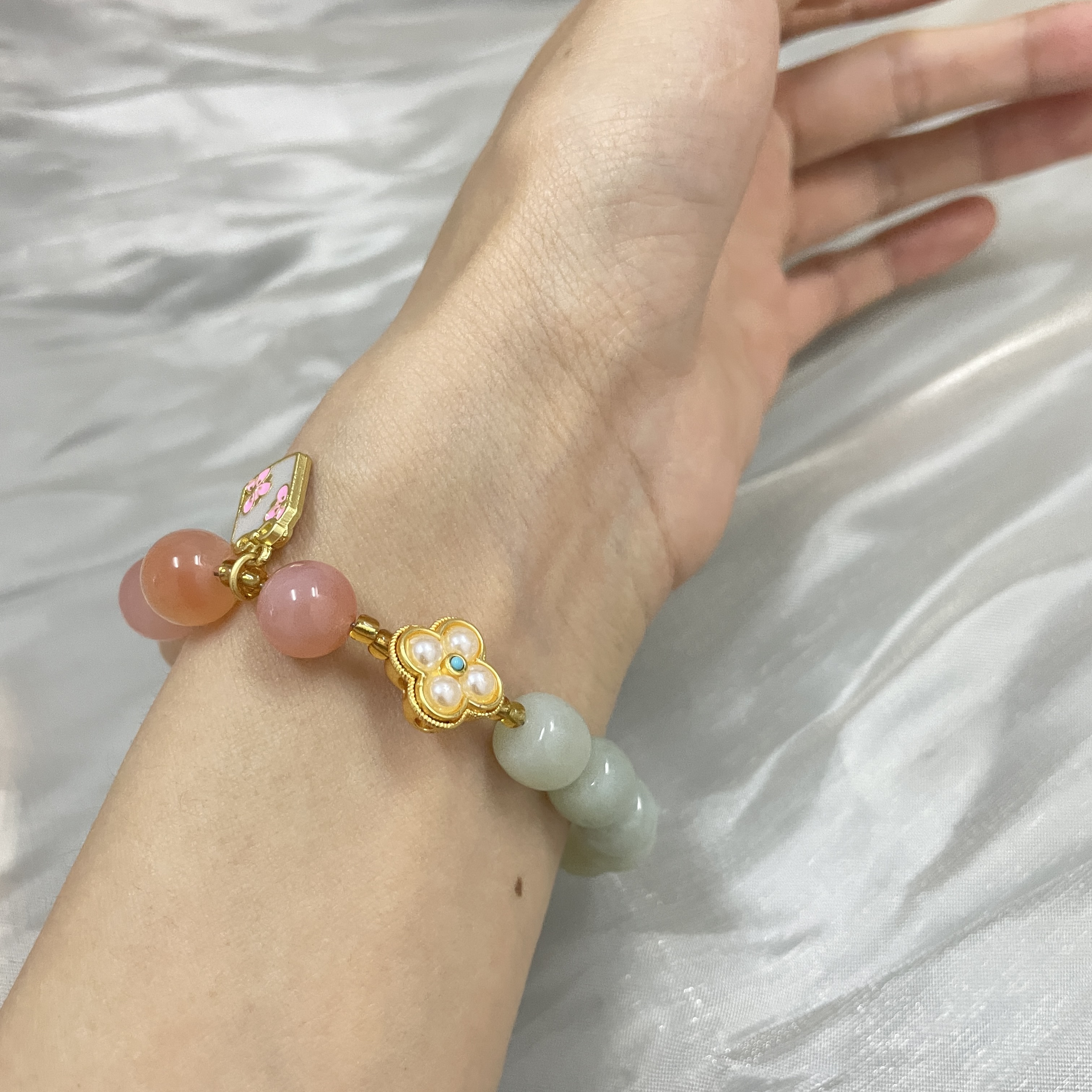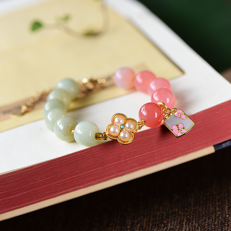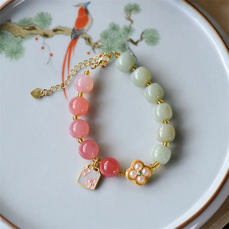 1:红色娇嫩鲜艳,绿色清爽怡人、黄色明媚亮眼,与各种蜜蜡、盐源玛瑙、珍珠的点缀相辅相成;撞色搭配,跳脱好看,戴于手腕,坠子随身姿摇曳摆动,趣味可爱