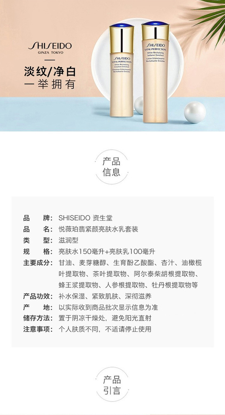 【中欧班列精选】 日本资生堂SHISEIDO悦薇珀翡紧颜亮肤水乳套装滋润型/清爽型 亮肤乳100ml+亮肤水150ml LPY/RL