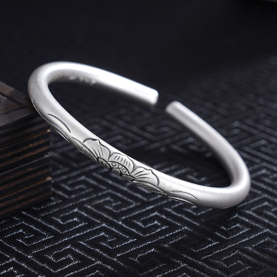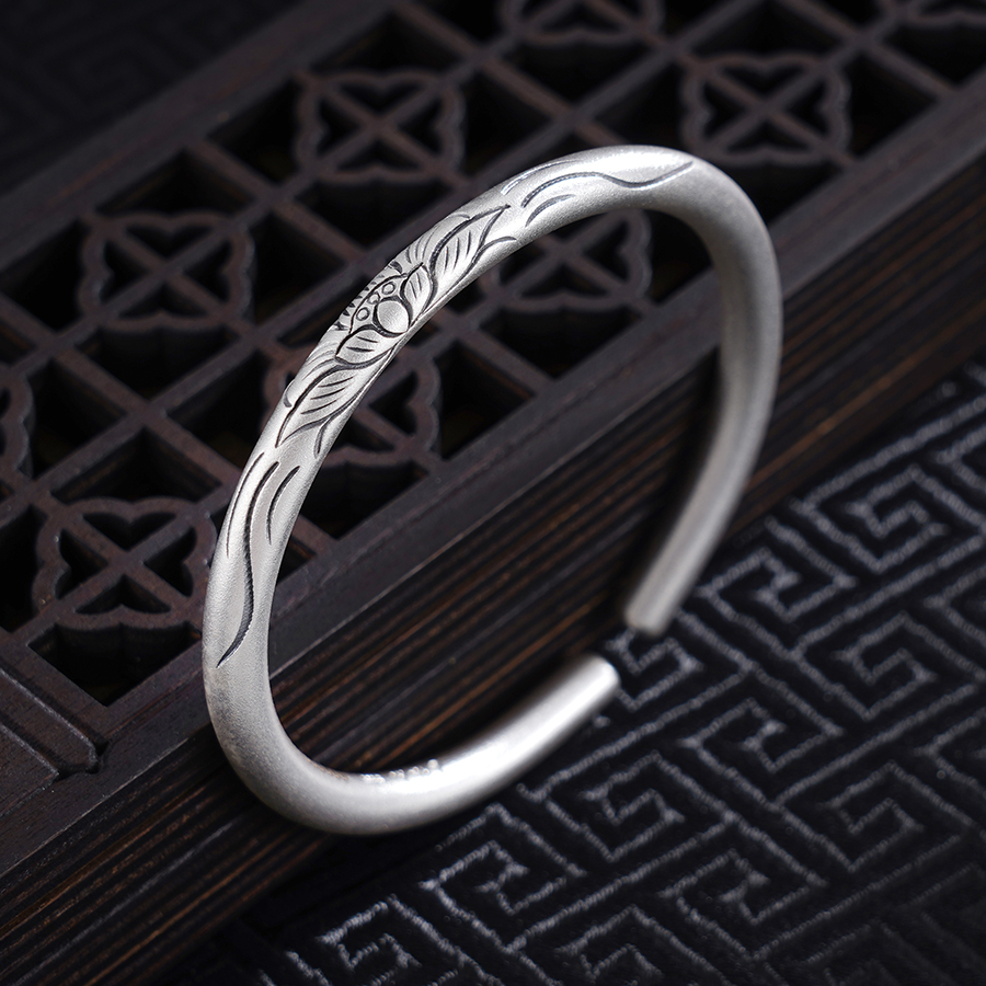 【寓意】:纯银开口手镯,镯面錾刻莲花图案,搭配流水纹样,恰似情意绵绵,寓意莲开见喜,情深绵长。