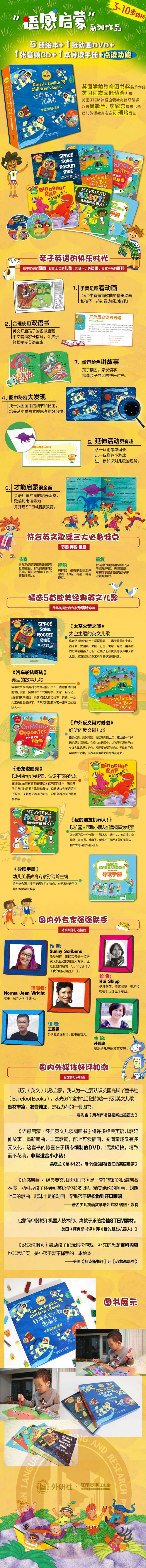 《语感启蒙经典英文儿歌图画书宇宙探秘韵律歌》是针对学前以及早教儿童而专门研发出版的一套经典英文儿歌,它结合3-10岁孩子心理特点改编了5个经典曲目,曲风多元,主题丰富。每一首儿歌的诞生都经历了:作词家围绕经典旋律创作全新故事,插画家用色彩艳丽的图画进行演绎,音乐家融合众多音乐元素真实演奏,可以说从没有人为一套英文儿歌投注如此多心力。
