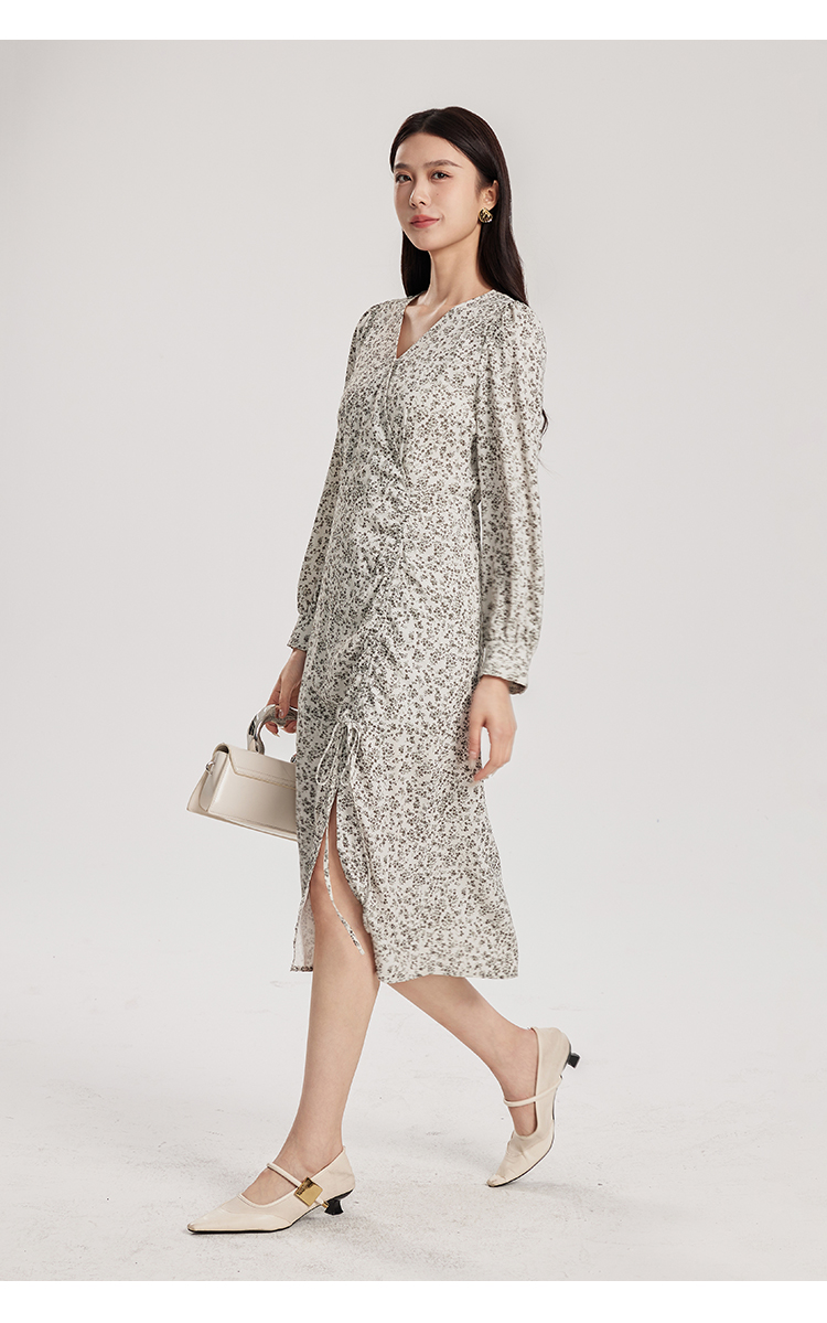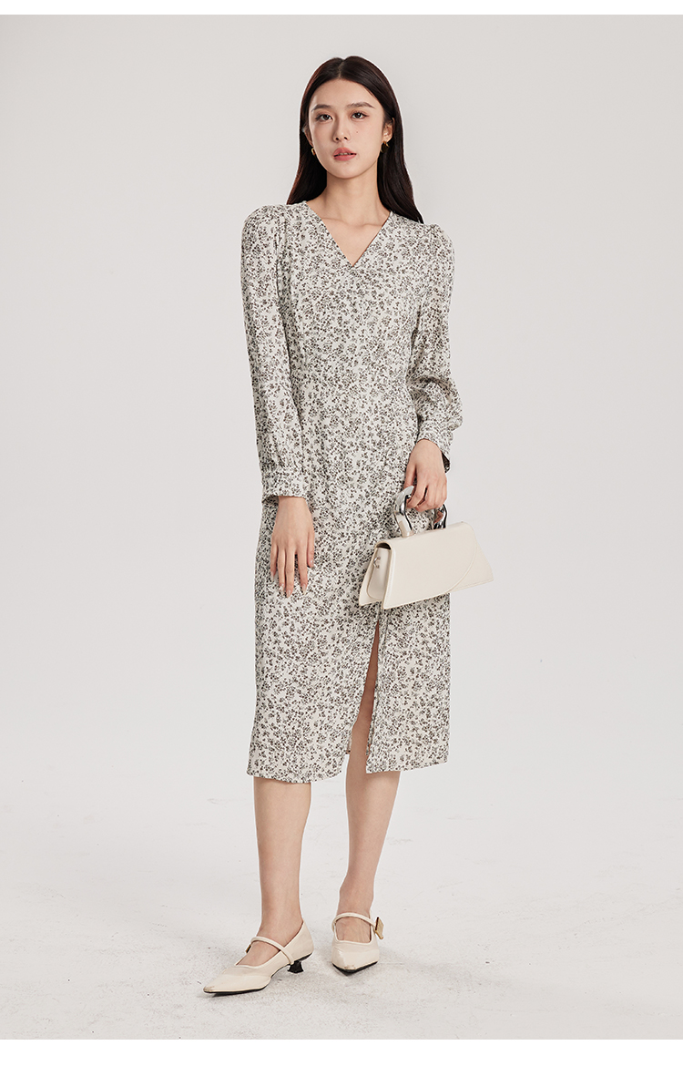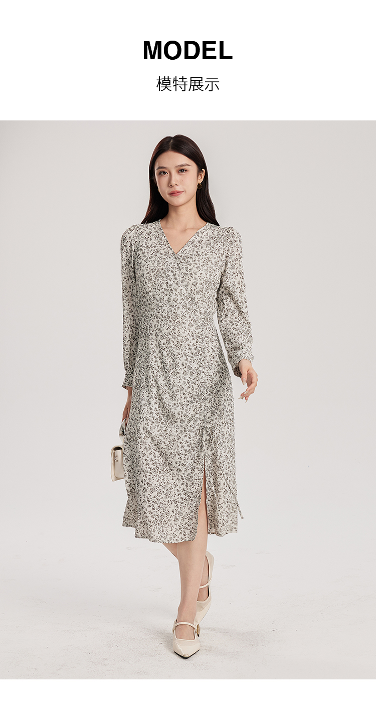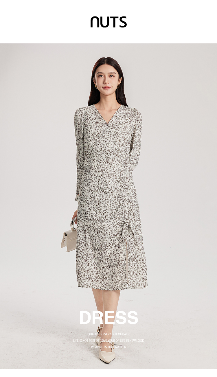 NUTS商场同款春秋款时尚气质百搭通勤V领长袖连衣裙女4341007A1