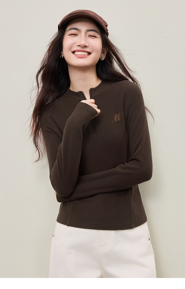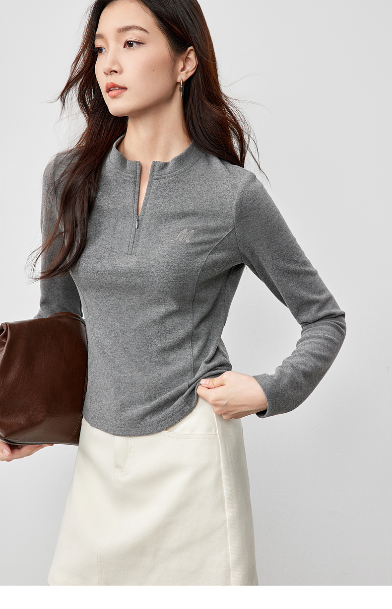【内购】气质通勤定制半开拉链立领刺绣正肩修身长袖保暖针织内搭打底衫-143T56422