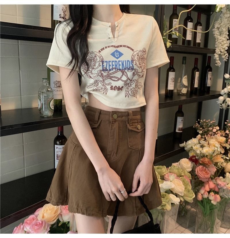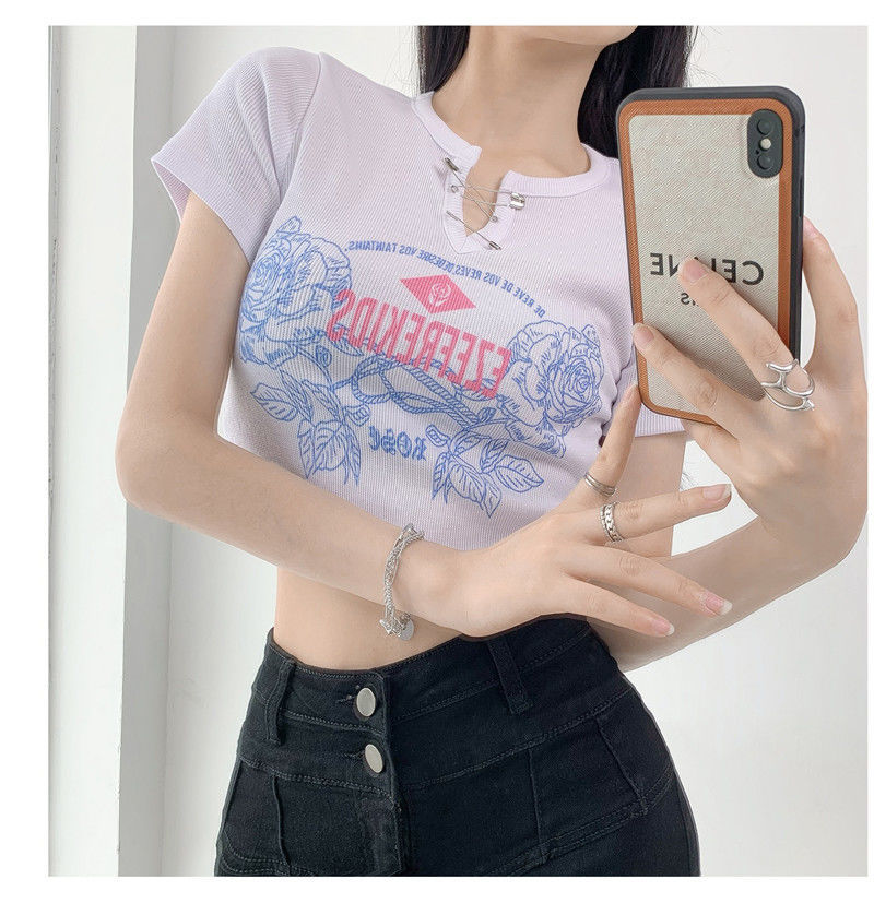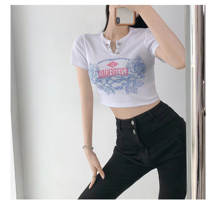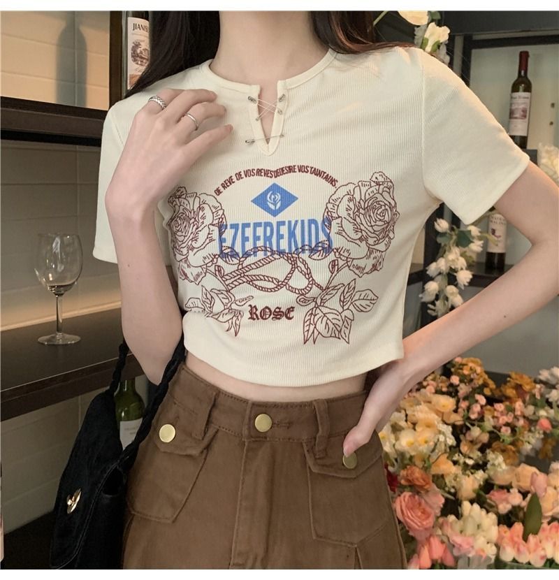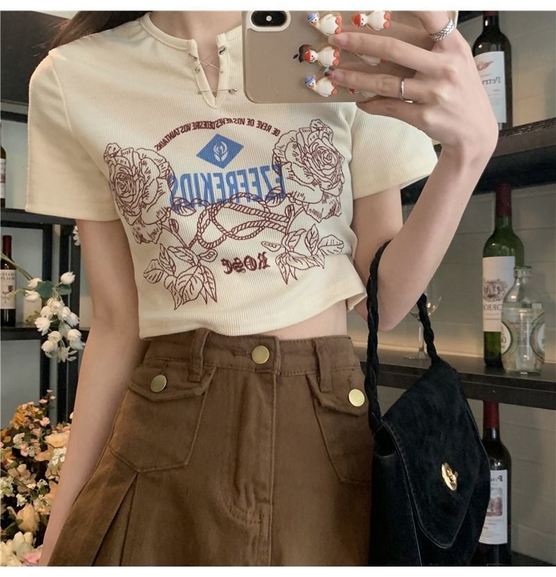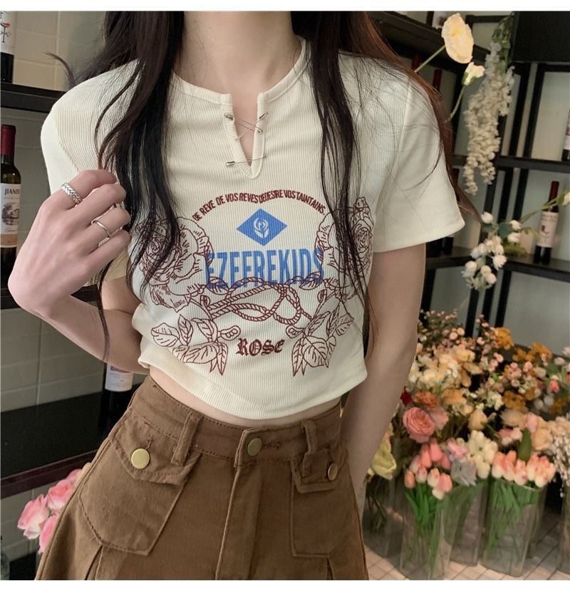 黛唯梵甜辣少女感复古印花短袖t恤女设计感小v领显瘦高腰心机露脐上衣