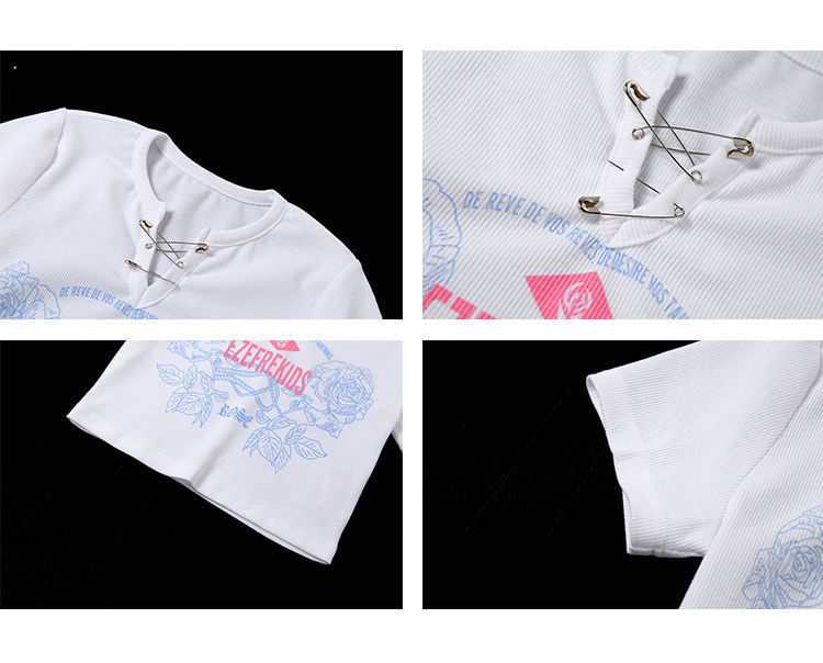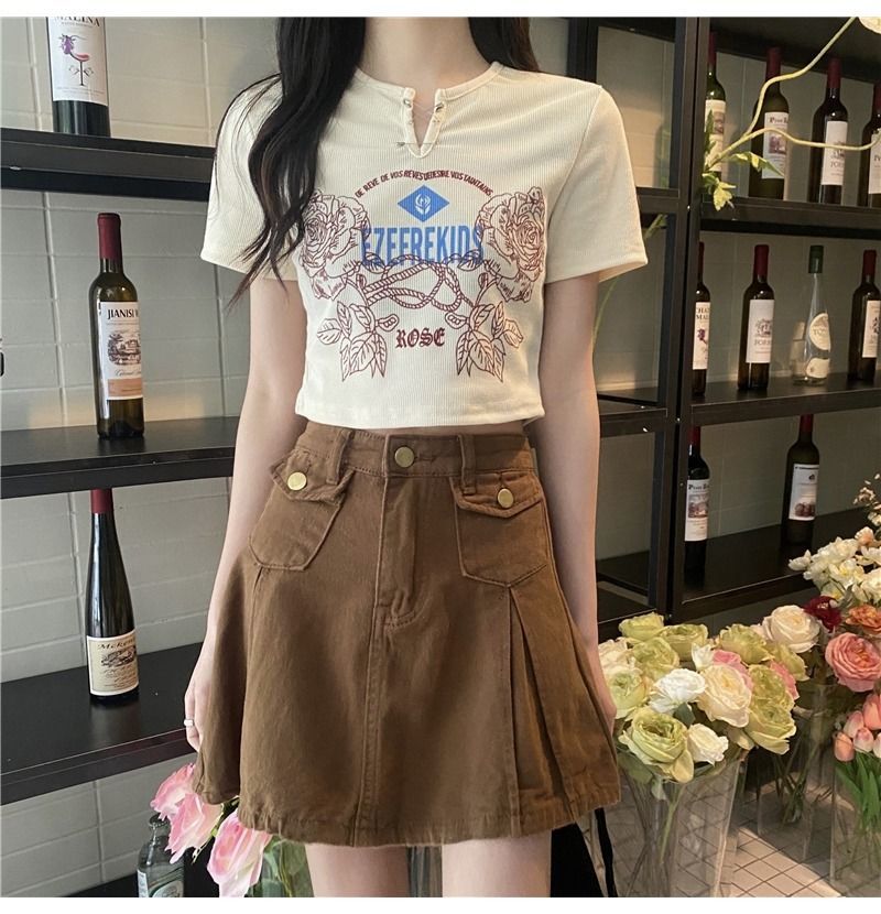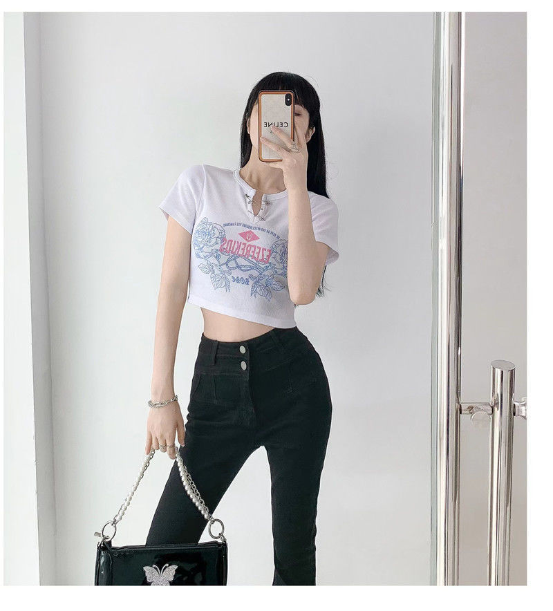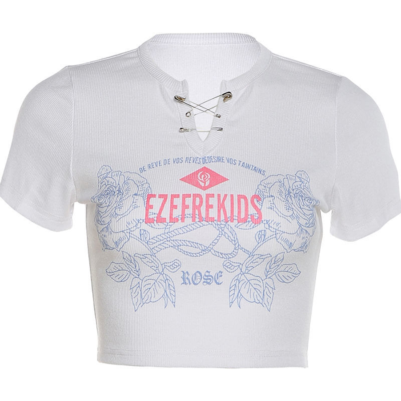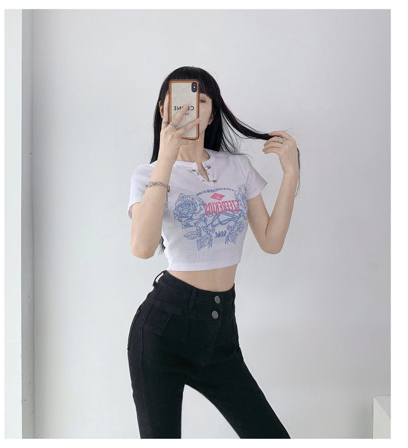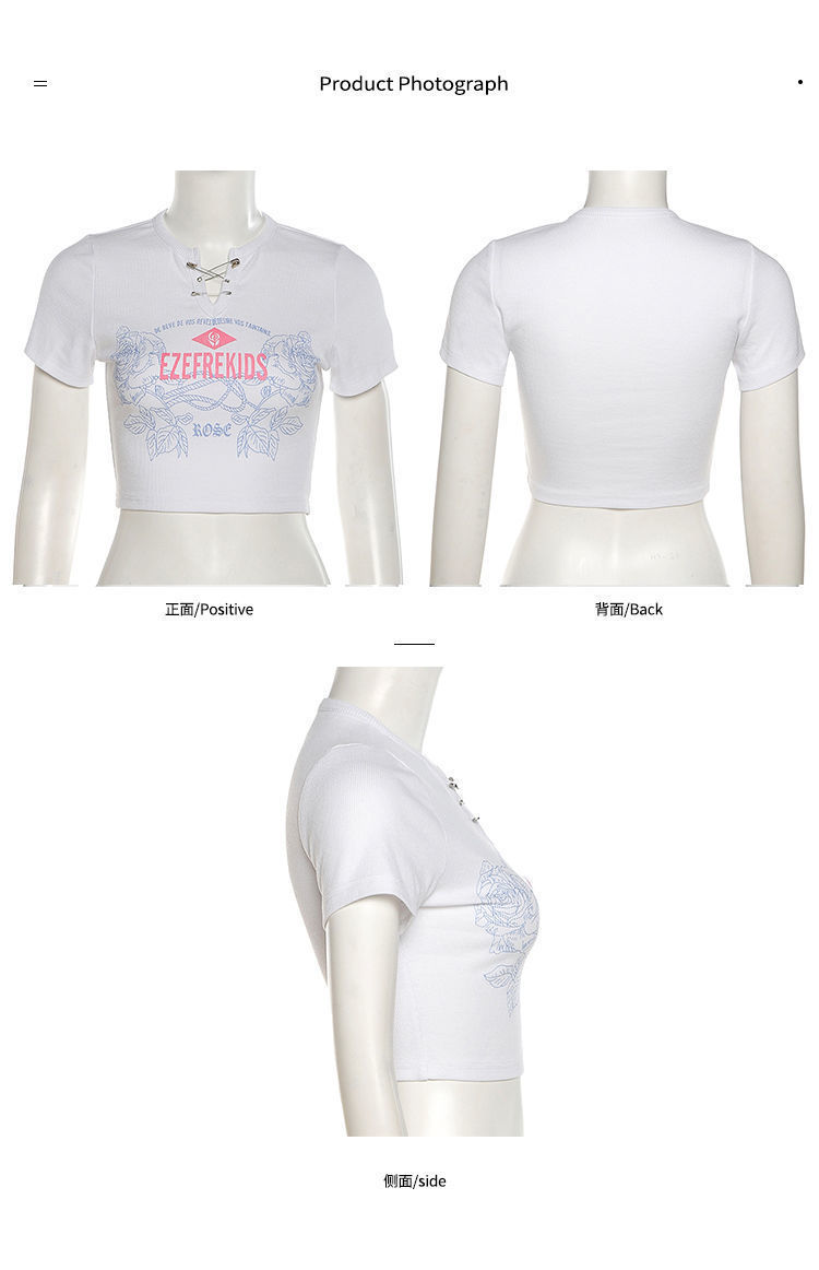 黛唯梵甜辣少女感复古印花短袖t恤女设计感小v领显瘦高腰心机露脐上衣