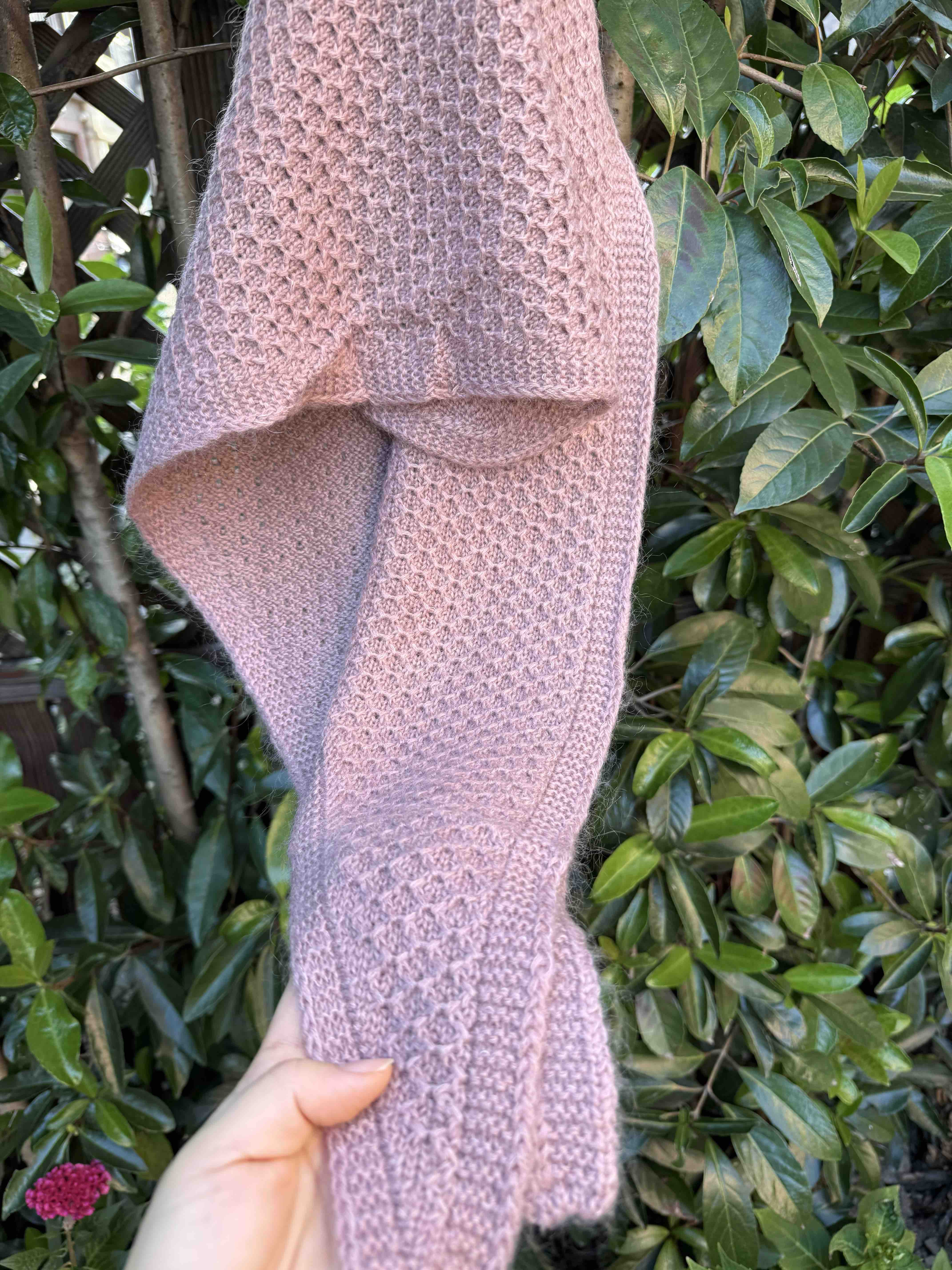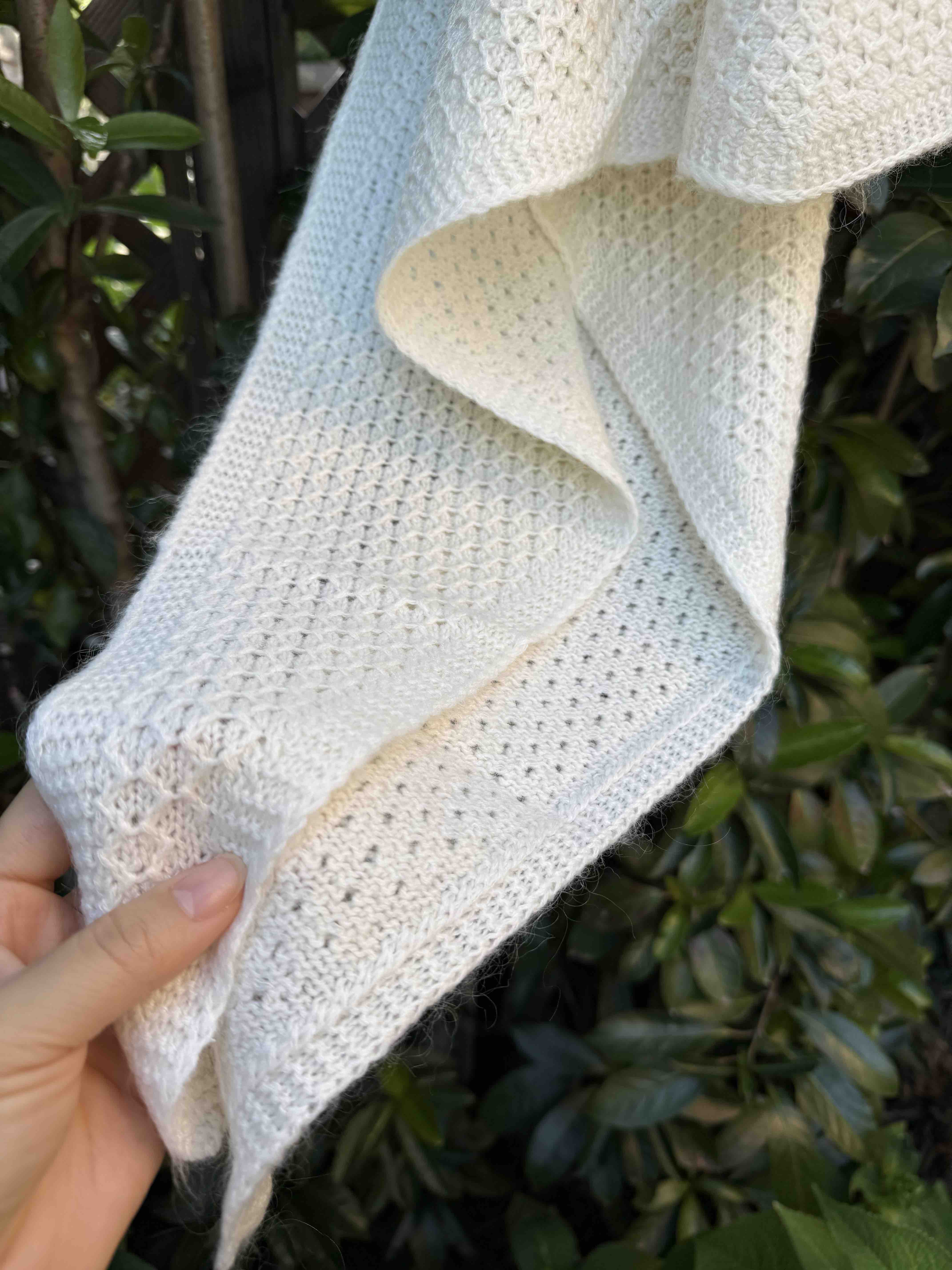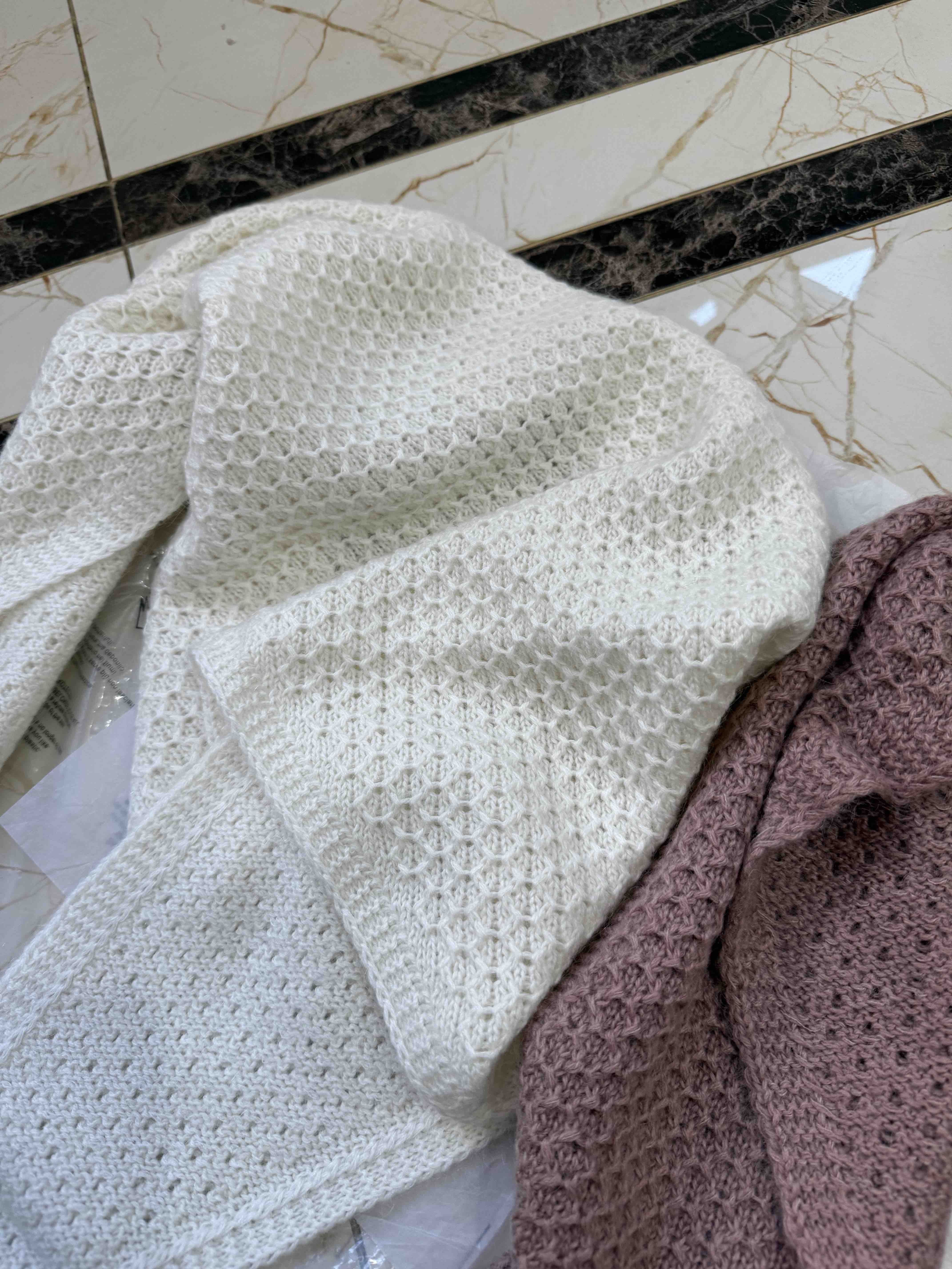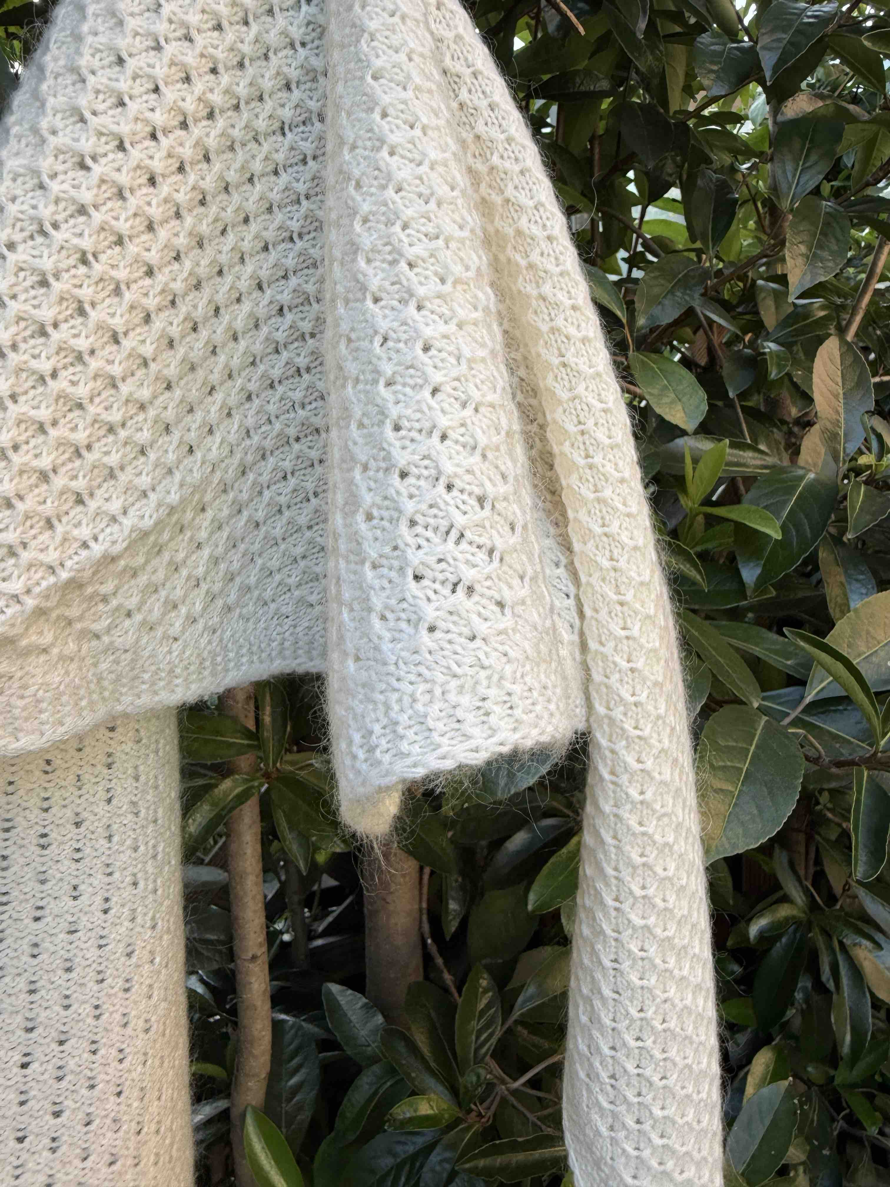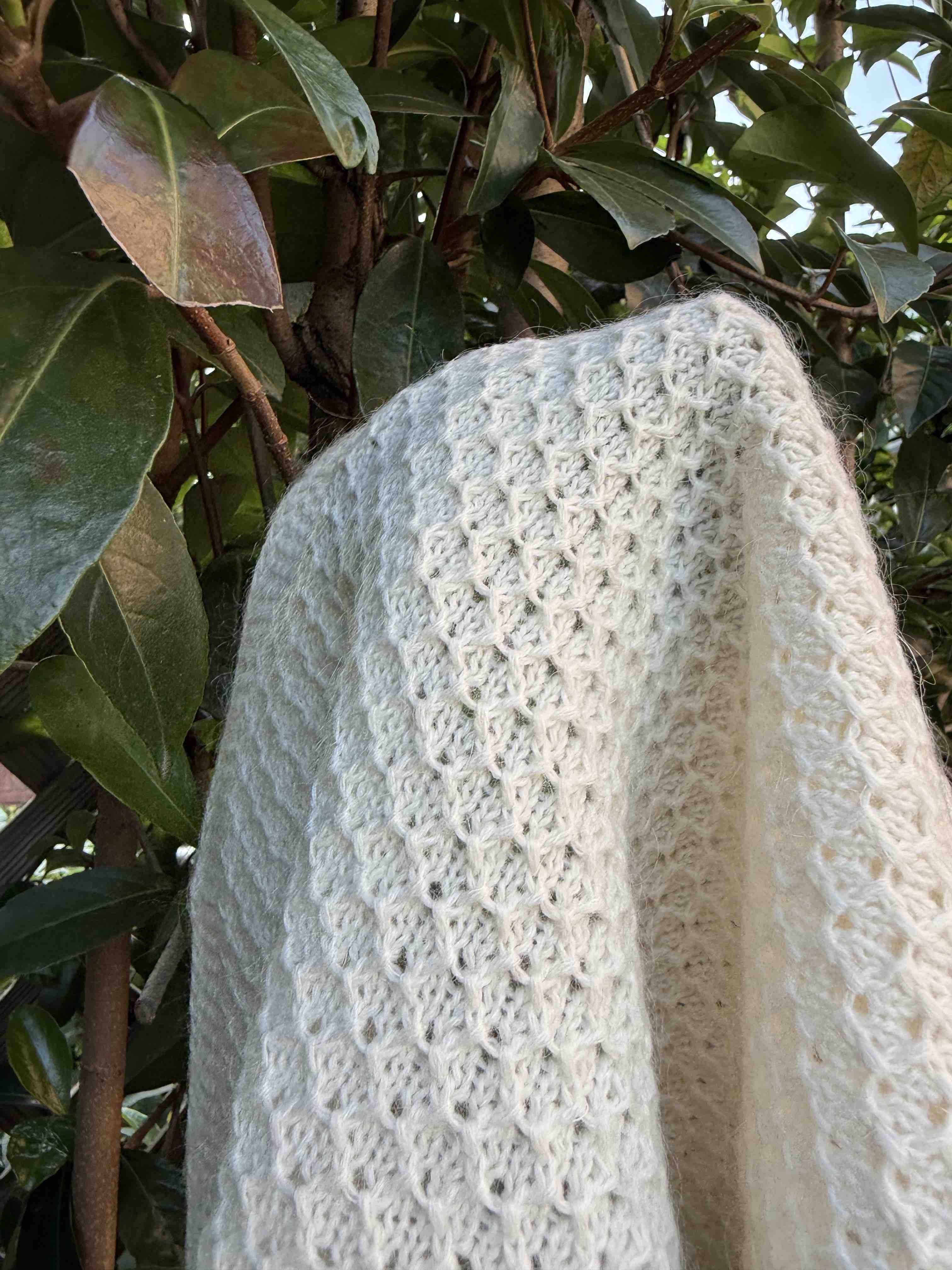 确实室内室外拍,就是会有色差,实在无法避免,尽力了[合十][合十][合十]比这两个颜色都好看,华夫格针织肌理,室外拍能看到毛茸茸的即视感吧