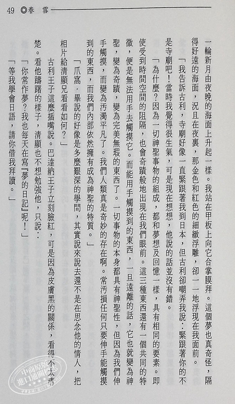 第三卷《曉寺》第一部是紀行小說,也是唯識思想的小說