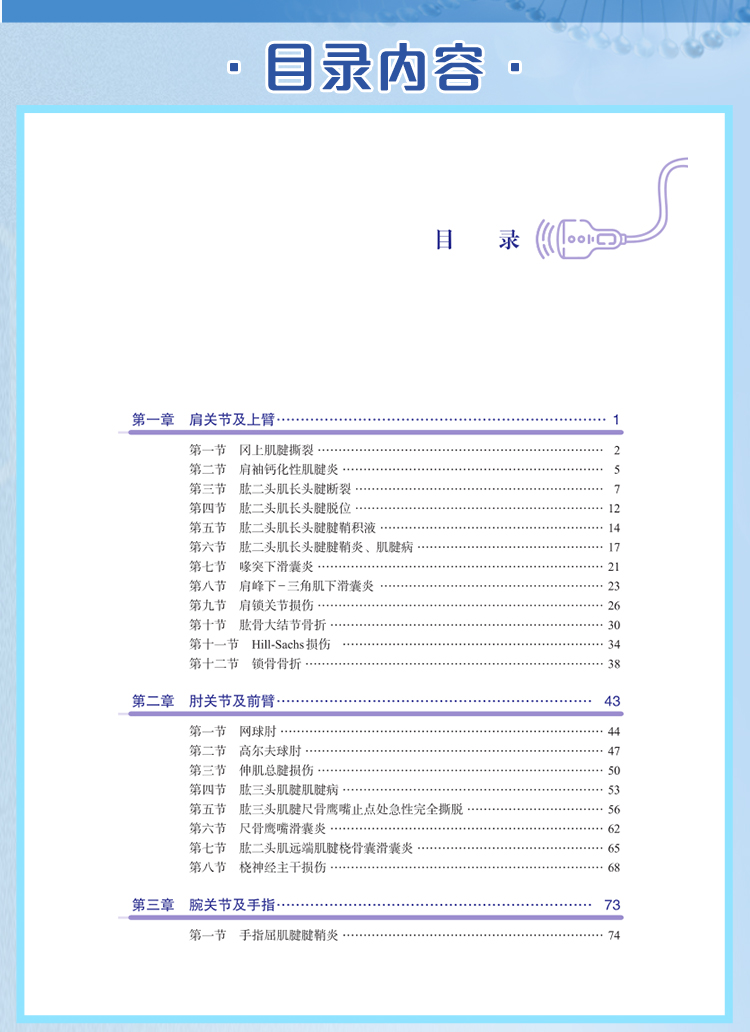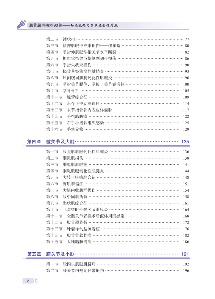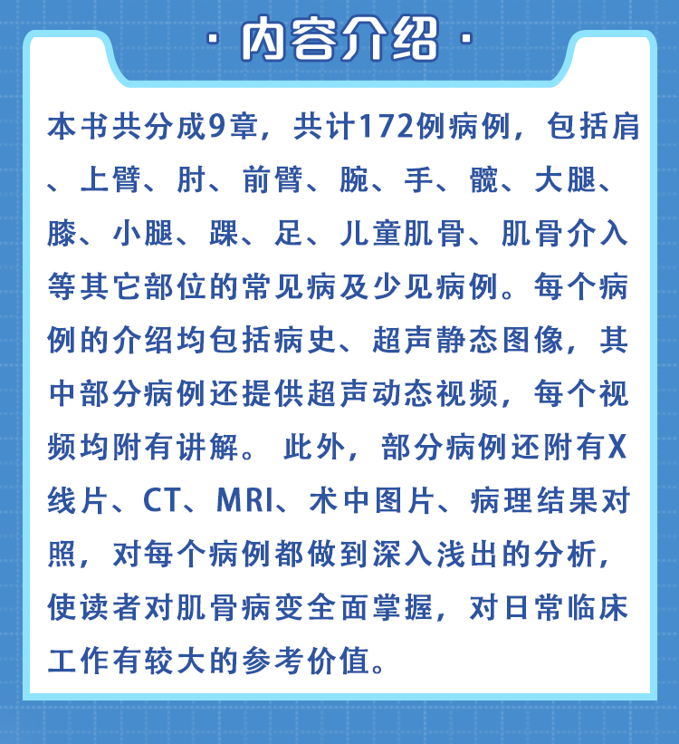 本书共分成9章,共计172例病例,包括肩、上臂、肘、前臂、腕、手、髋、大腿、膝、小腿、踝、足、儿童肌骨、肌骨介入等其它部位的常见病及少见病例。每个病例的介绍均包括病史、超声静态图像,其中部分病例还提供超声动态视频,每个视频均附有讲解。 此外,部分病例还附有X线片、CT、MRI、术中图片、病理结果对照,对每个病例都做到深入浅出的分析,使读者对肌骨病变全面掌握,对日常临床工作有较大的参考价值。