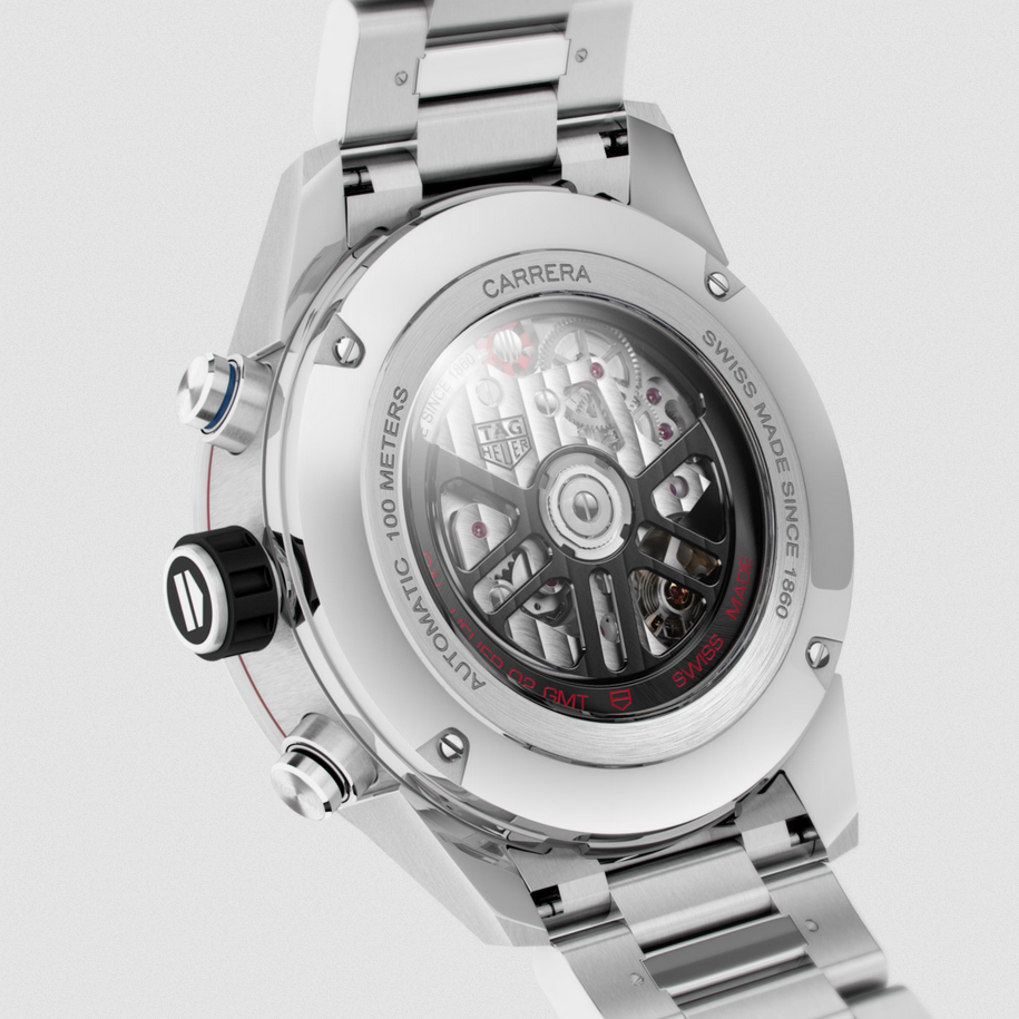 镜面 材质 | 蓝宝石水晶玻璃 | 表盘 | 黑色镂空熊猫表盘 黑色外缘设60秒刻度 3个计时盘,配镀铑指针: 3点钟位置设分钟计时盘,配镀铑蜗形纹圆环 9点钟位置设小时计时盘,配镀铑蜗形纹圆环 6点钟位置设小秒针计时盘,配蓝色蜗形纹圆环 镀铑时针、分针、秒针和时标,涂有白色SuperLuminova®荧光涂料 红色漆面GMT指针,涂有白色superluminova®荧光涂料 12点钟位置设抛光镀铑TAG Heuer(泰格豪雅)盾形标志 4:30位置设日历视窗 压印“CARRERA HEUER 02 GMT CHRONOGRAPH AUTOMATIC”字样 黑色/蓝色陶瓷表圈,带24小时测速计刻度 抛光精钢及橡胶表冠 日期显示 双时区 计时 |