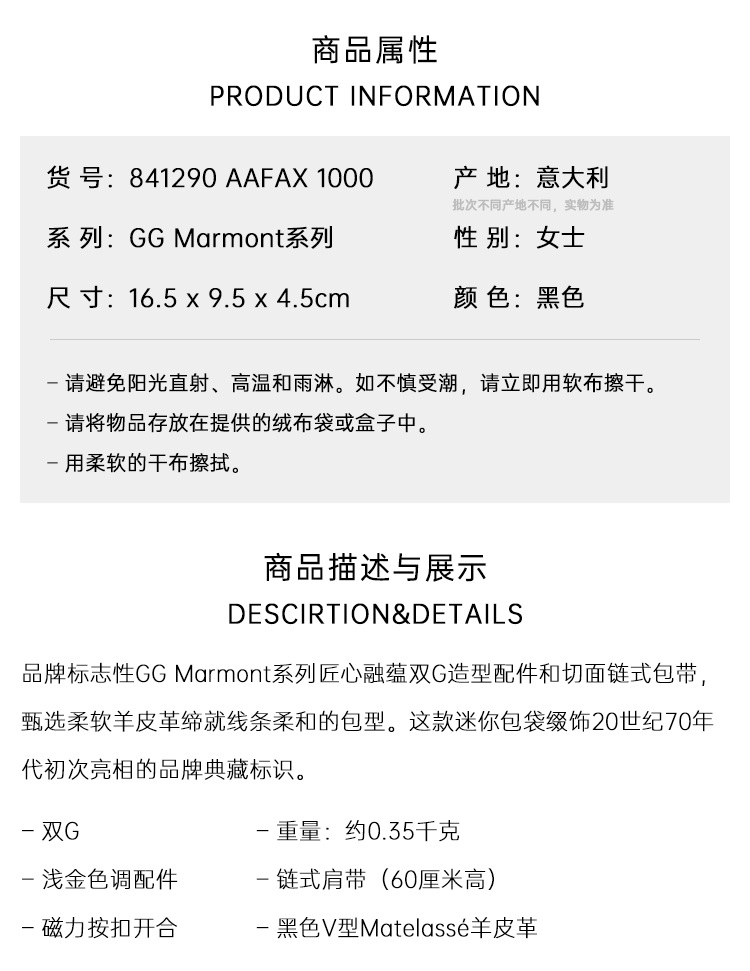 GUCCI 古驰 女士 GG Marmont系列 迷你单肩背包 黑色 841290 AAFAX 1000