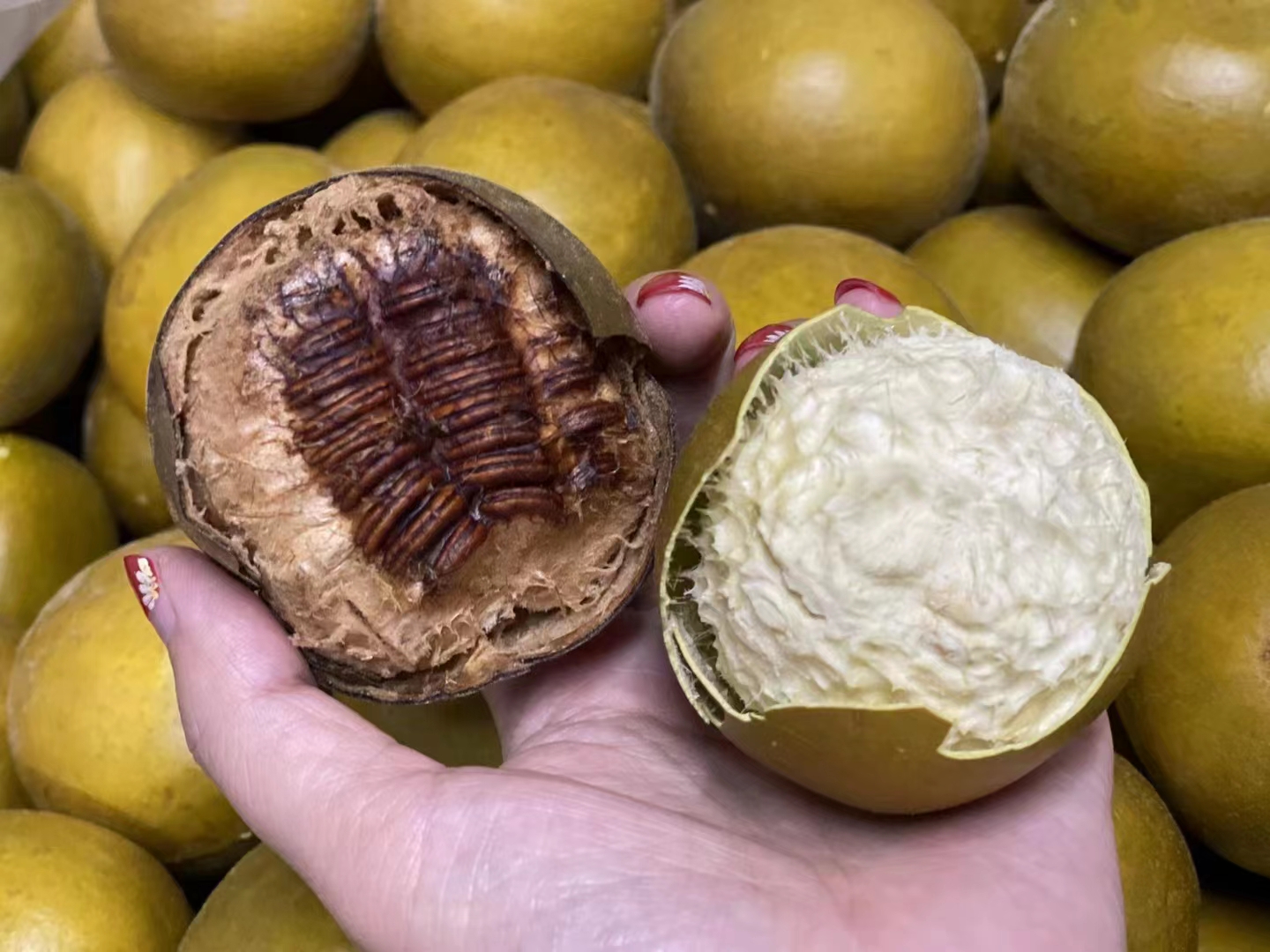 市面上多件的都是高温烘烤出来的罗汉果,水分少,焦糖色,空壳,手摇可以晃动