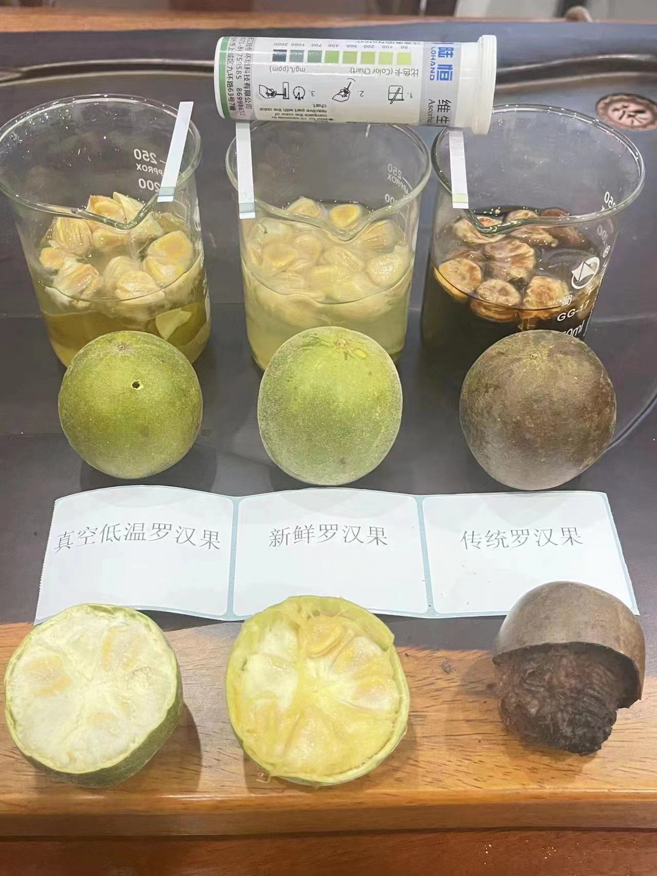 高维C,鲜果和低温脱水罗汉果及传统烘烤罗汉果测试,鲜果和低温脱水罗汉果两个结果都在700,高温烘烤罗汉果维C值只有50,可以说明我们的罗汉果保留鲜果百分之95以上营养价值!