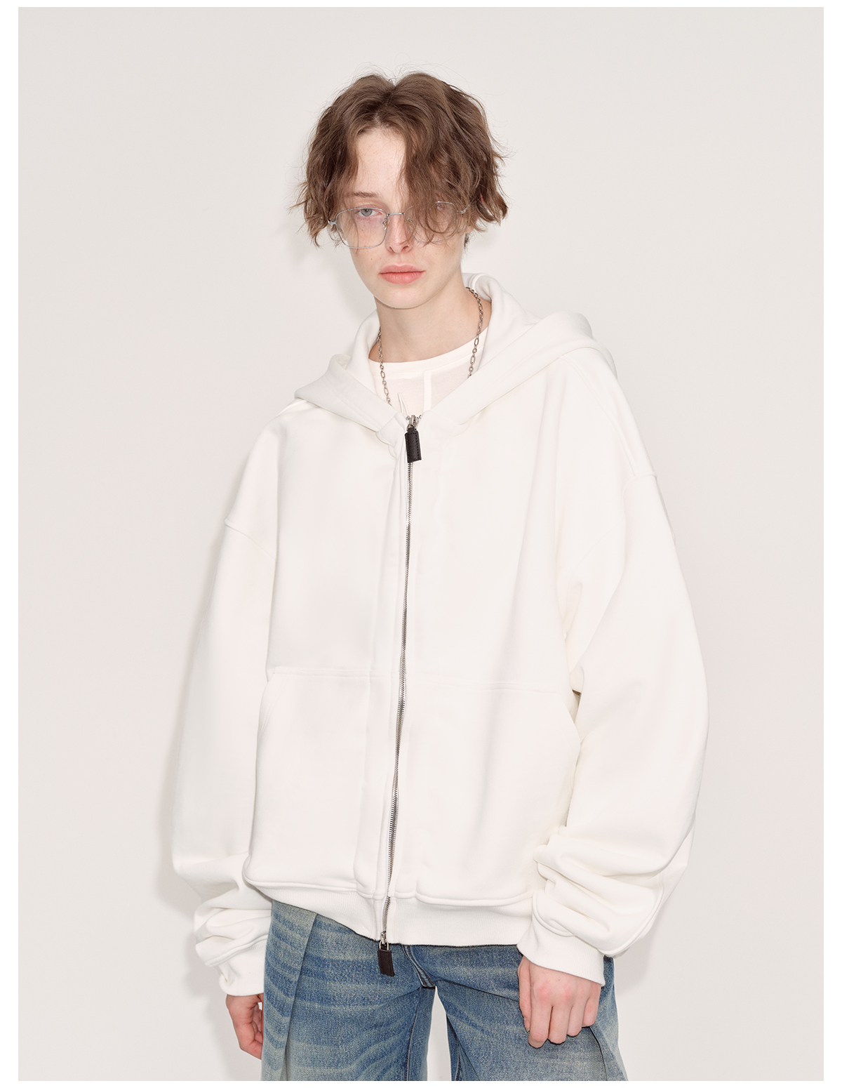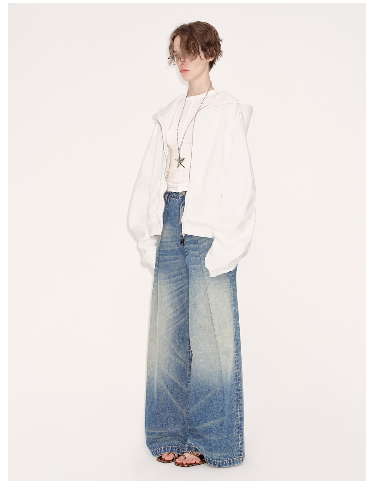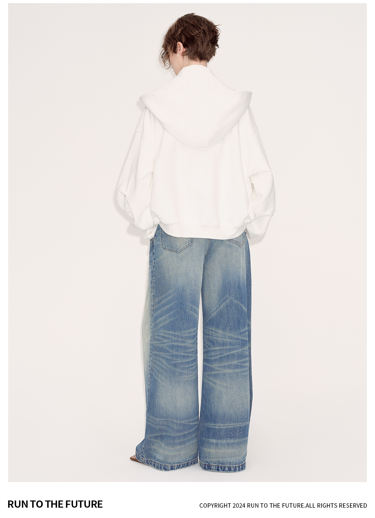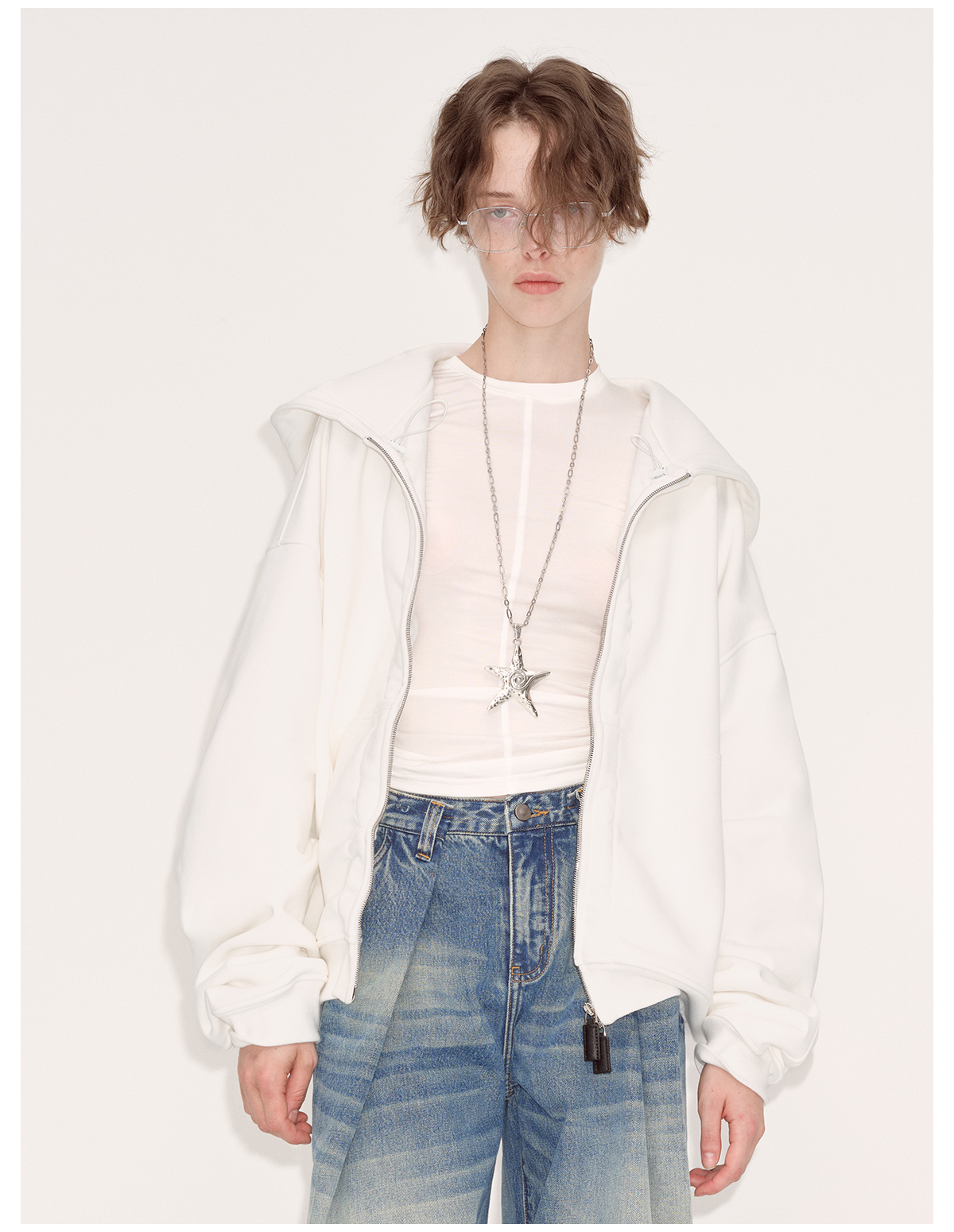 出逃赤岗西/24AWW107/白色连帽休闲弯刀袖抽褶拉链外套