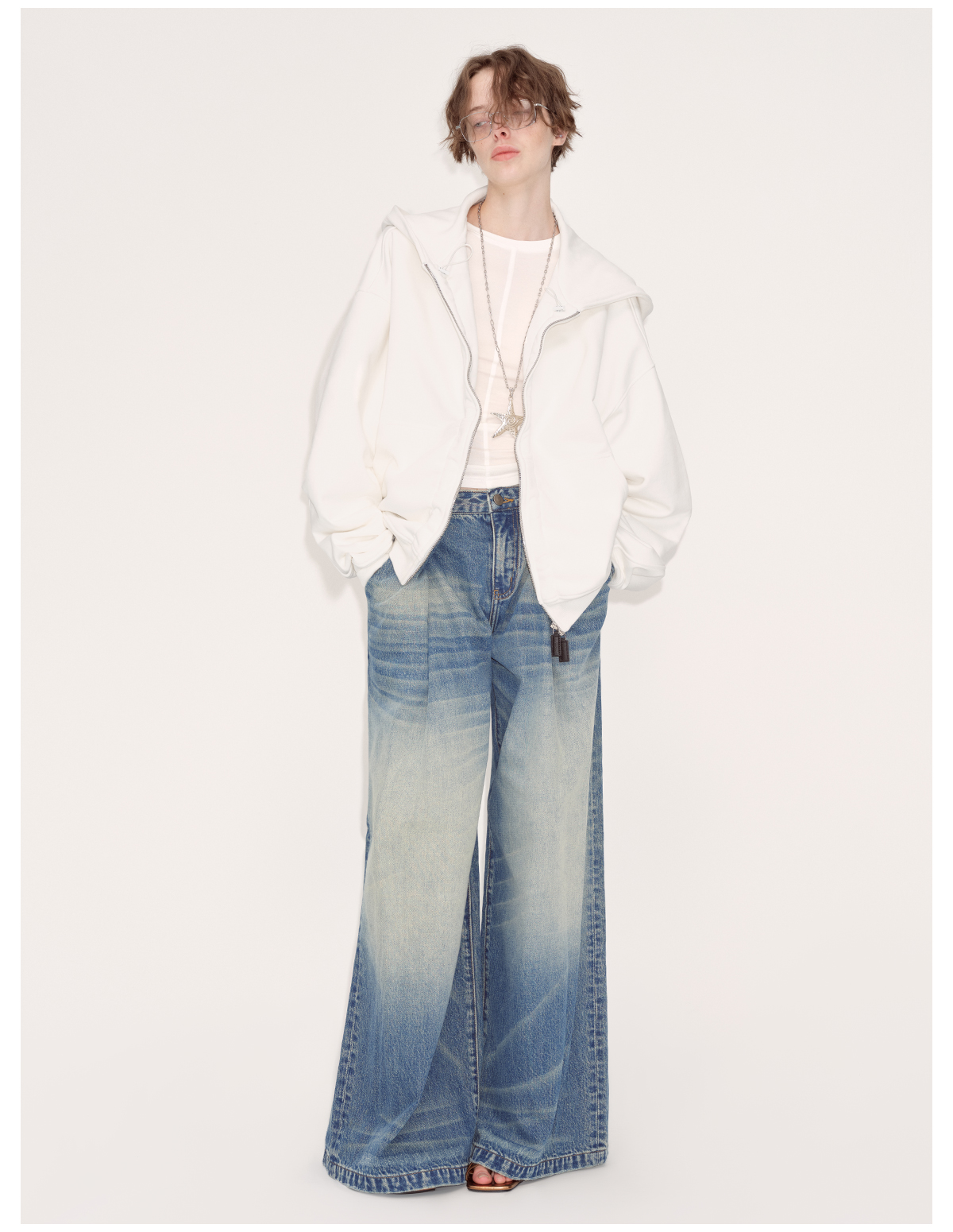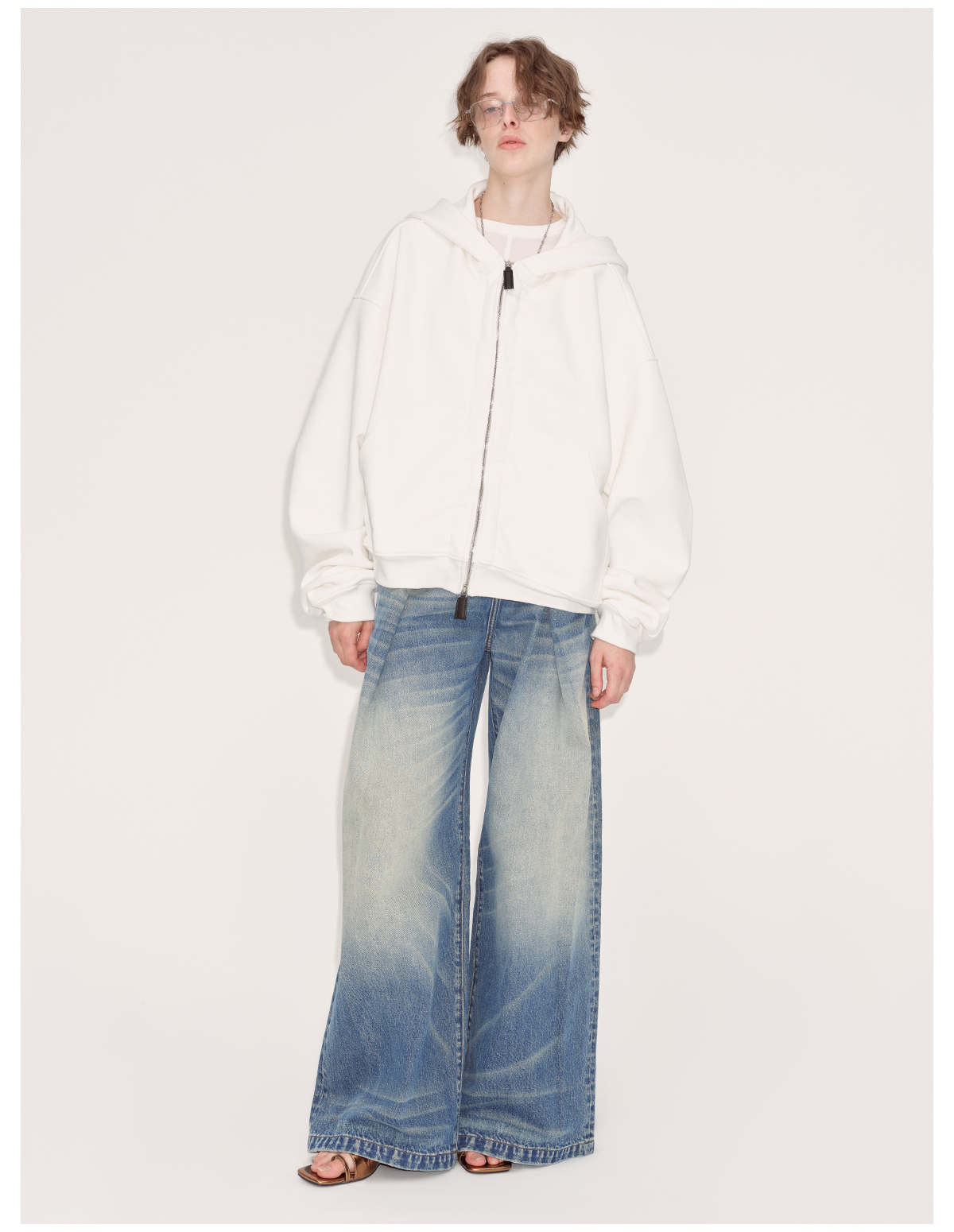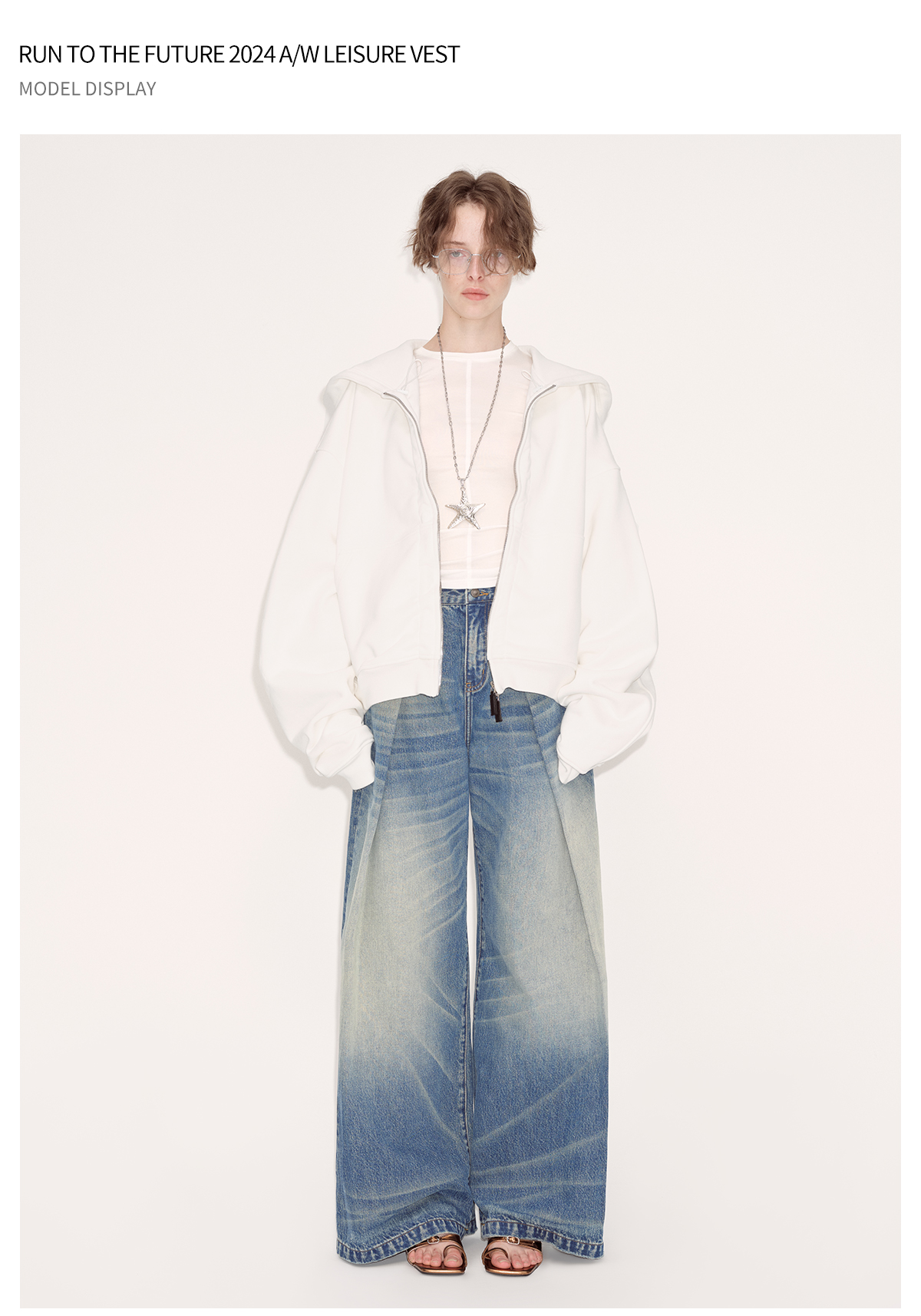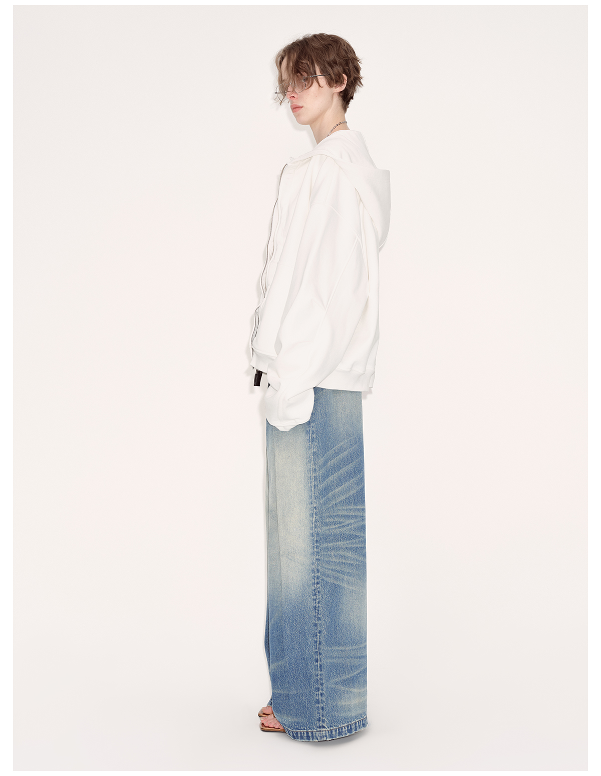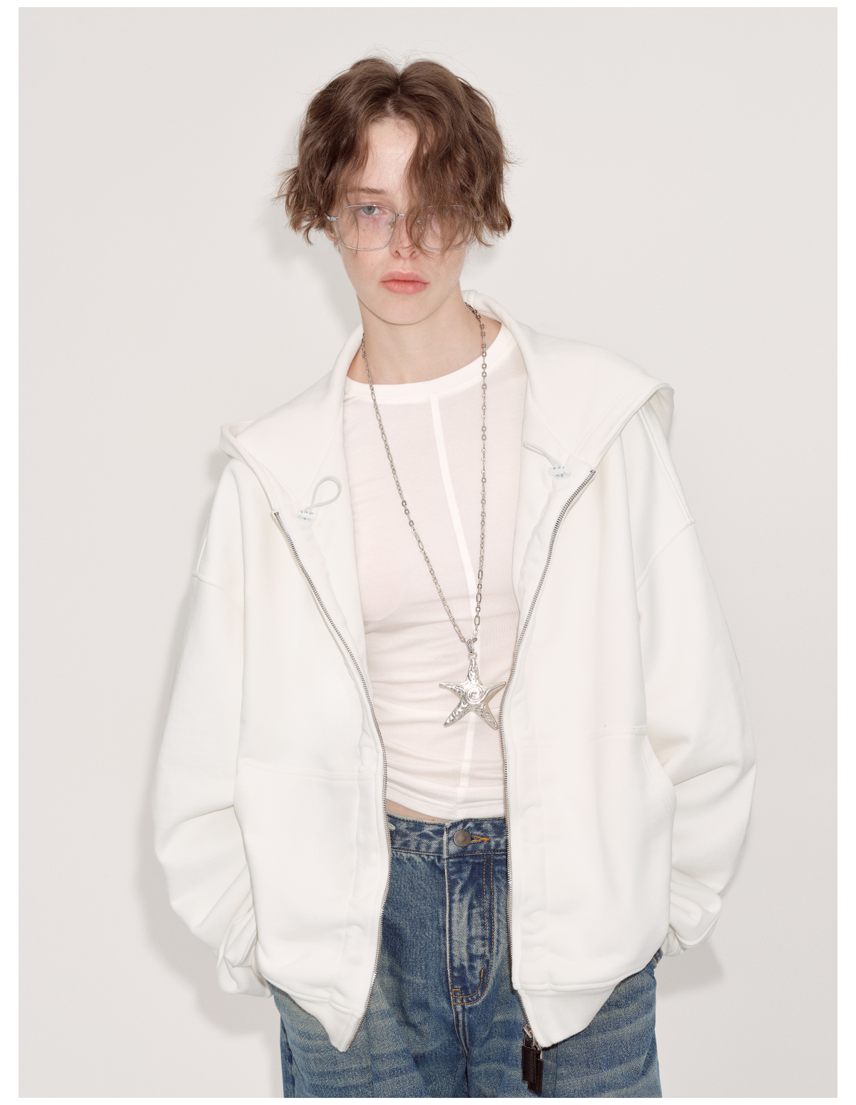 出逃赤岗西/24AWW107/白色连帽休闲弯刀袖抽褶拉链外套