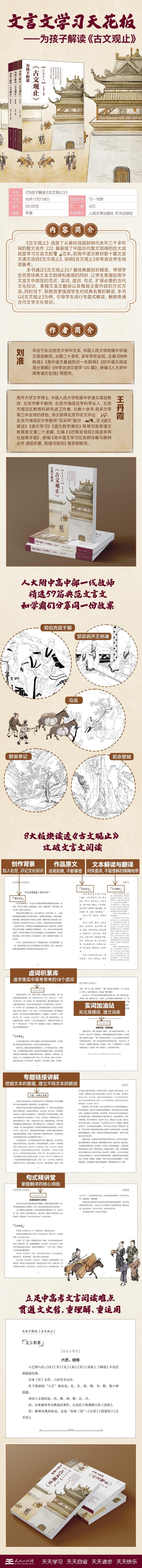 《古文观止》选取了从春秋战国到明代末年三千多年间的散文名作222篇展现了中国古代散文取得的巨大成就是学习文言文的不错范本。《高中语文课程标准》推荐的 32篇文言文,其中有18 篇就出现在《古文观止》中。《古文观止》收录的《陋室铭》《桃花源记》等10篇文言文篇目,也出现在初中语文教材。这么多篇目选自《古文观止》说明《古文观止》非常适合学生阅读备考。 本书通过《古文观止》57篇经典篇目的精读,带领学生欣赏经典文言文韵律和美感的同时,让学生掌握初高中文言文中固定的范式:实词、虚词、句式,扩展必要的古代文化知识,掌握文言文翻译以及概括主要内容的方式方法。同时当下,新教改更强调学生对经典名著的解读,本书以《古文观止》为例,引导学生进行专题式解读,触类旁通古代文学文化常识。