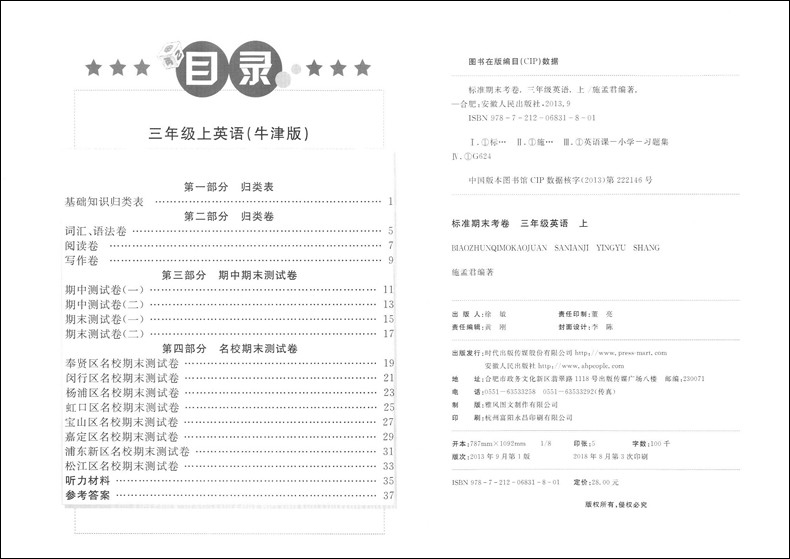 新版 标准期末考卷 英语 三年级第一学期/3年级上 第3版 上海小学教辅 教材配套同步期中期末课后复习试卷 上海各区真卷练习