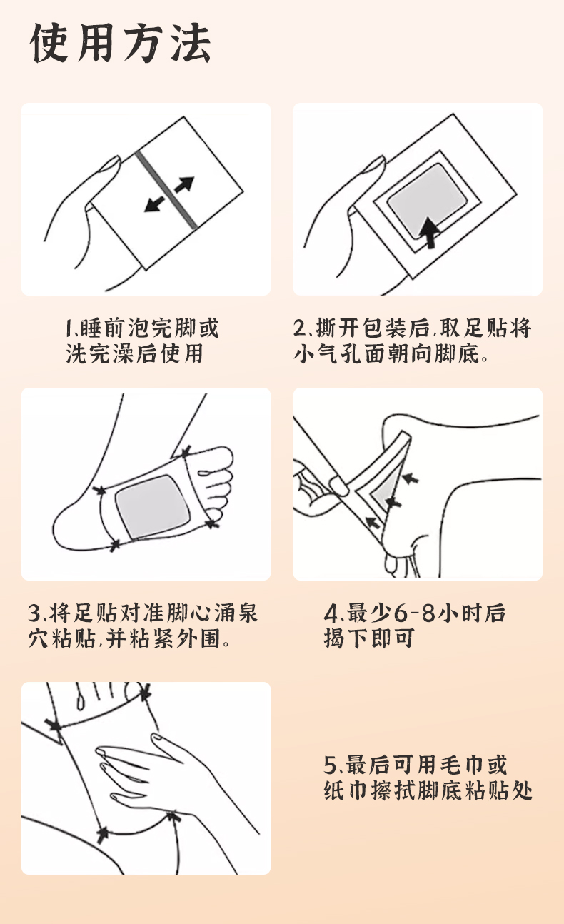 3、每天睡觉前使用,6-8 小时后或第二天早晨起床揭下,再以纸巾擦拭或以温水冲洗清洁足底肌肤