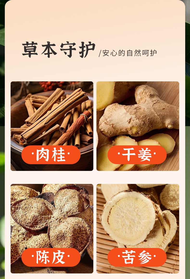成 分: 吴茱萸、肉桂、干姜、陈皮、苦参、细辛、 竹醋粉