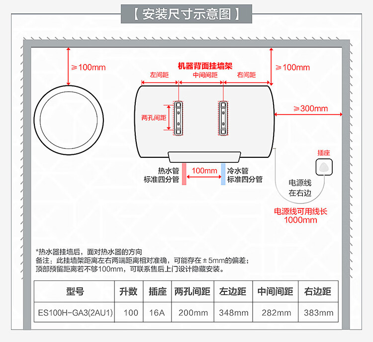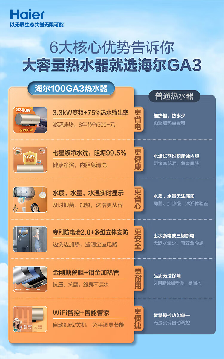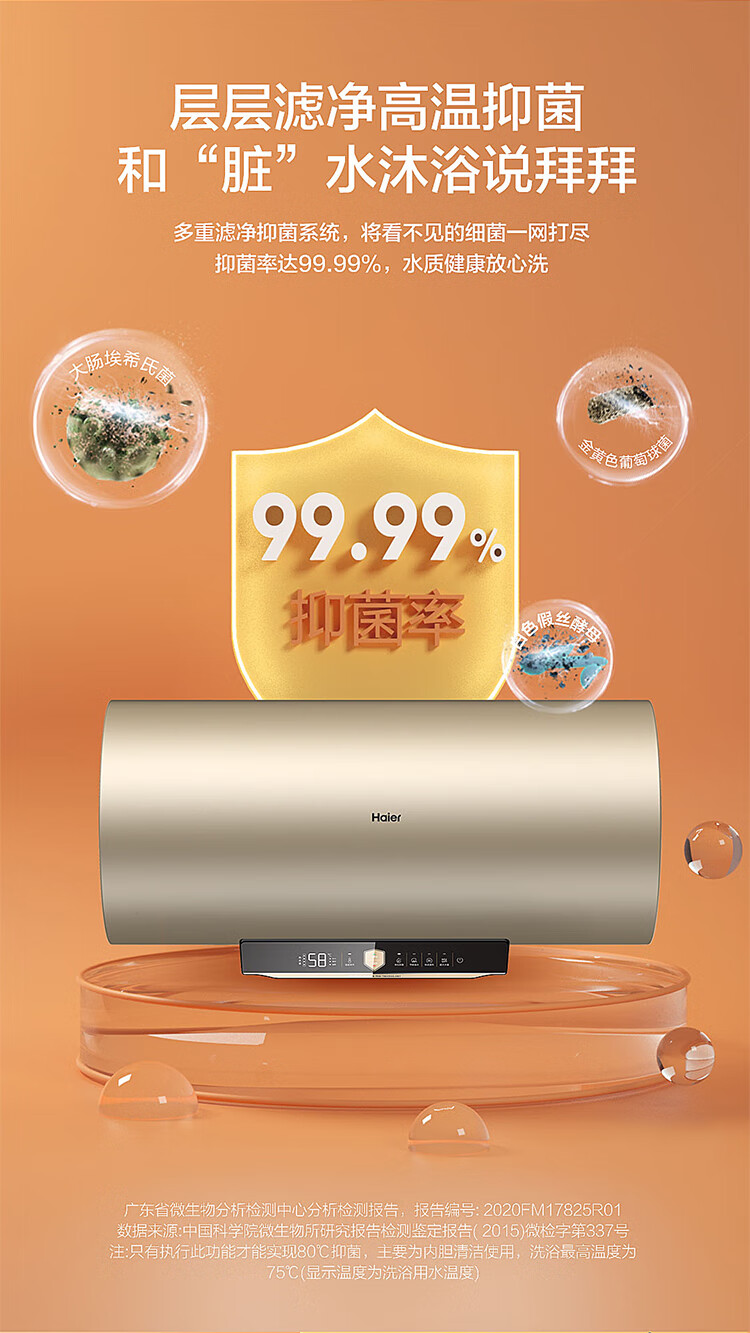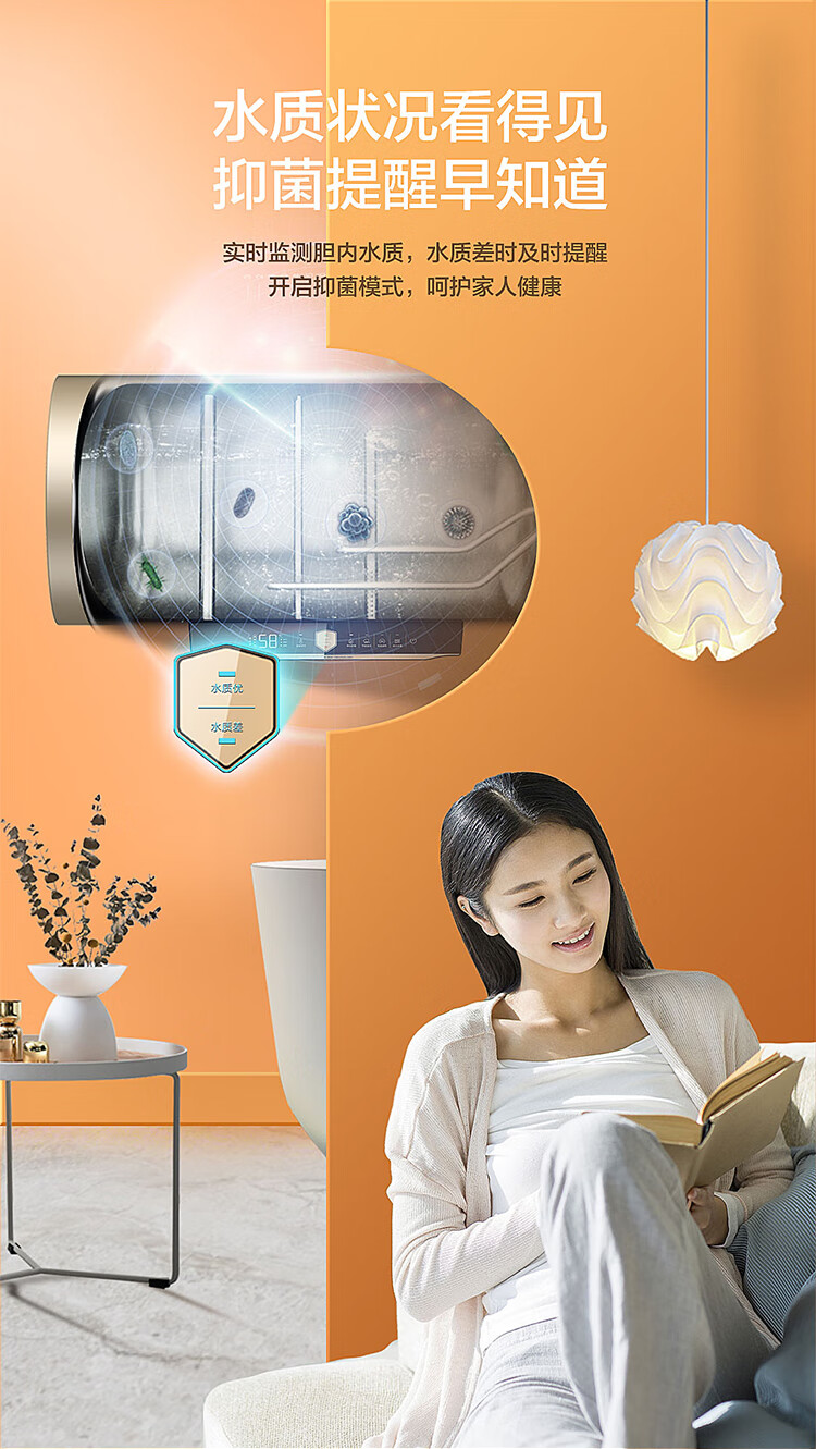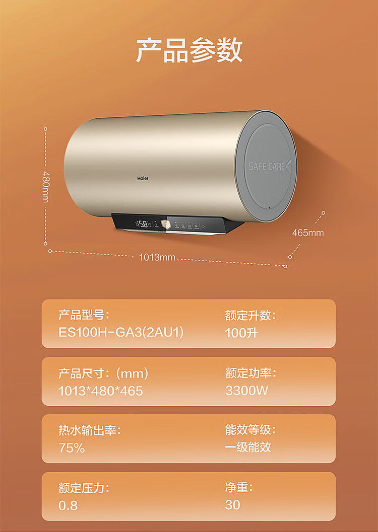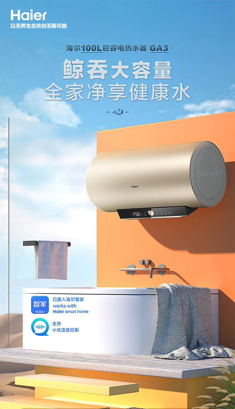 海尔(Haier)100升家用电热水器 3300W抑垢净水洗水质监测宽屏大户型沐浴 ES100H-GA3(2AU1)