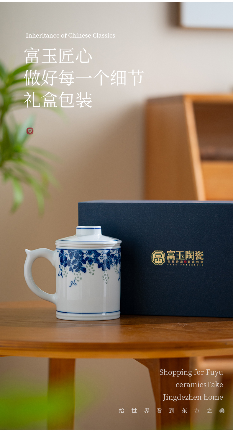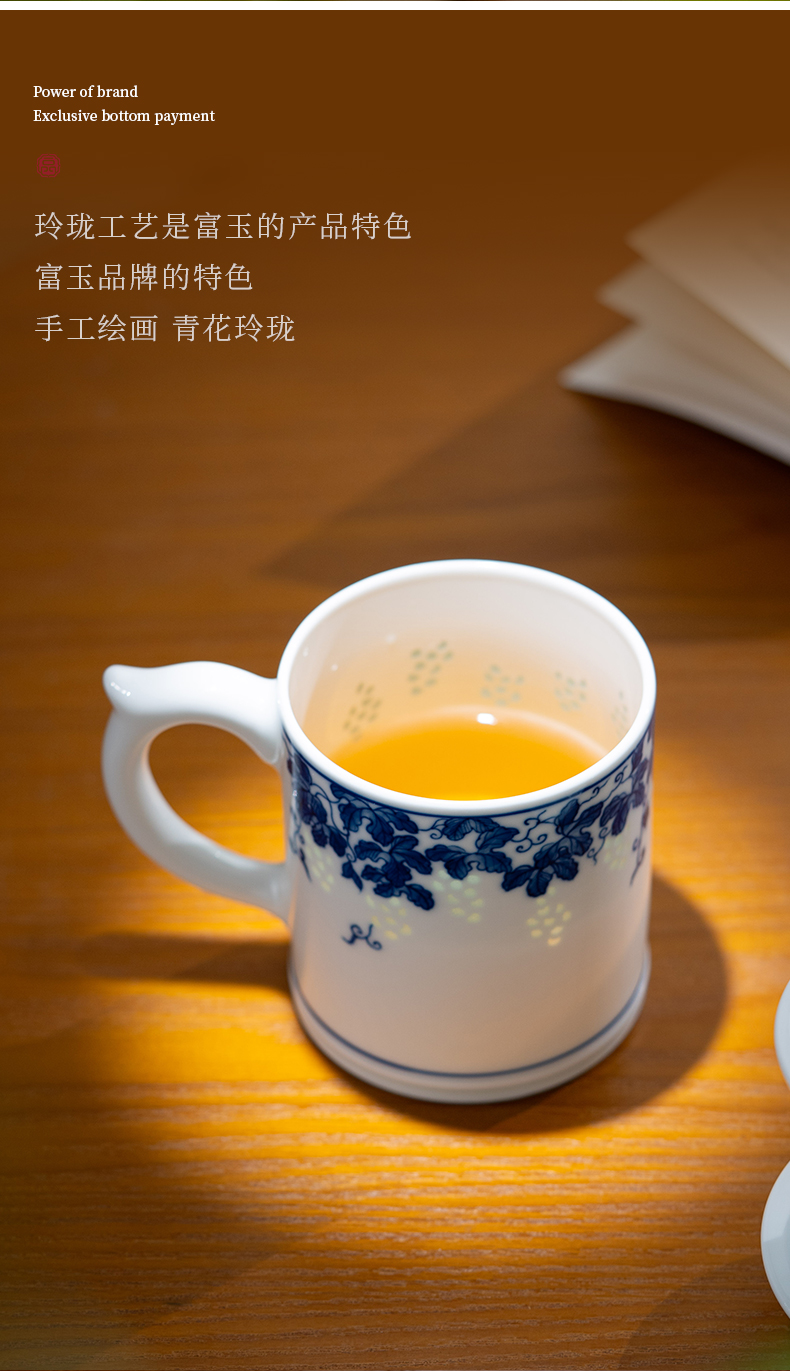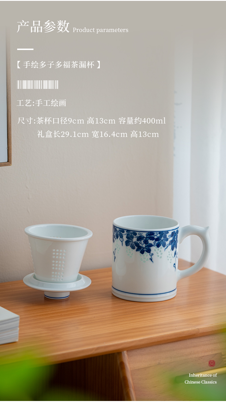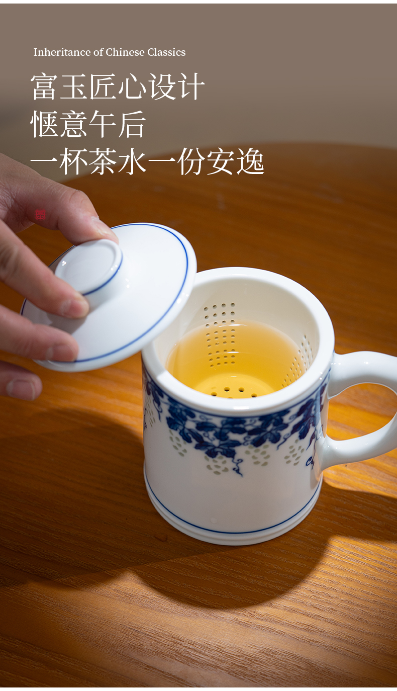 富玉 景德镇手绘青花玲珑多子多福茶漏杯家用大容量礼盒装