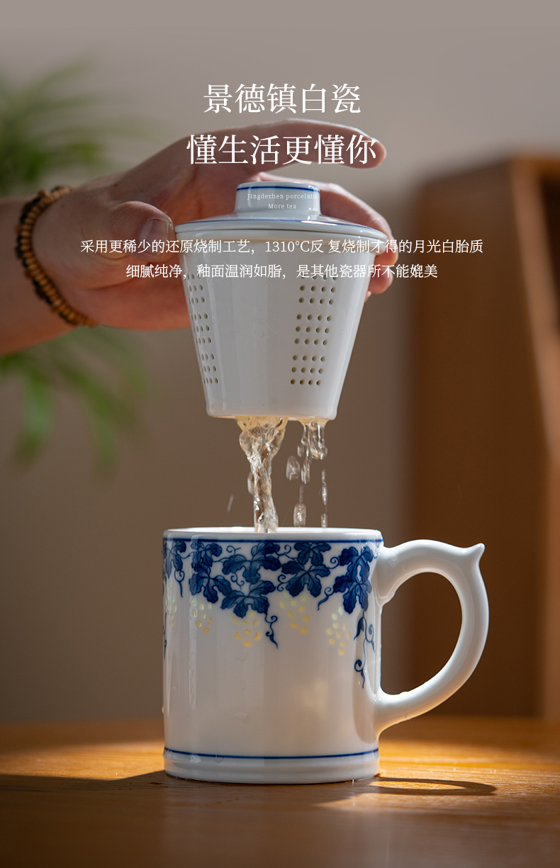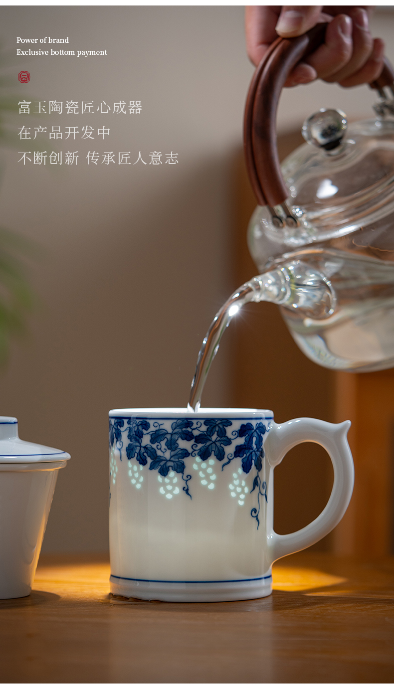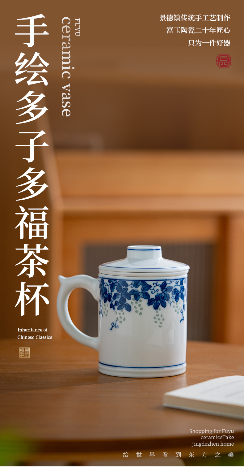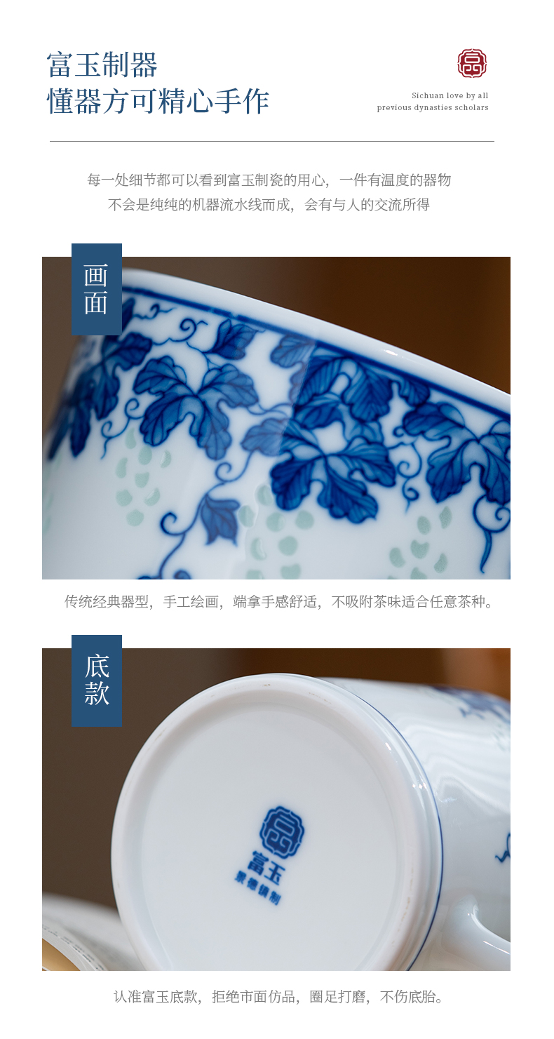 富玉 景德镇手绘青花玲珑多子多福茶漏杯家用大容量礼盒装