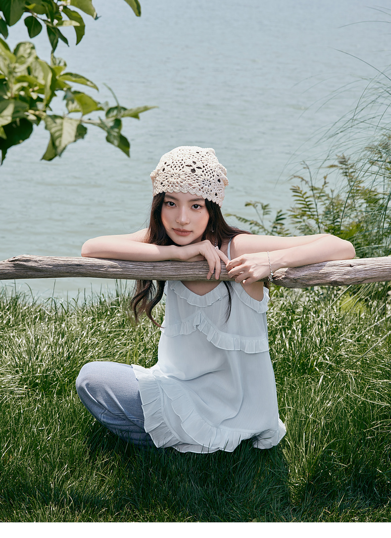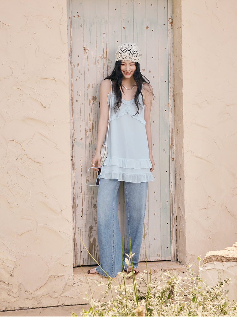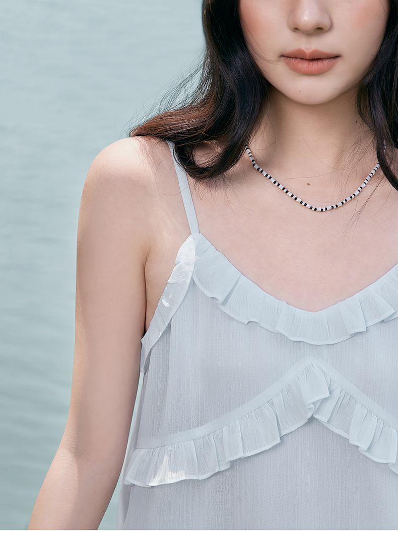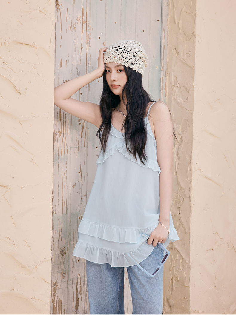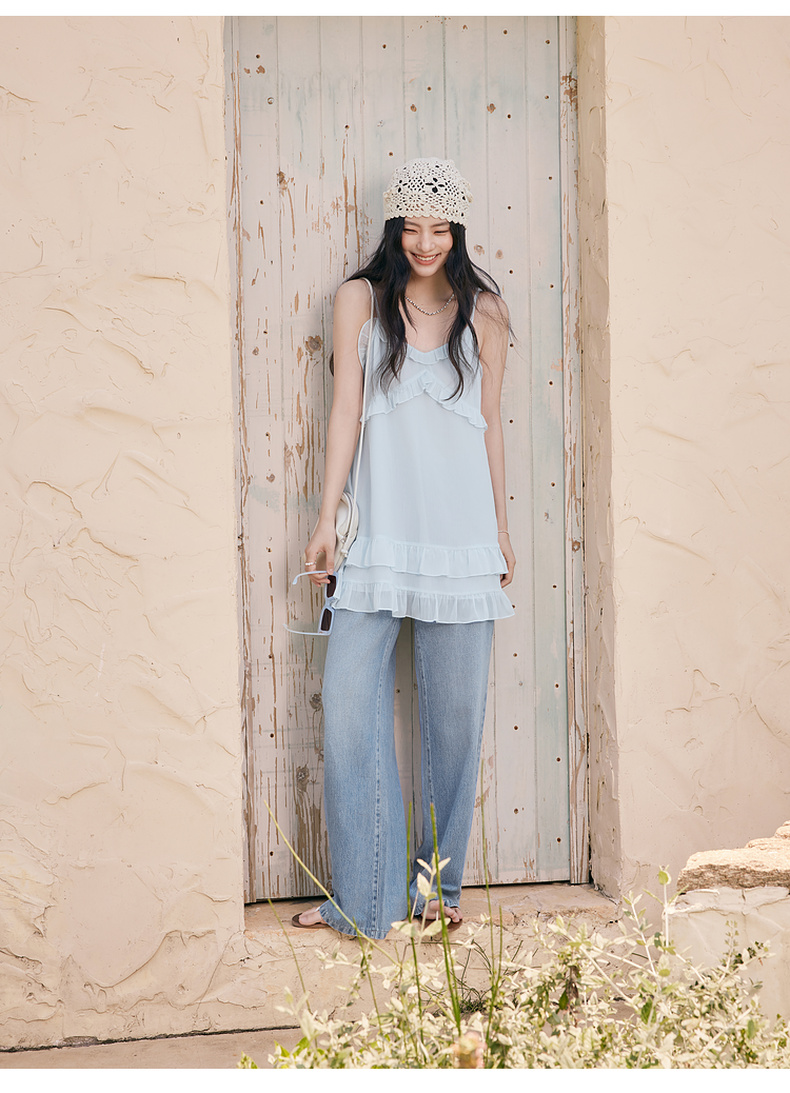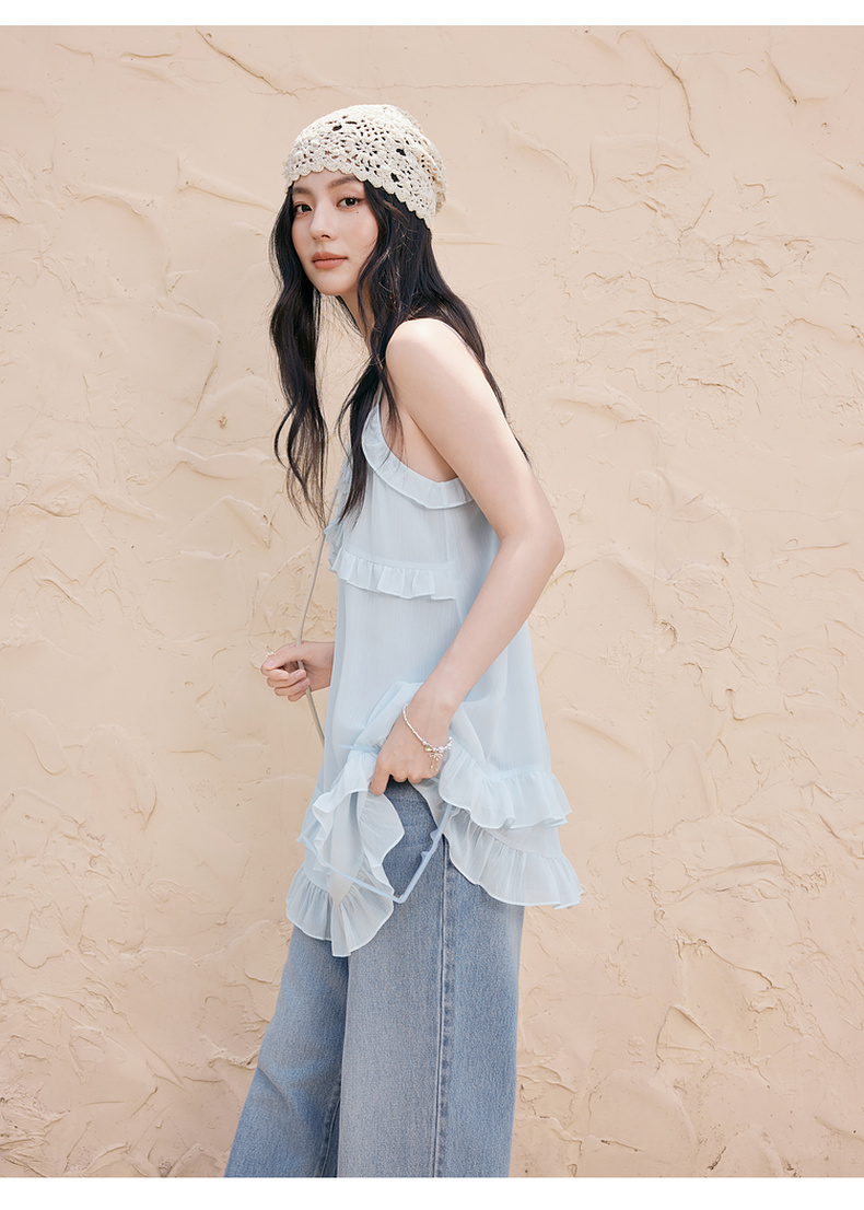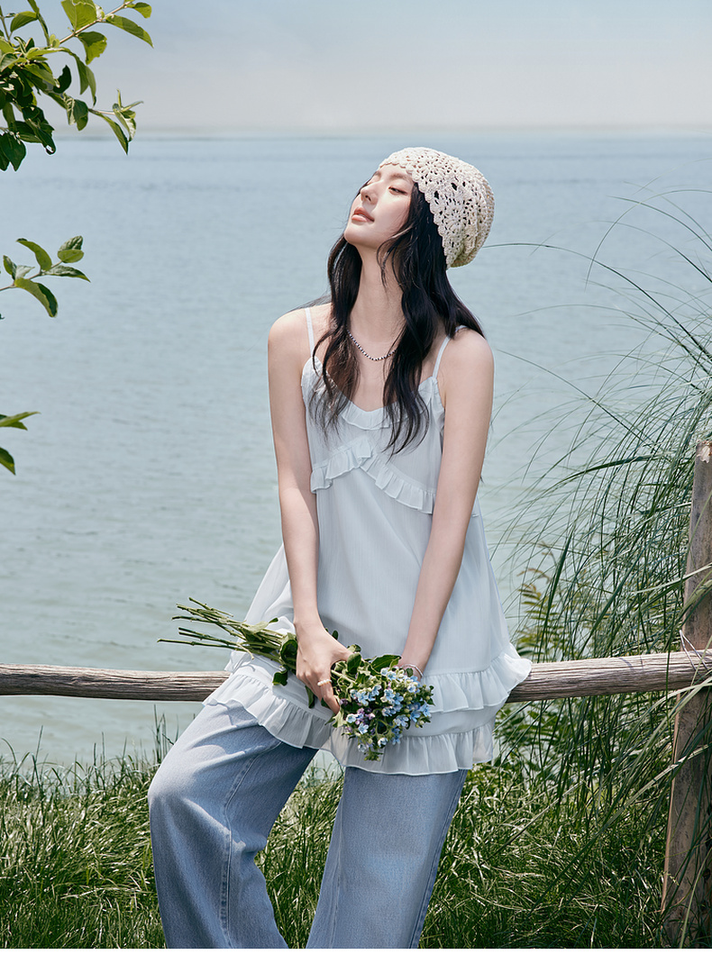 【严选】诗凡黎甜美荷叶边吊带上衣2025夏新款肌理感花边韩系气质内搭叠穿7G6220281