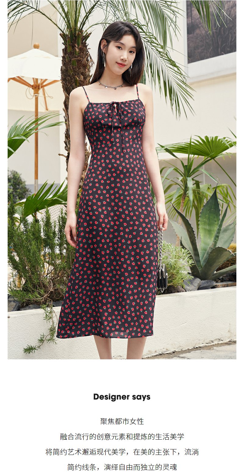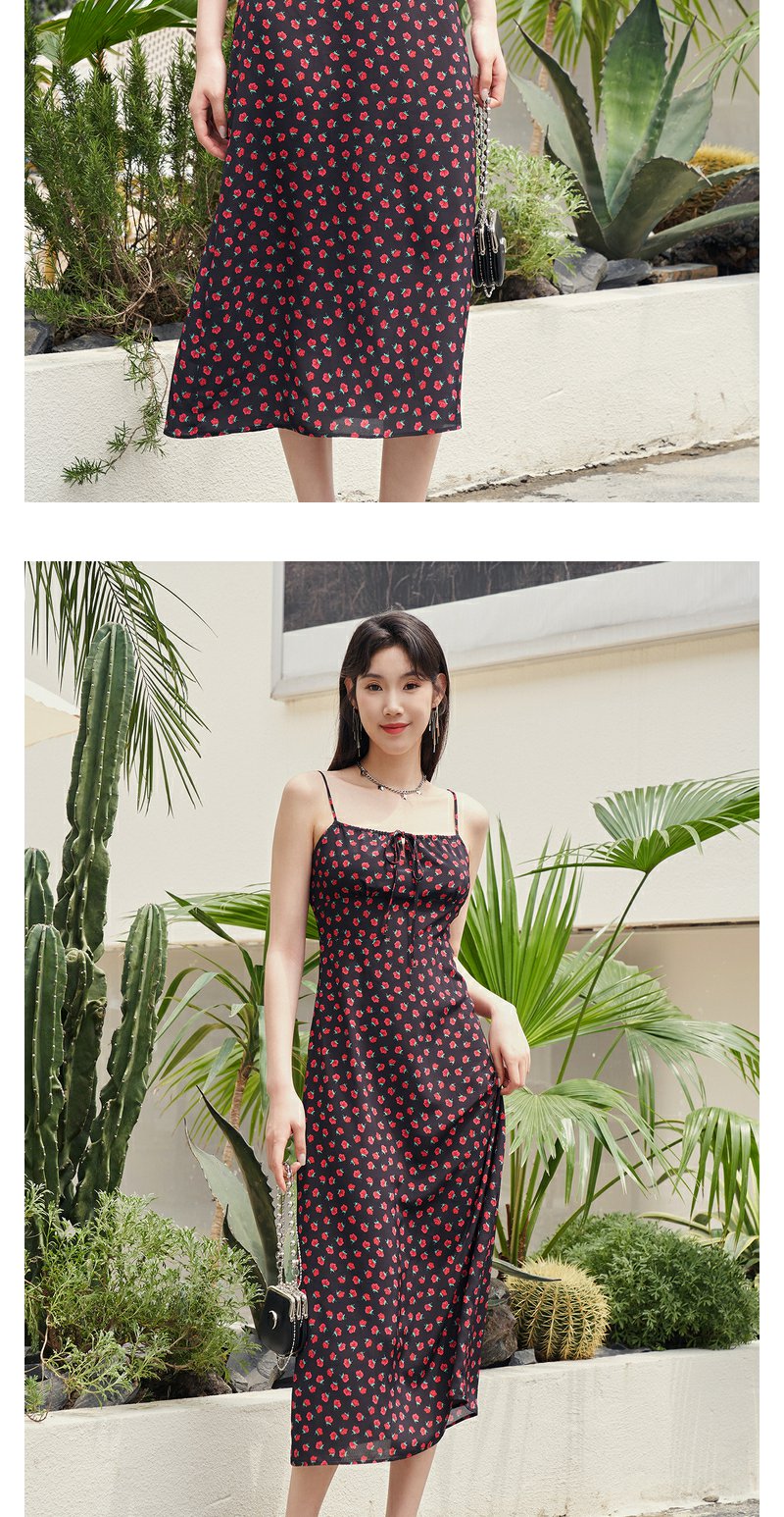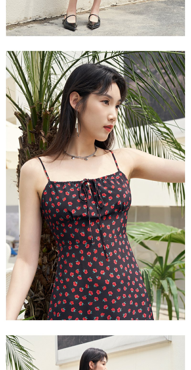 NEELLY纳俪复古黑底玫瑰碎花吊带裙女夏季新款收腰雪纺A字连衣裙N23054Y05520