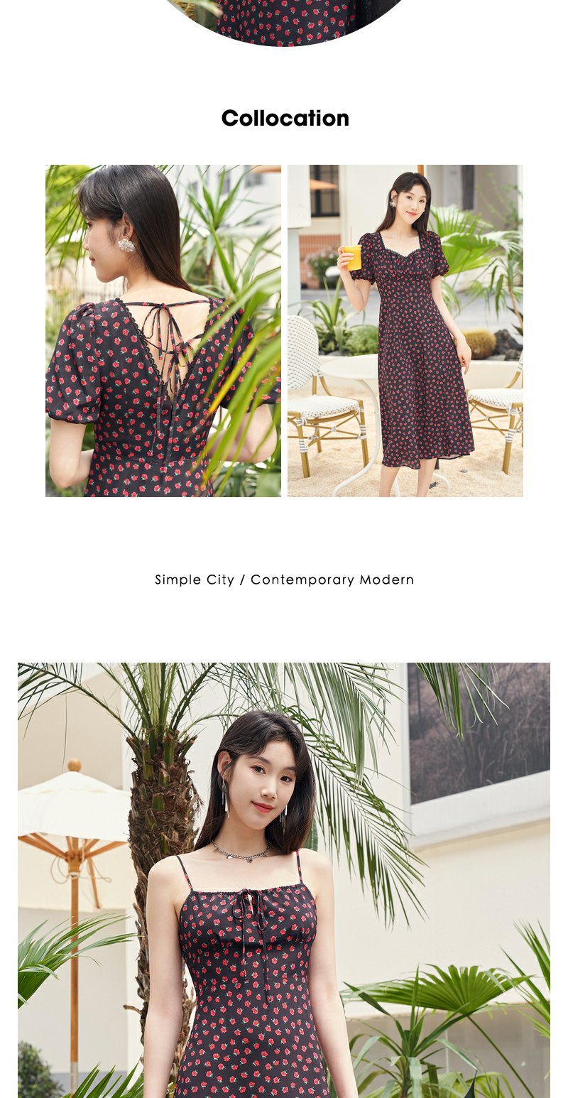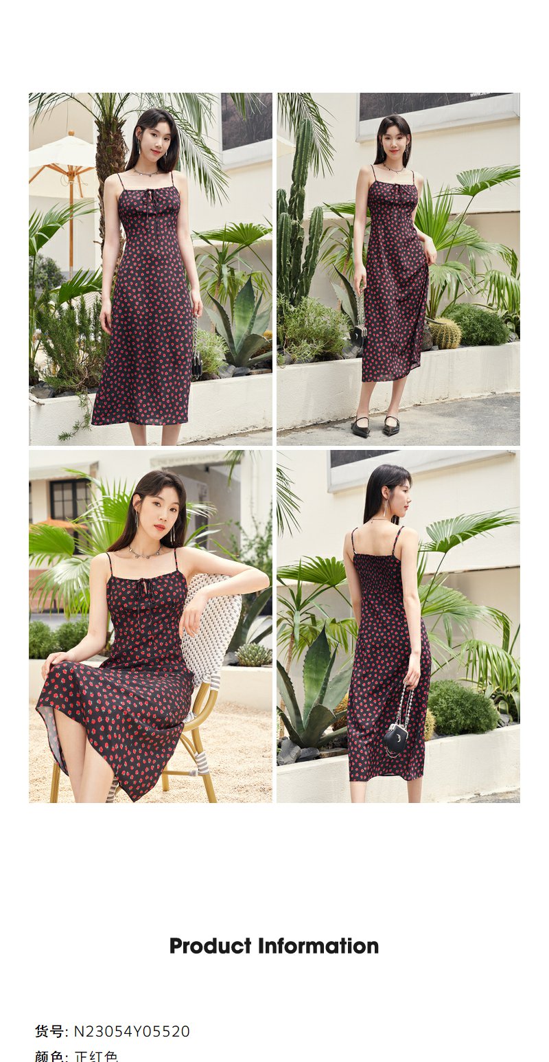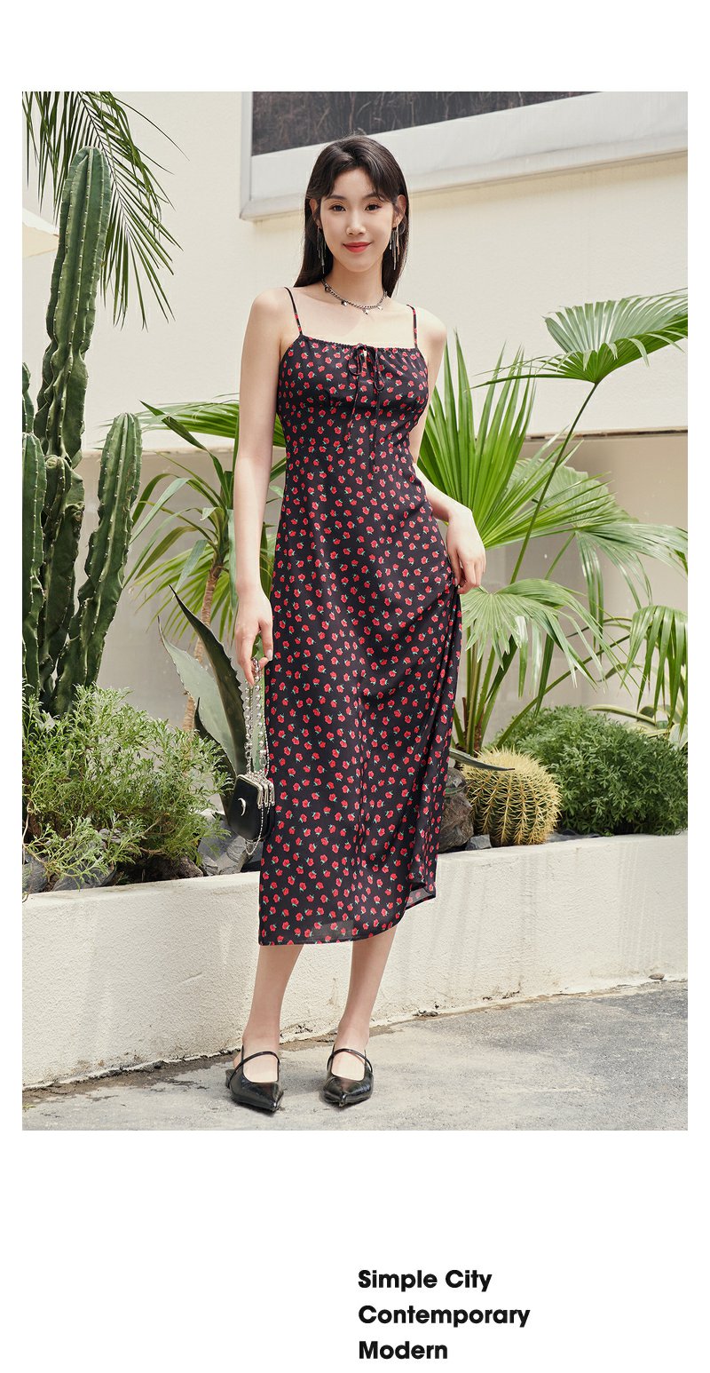 NEELLY纳俪复古黑底玫瑰碎花吊带裙女夏季新款收腰雪纺A字连衣裙N23054Y05520