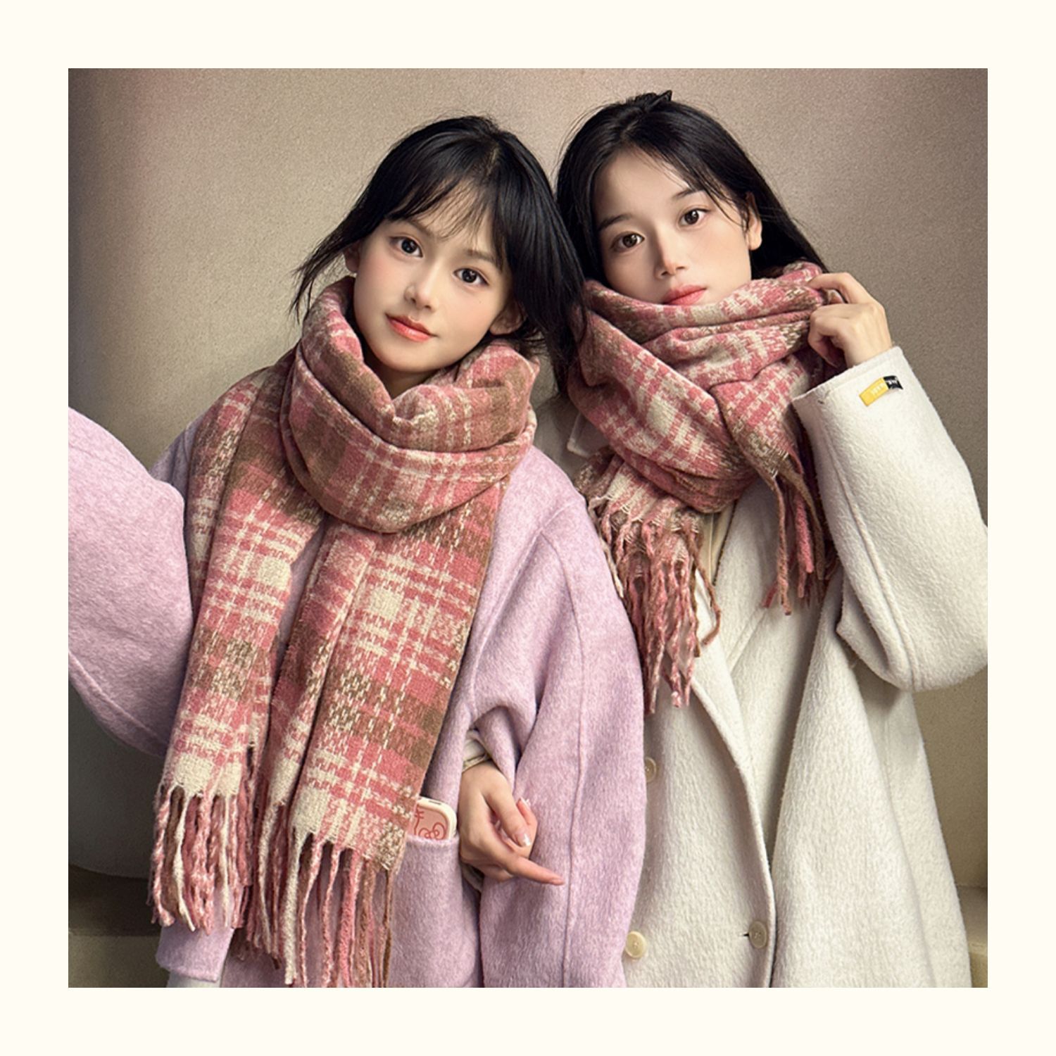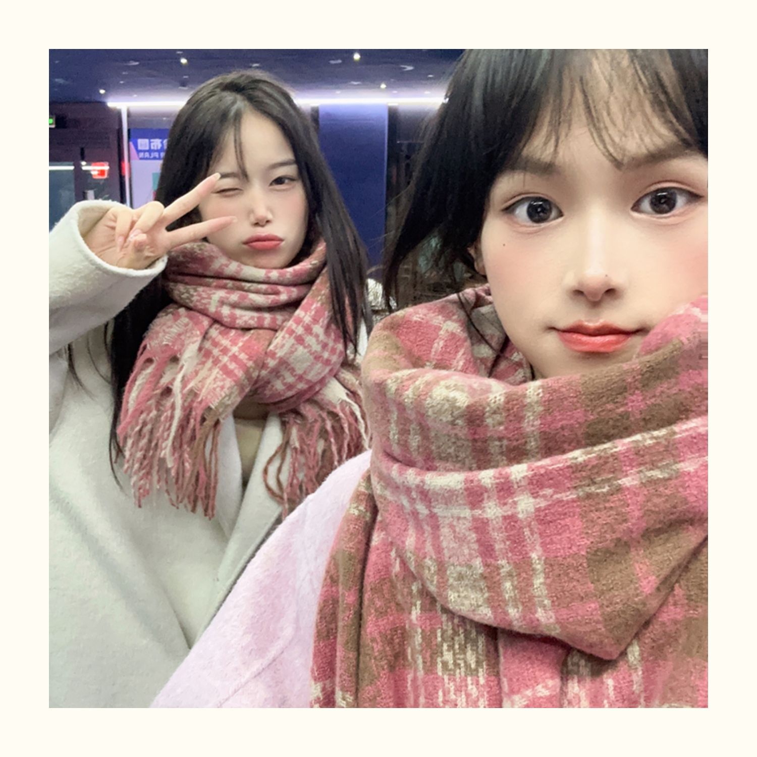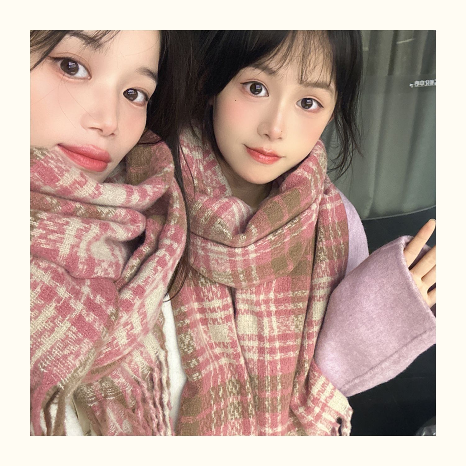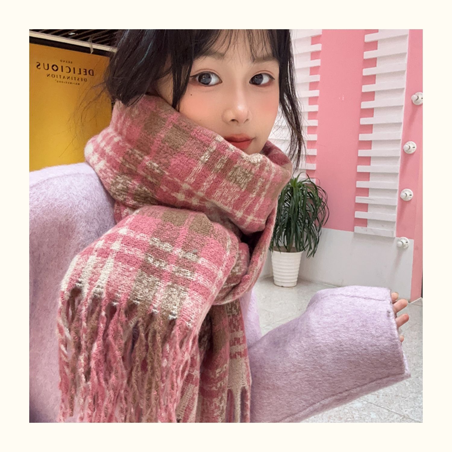 【软软糯糯】韩版格子女韩系甜美保暖提花粉秋冬柔软流苏粉色格子围巾围脖。ry