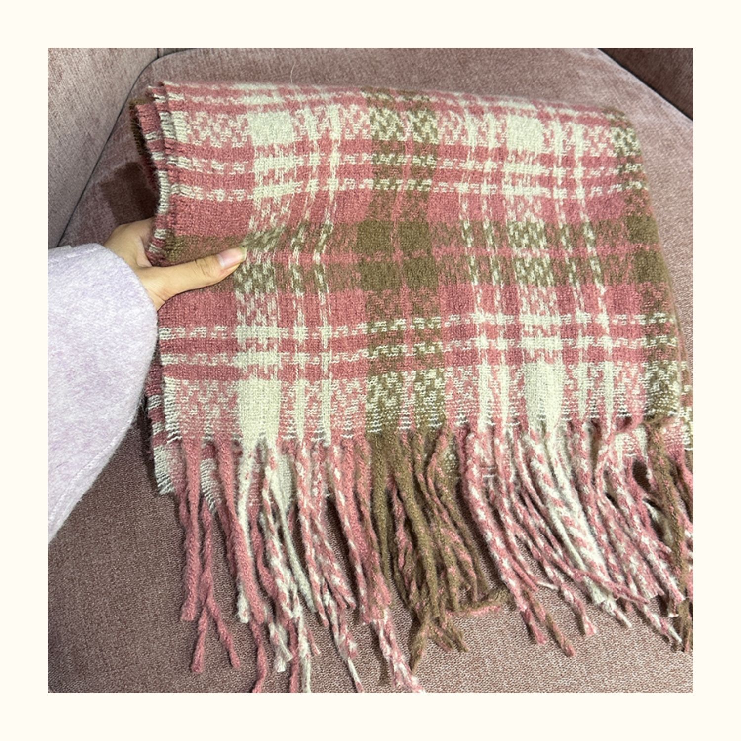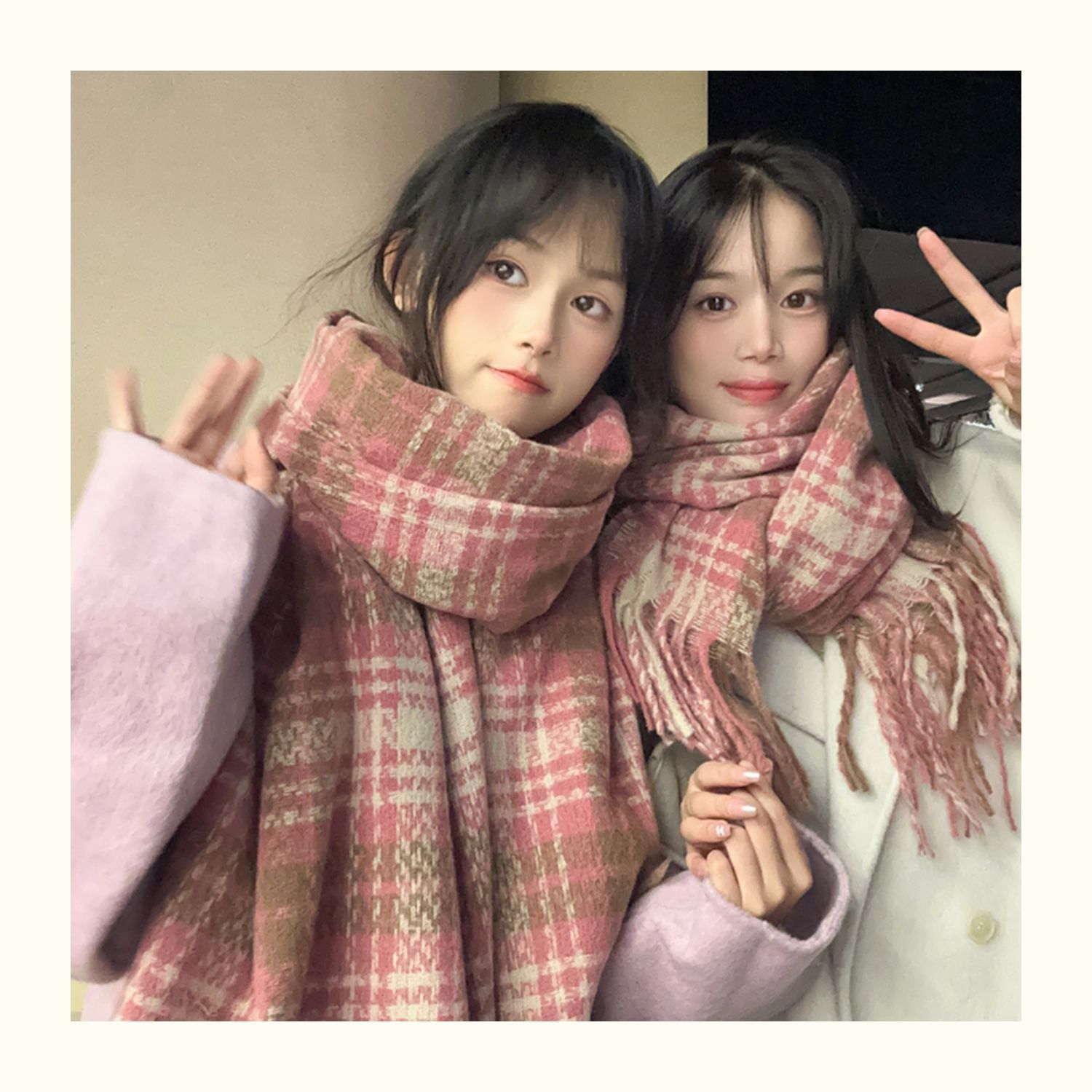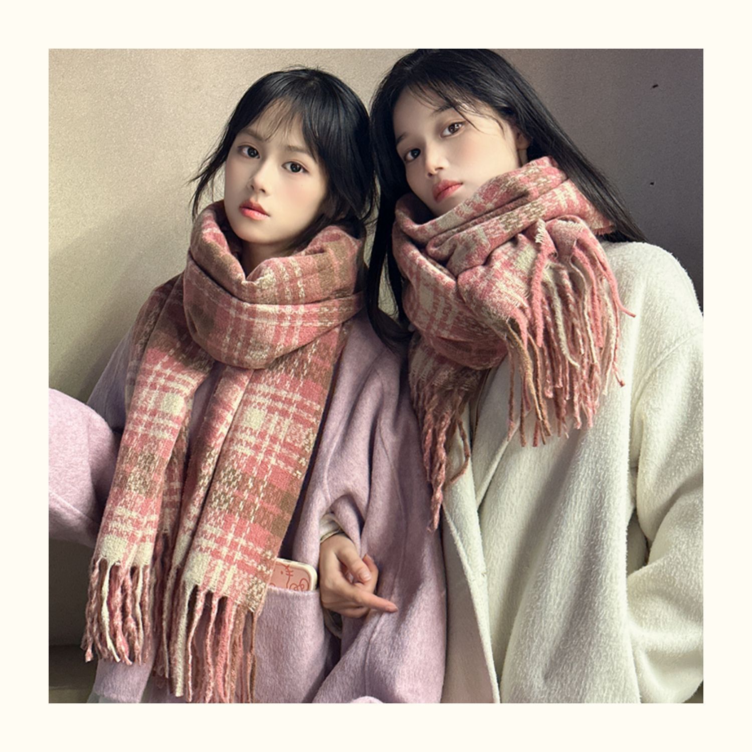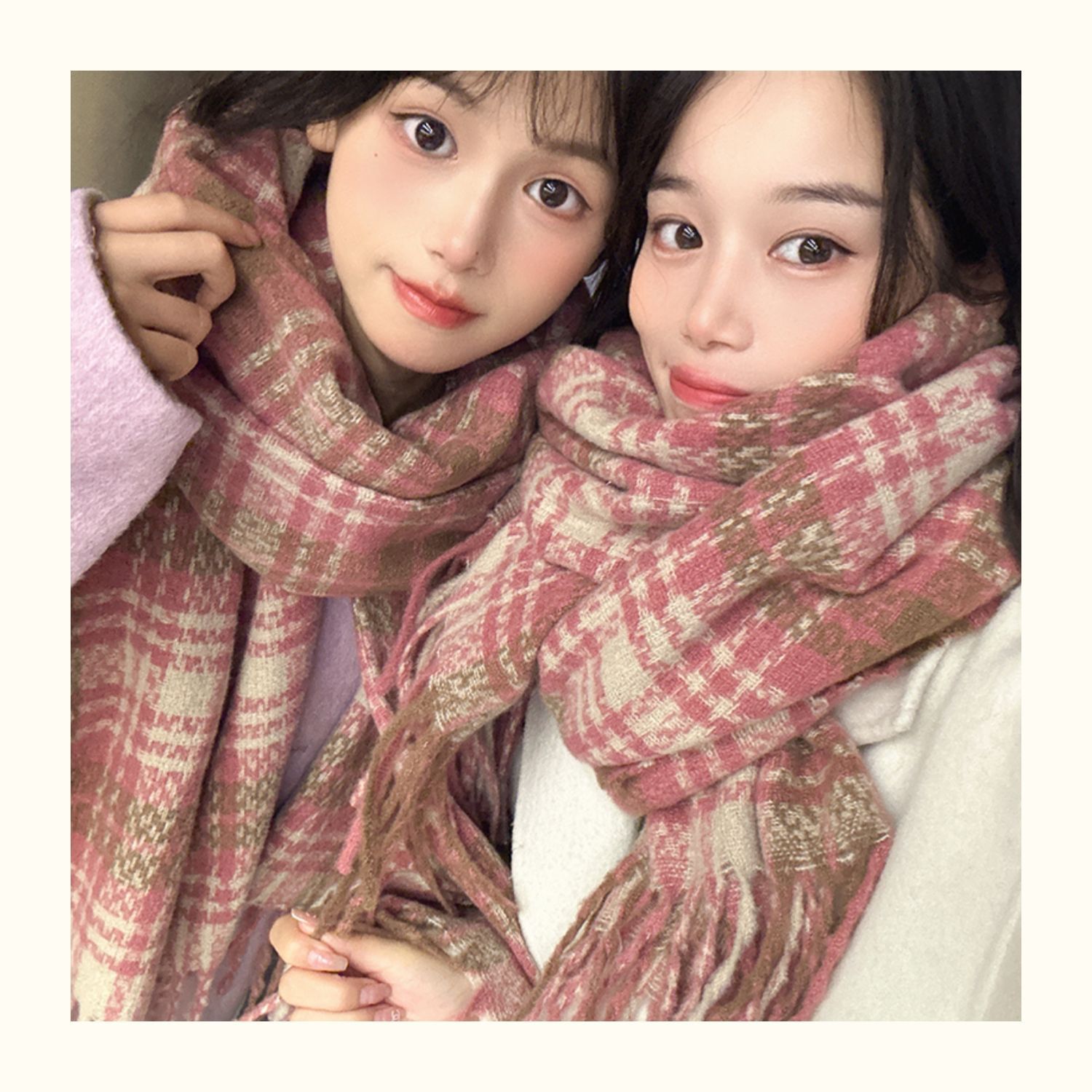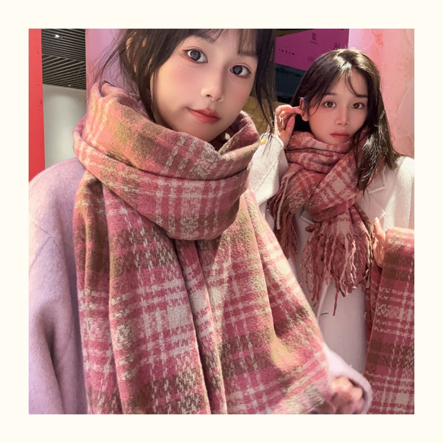 【软软糯糯】韩版格子女韩系甜美保暖提花粉秋冬柔软流苏粉色格子围巾围脖。ry