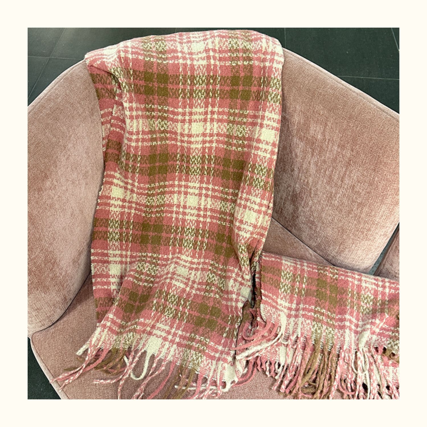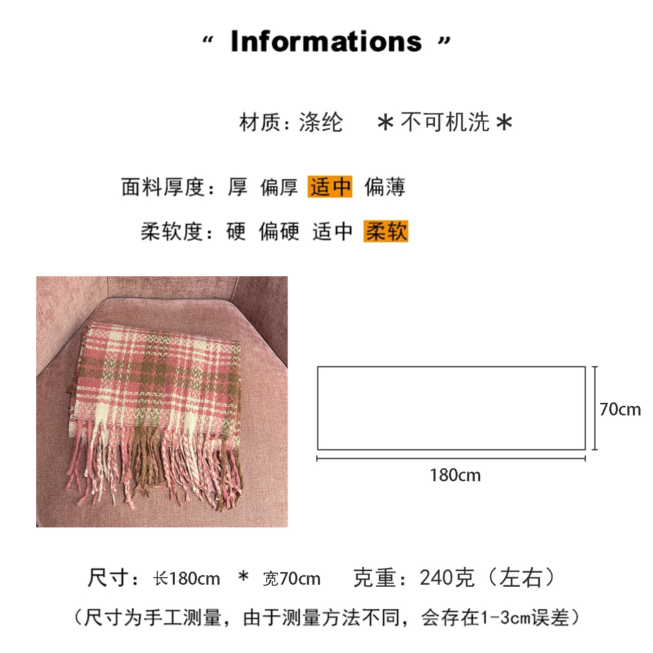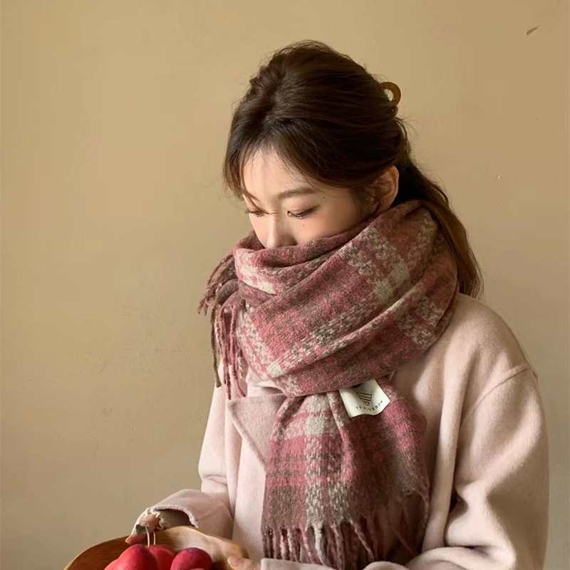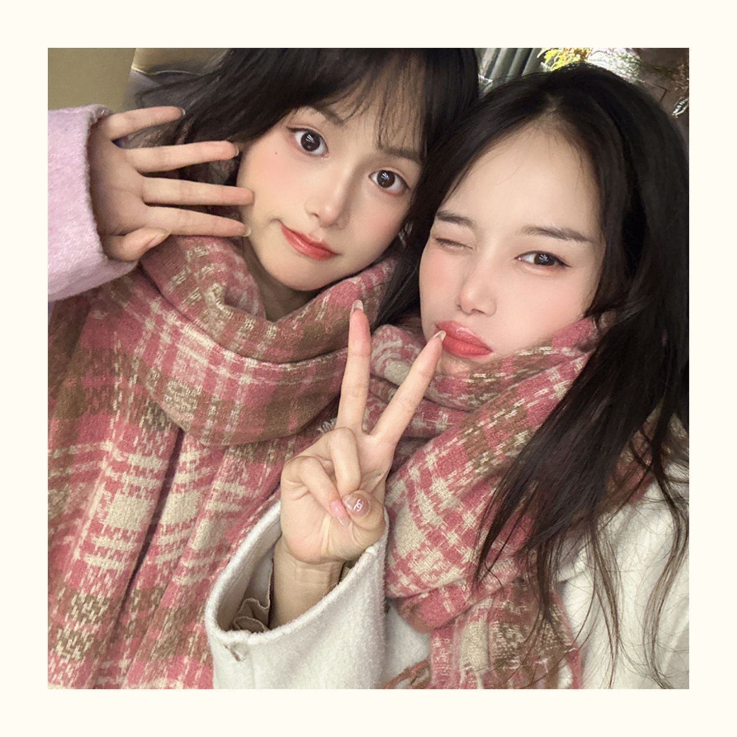 【软软糯糯】韩版格子女韩系甜美保暖提花粉秋冬柔软流苏粉色格子围巾围脖。ry
