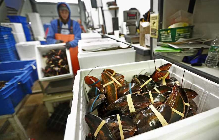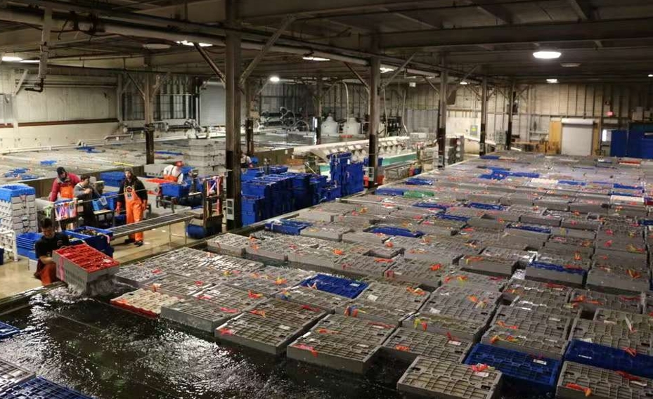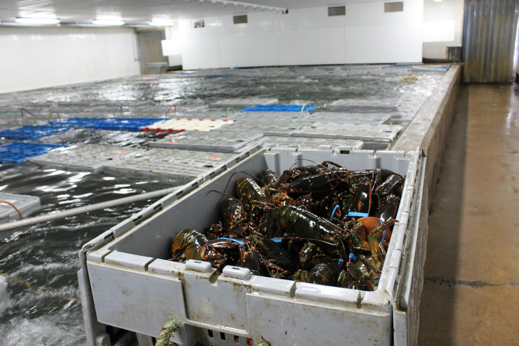 捕捞上岸的龙虾被放入暂养池等待检验。