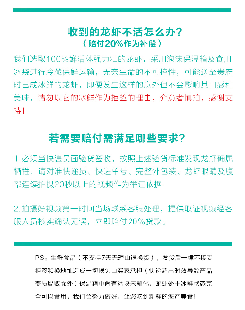 1、由于生鲜产品的特殊性,我们强烈建议客户在收到货后当快递面开箱验货,有任何产品质量问题,第一时间联系我们的客服,我们会帮您处理退款或者补发事宜;货物外包装不影响龙虾本身品质,以实际到货为准。