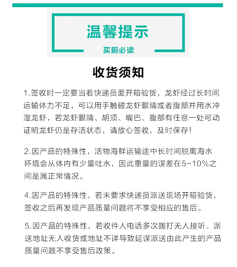 a、收货地址确保48小时内有人收货,且保持收货人手机畅通,由于龙虾是活物,因手机打不通或关机联系不上收货人造成延误收货,龙虾死亡产生的质量问题由客户承担