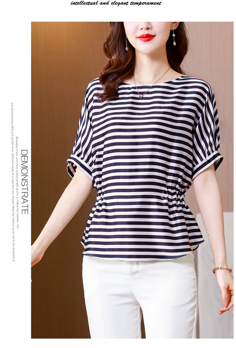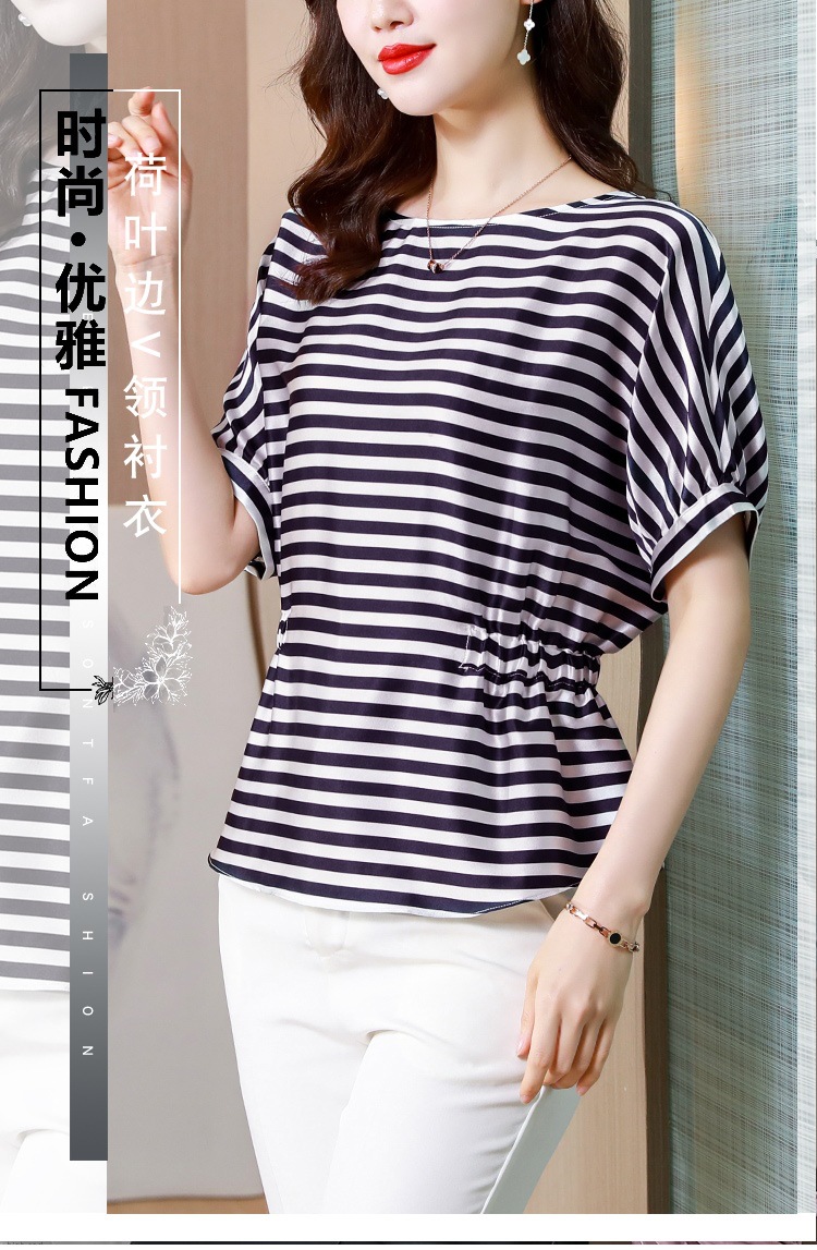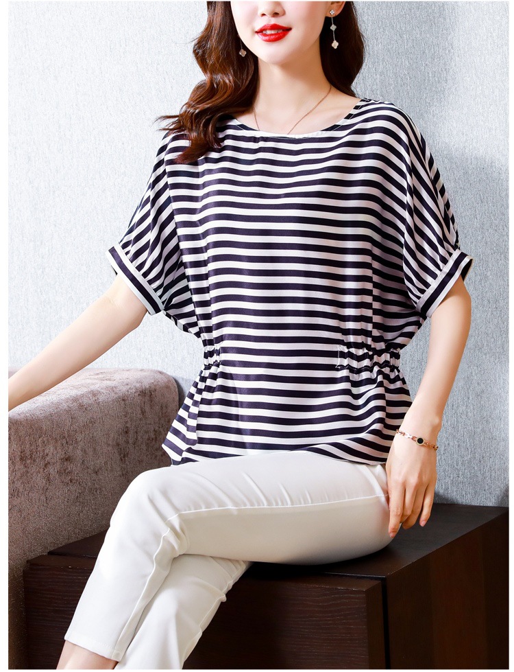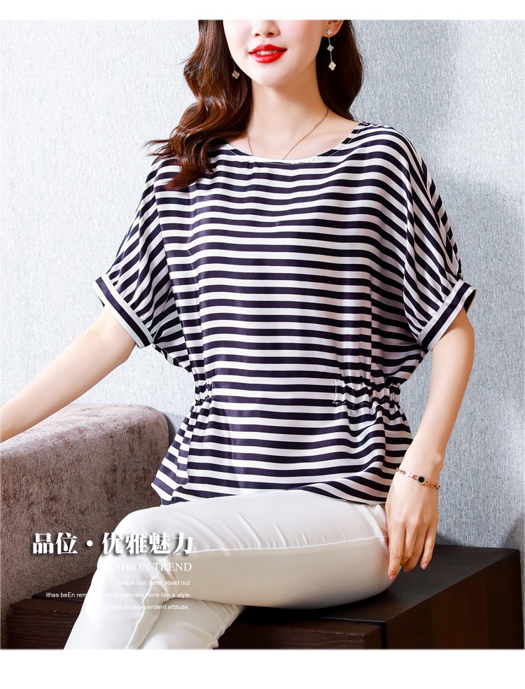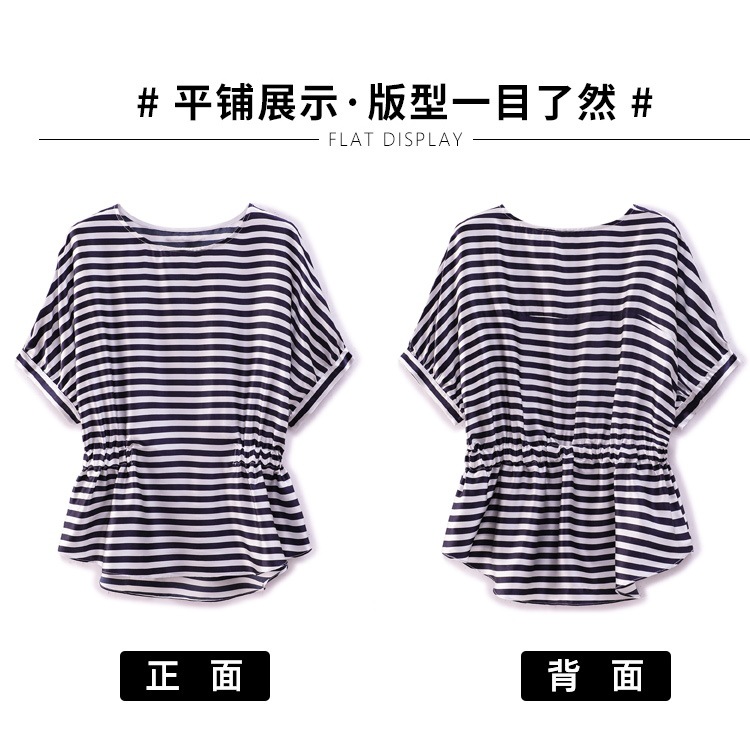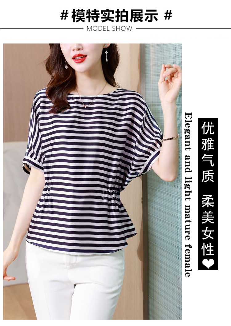 重磅缎面仿真丝T恤,新款夏休闲蝙蝠袖修身条纹短袖上衣KQL-B43N8133