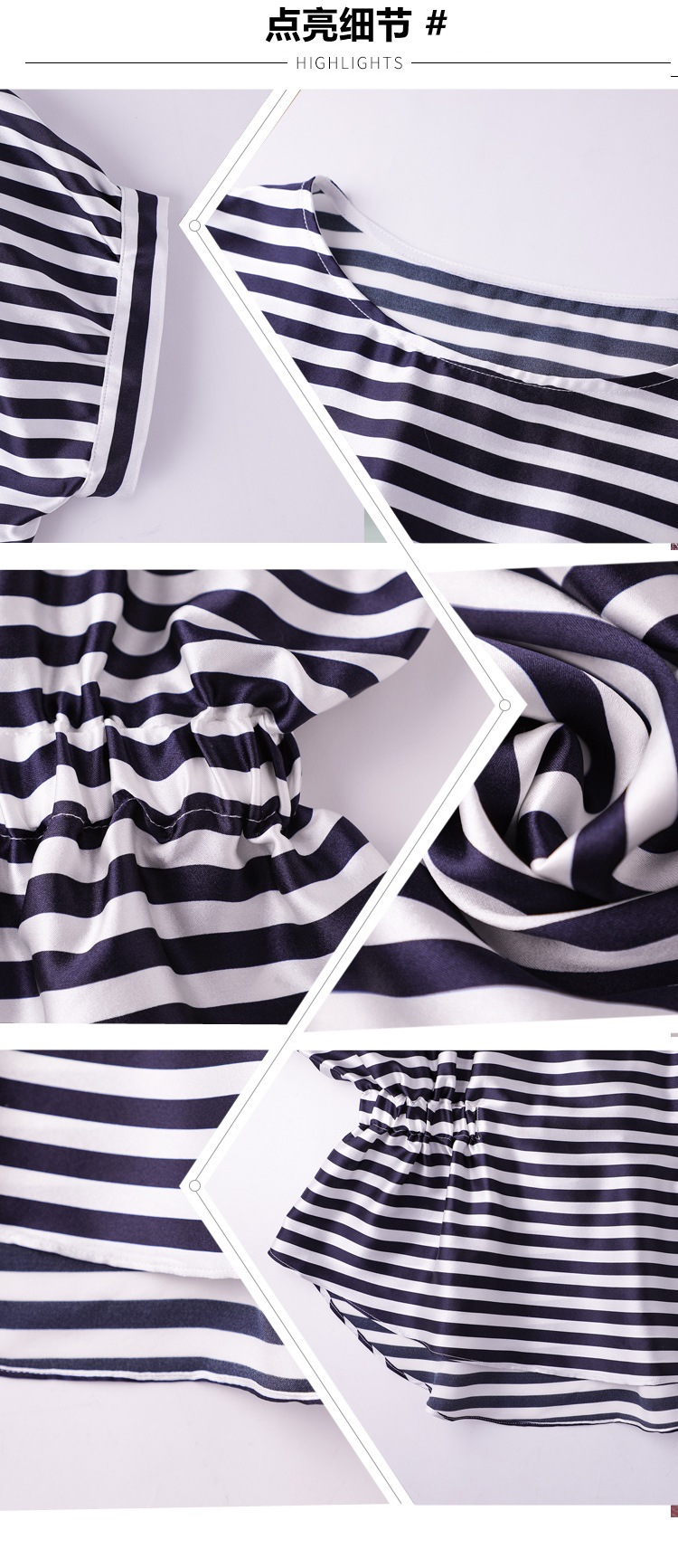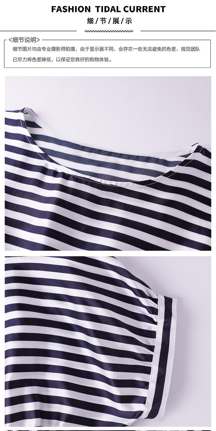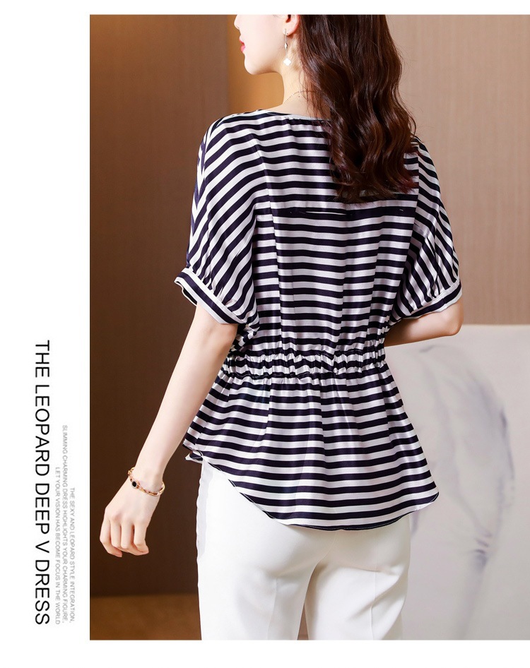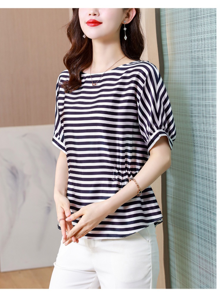 重磅缎面仿真丝T恤,新款夏休闲蝙蝠袖修身条纹短袖上衣KQL-B43N8133