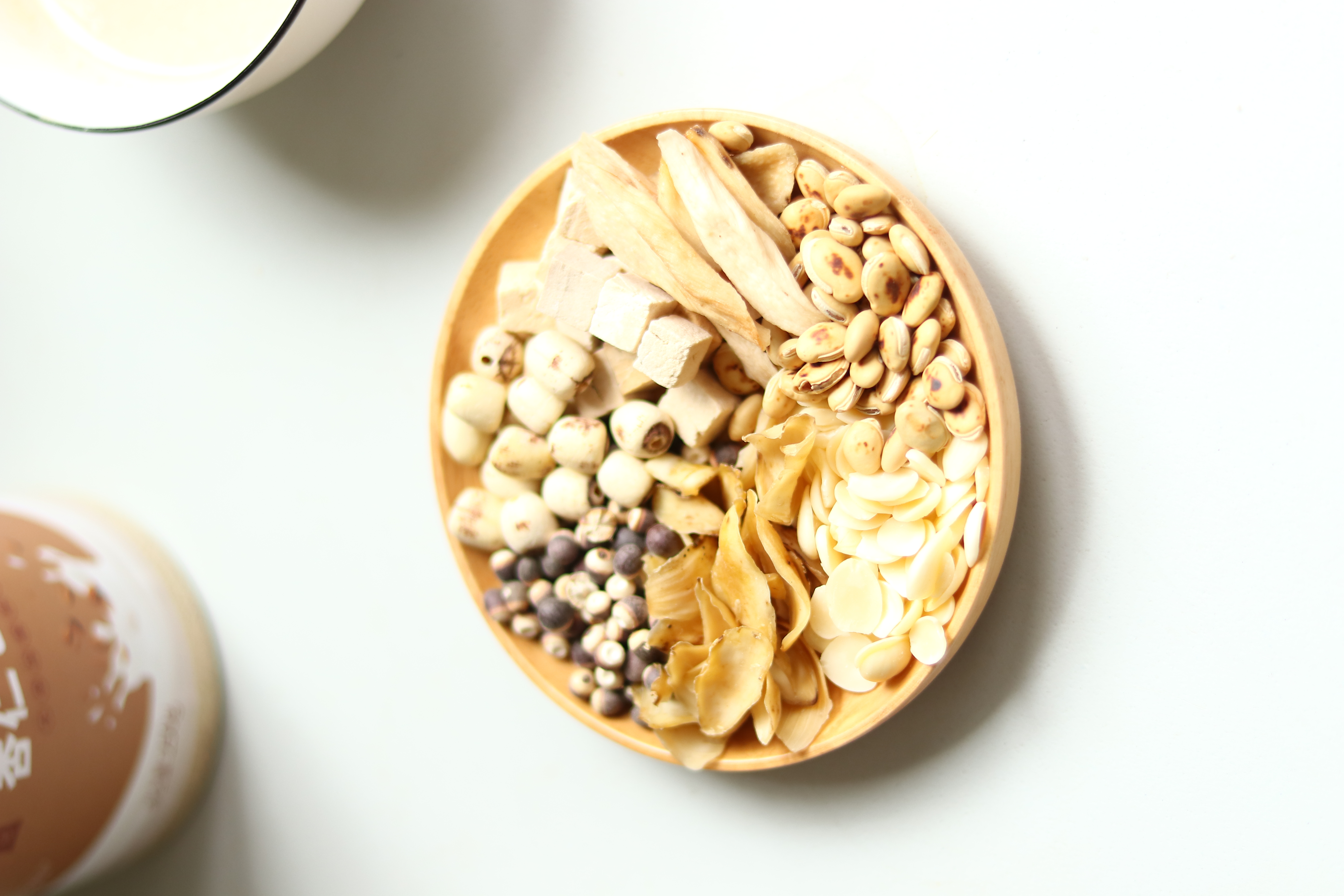 配料表:杏仁、铁棍怀山药、百合、白扁豆、茯苓、莲子、芡实。